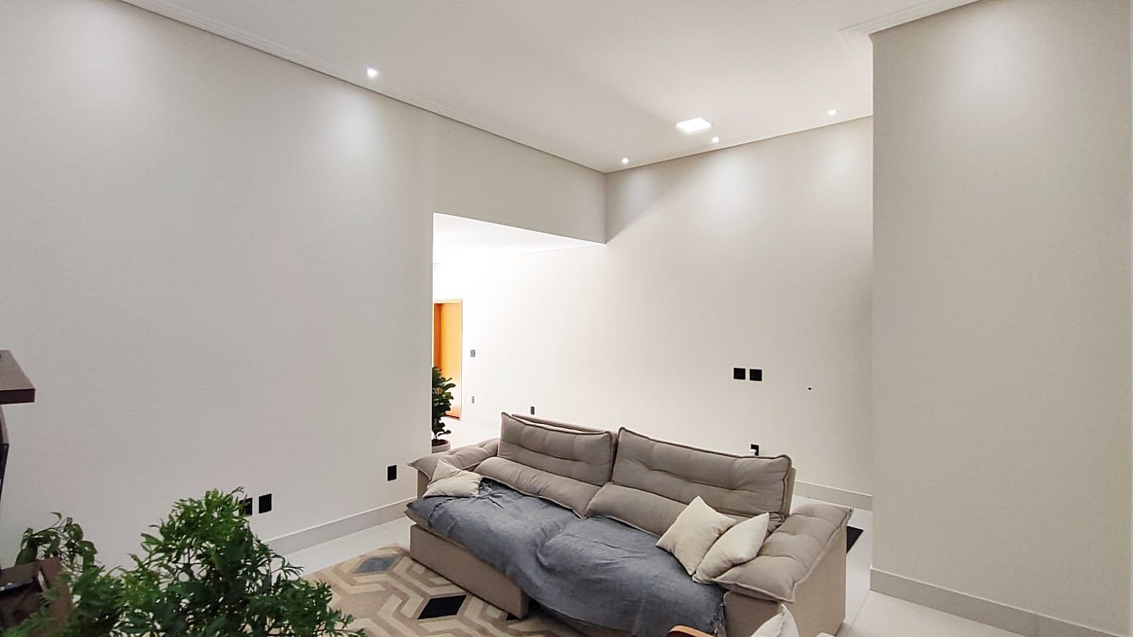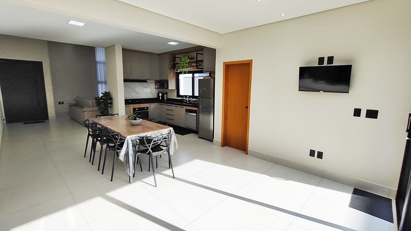 Conta com salas de estar e jantar integradas, cozinha funcional, lavabo, banheiro social e garagem para 4 veículos, sendo 2 vagas cobertas.