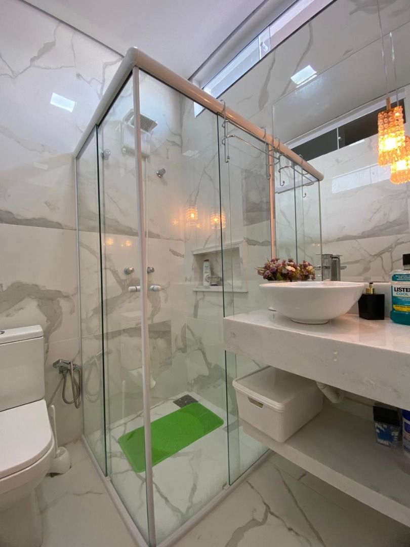 Delicadamente decorada, a ampla cozinha é perfeita para quem ama cozinhar, equipada com planejados e integrada a uma área de luz, tornando-se o coração da casa. O imóvel ainda conta com confortável espaço gourmet com churrasqueira a carvão, lavabo externo, piscina com cascata e aconchegante espaço gramado.