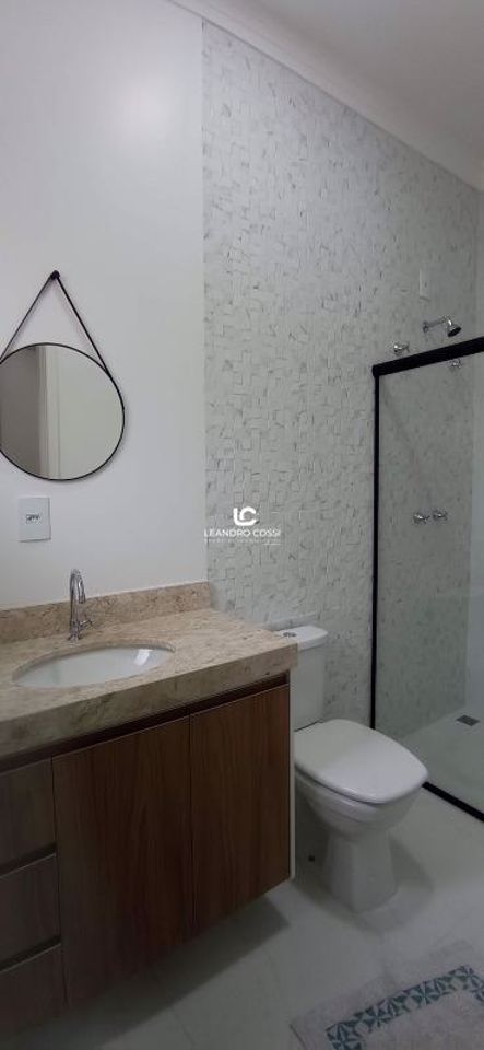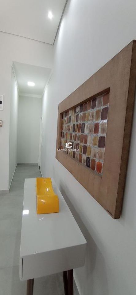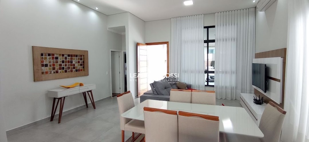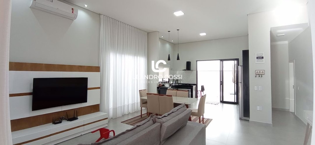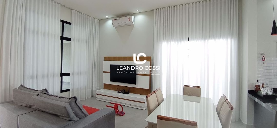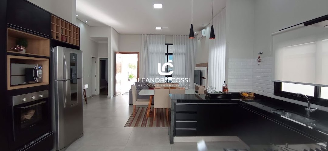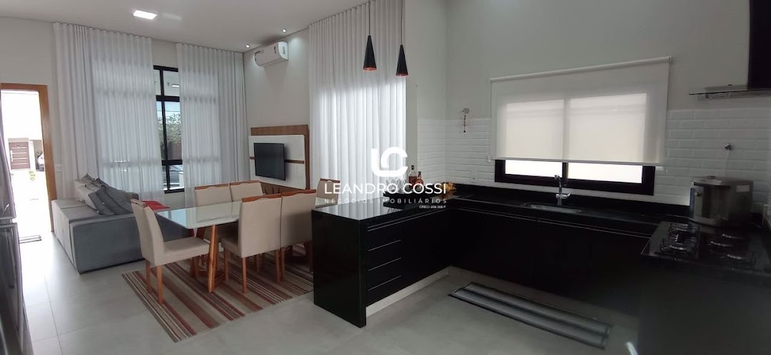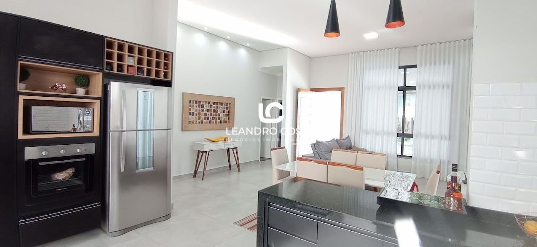 A casa dispõe de 3 suítes, além de sala de estar e jantar com pé direito alto, em um conceito integrado que valoriza amplitude e conexão entre os espaços. Conta também com cozinha americana, lavanderia, espaço gourmet com churrasqueira e quintal.