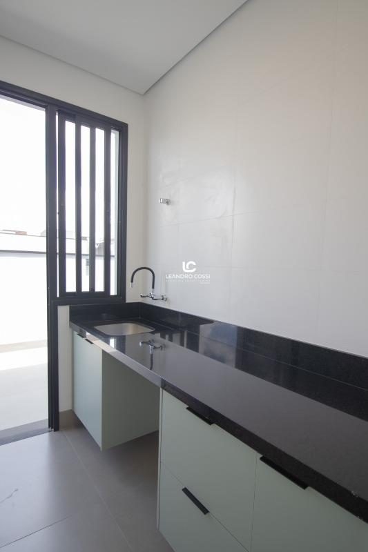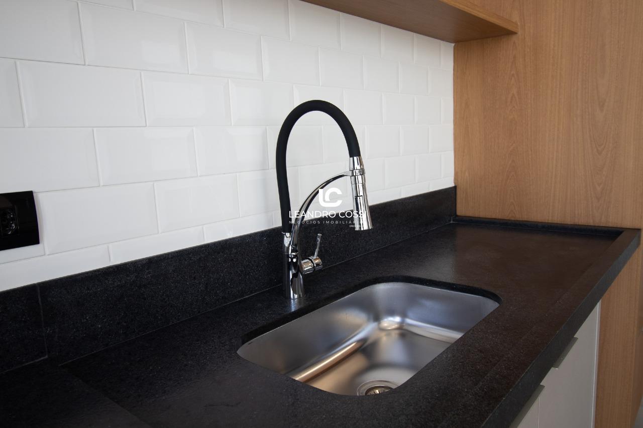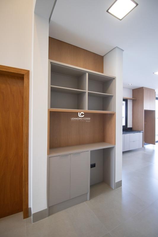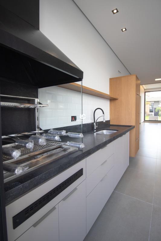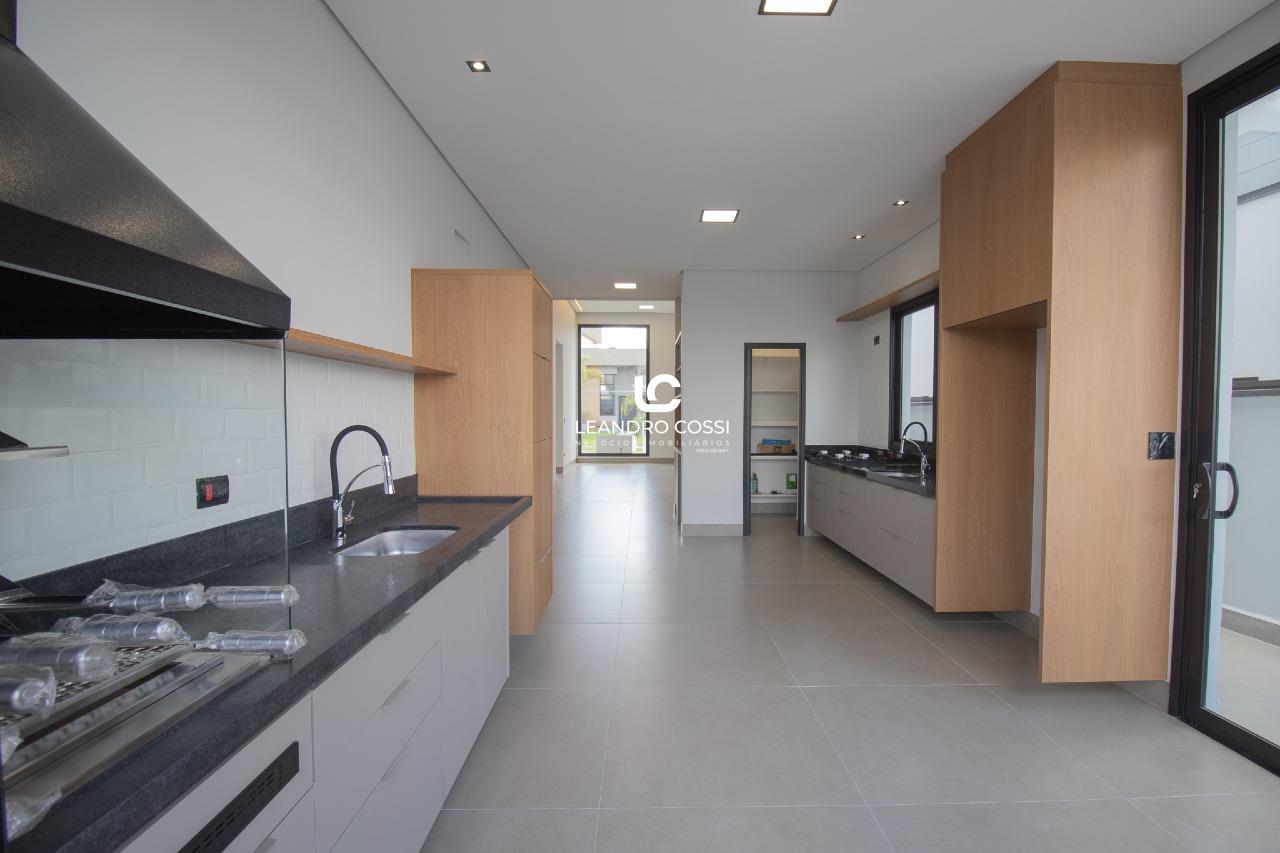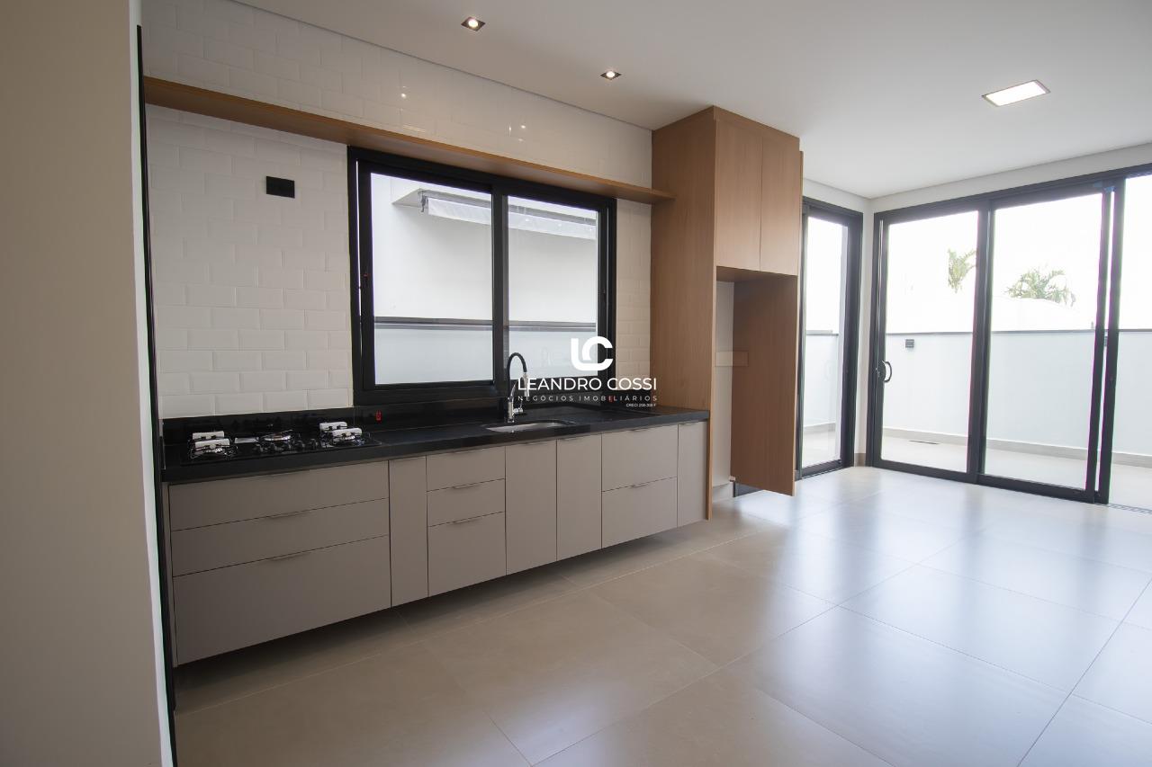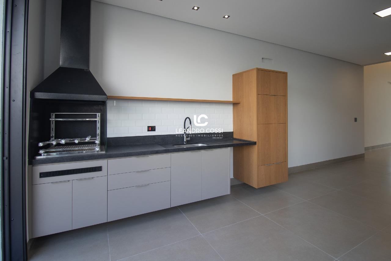 A área social apresenta sala com pé-direito alto, com possibilidade de divisão entre sala de jantar e sala social ou home. A cozinha é integrada e equipada com cristaleira instalada, bancada em granito, armários planejados e cooktop. O espaço gourmet é completo, com churrasqueira, armários planejados e bancada em granito escovado, ideal para momentos de convivência.