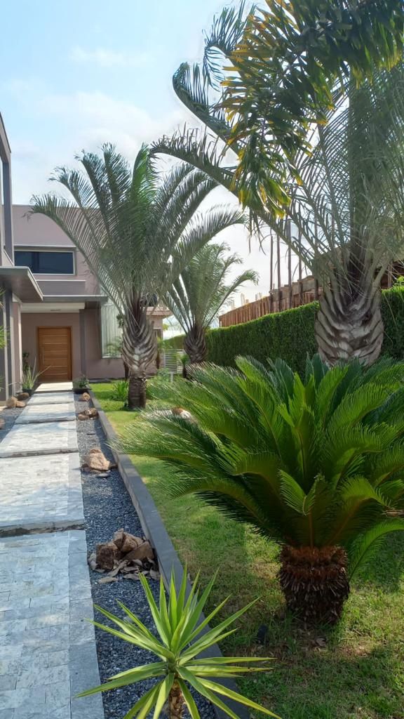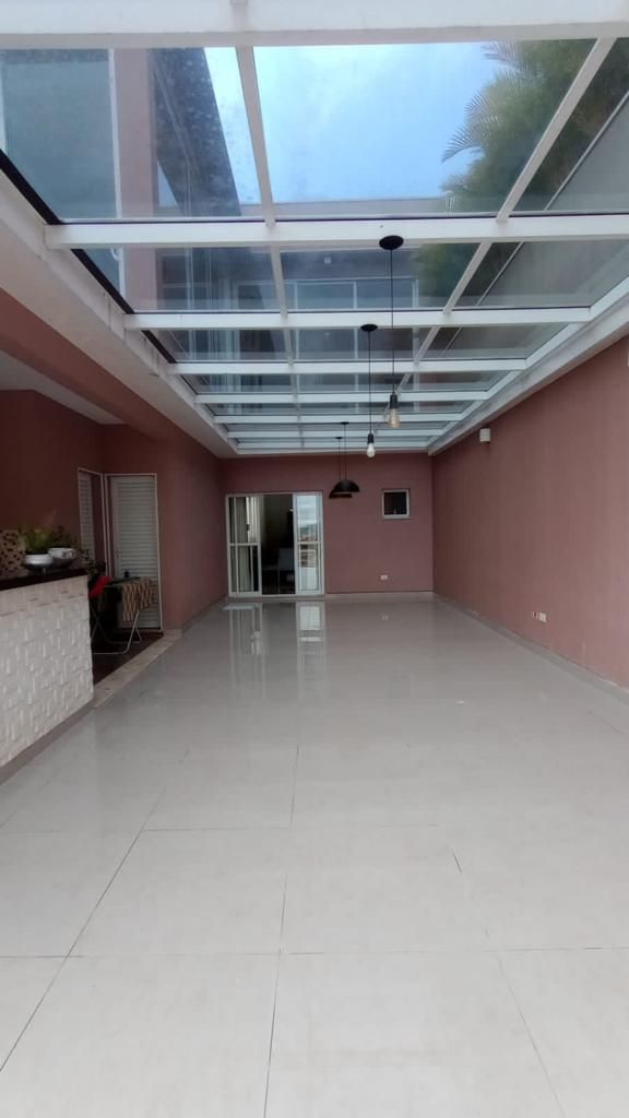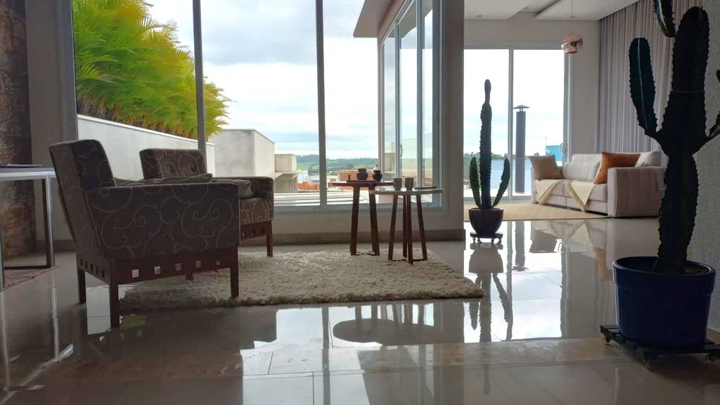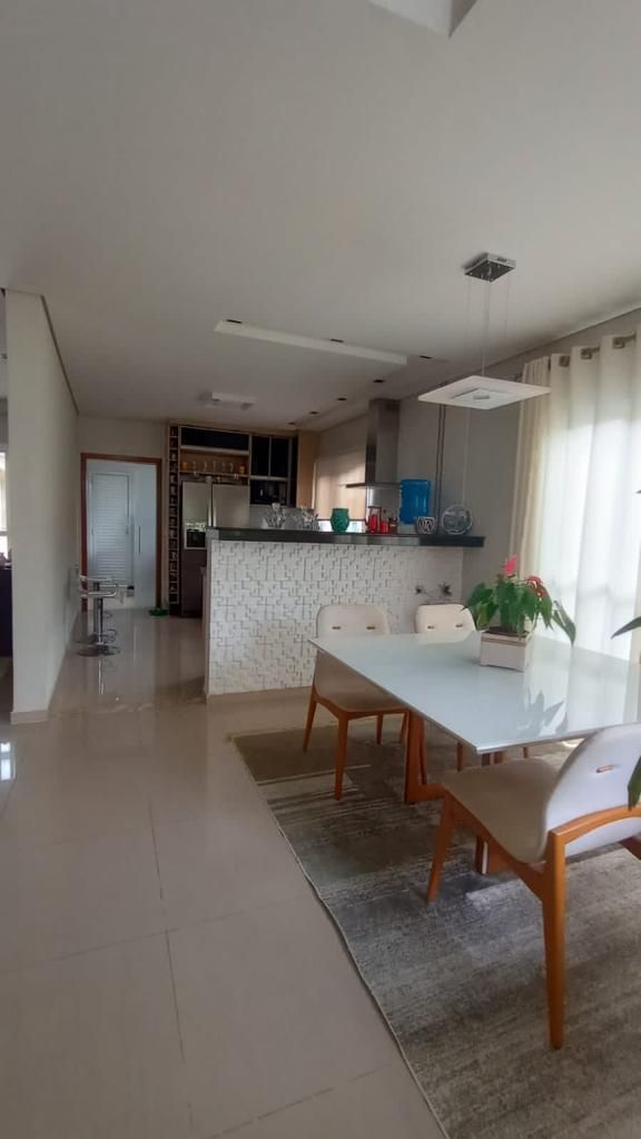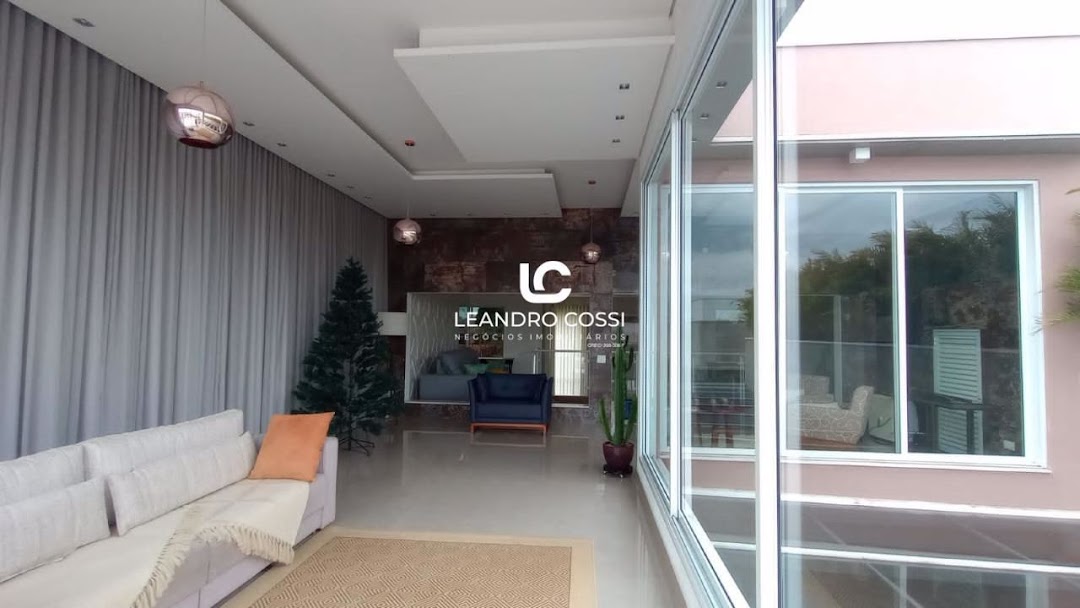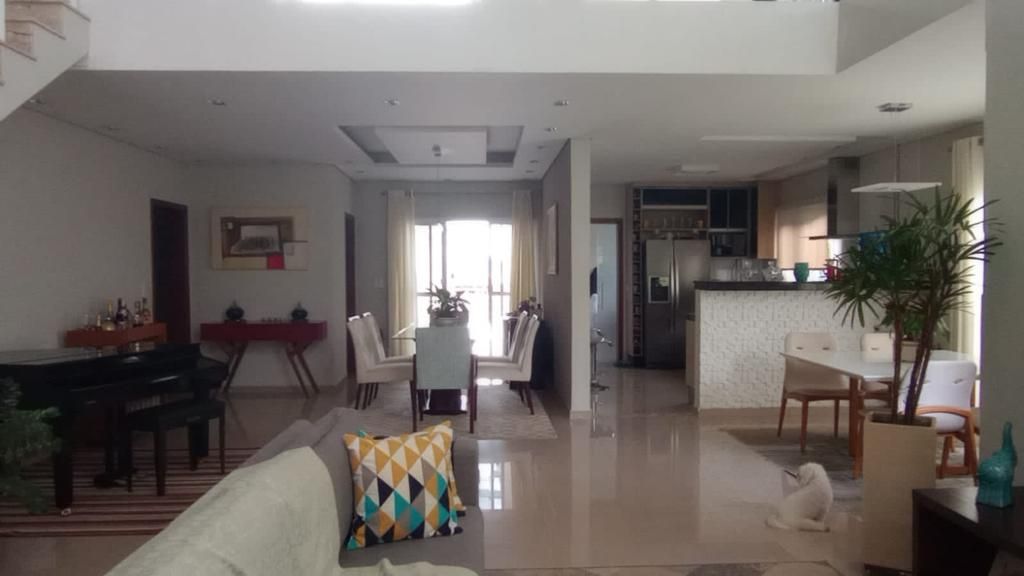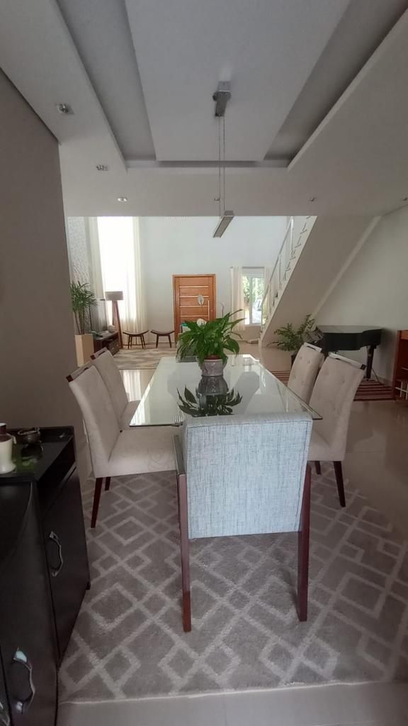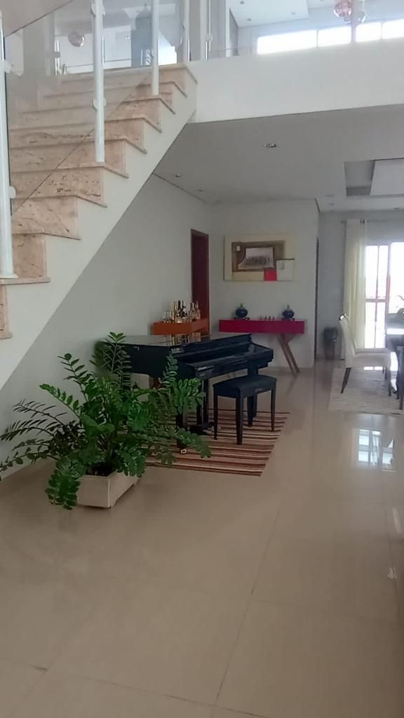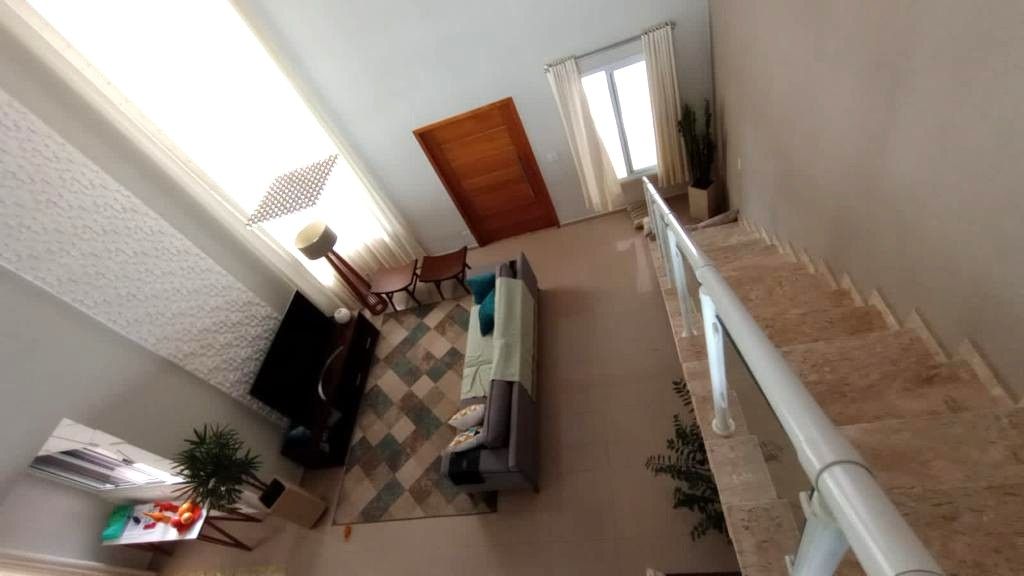 A casa conta com pé-direito duplo na sala de entrada e na sala principal, lavabo, sala de jantar, sala de estar e cozinha americana com balcão, que dá acesso a uma sala de lanche.