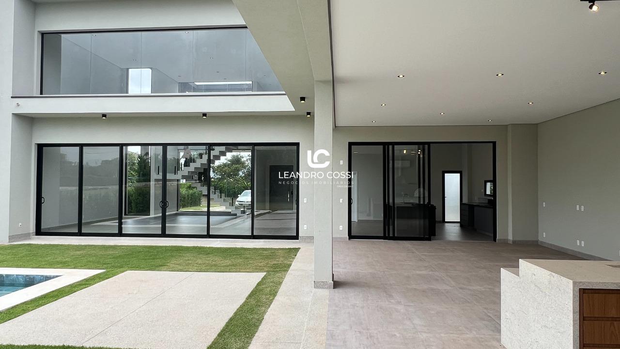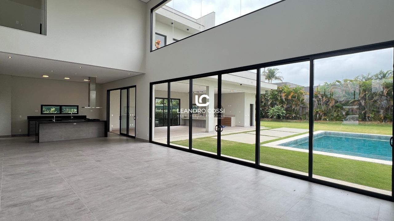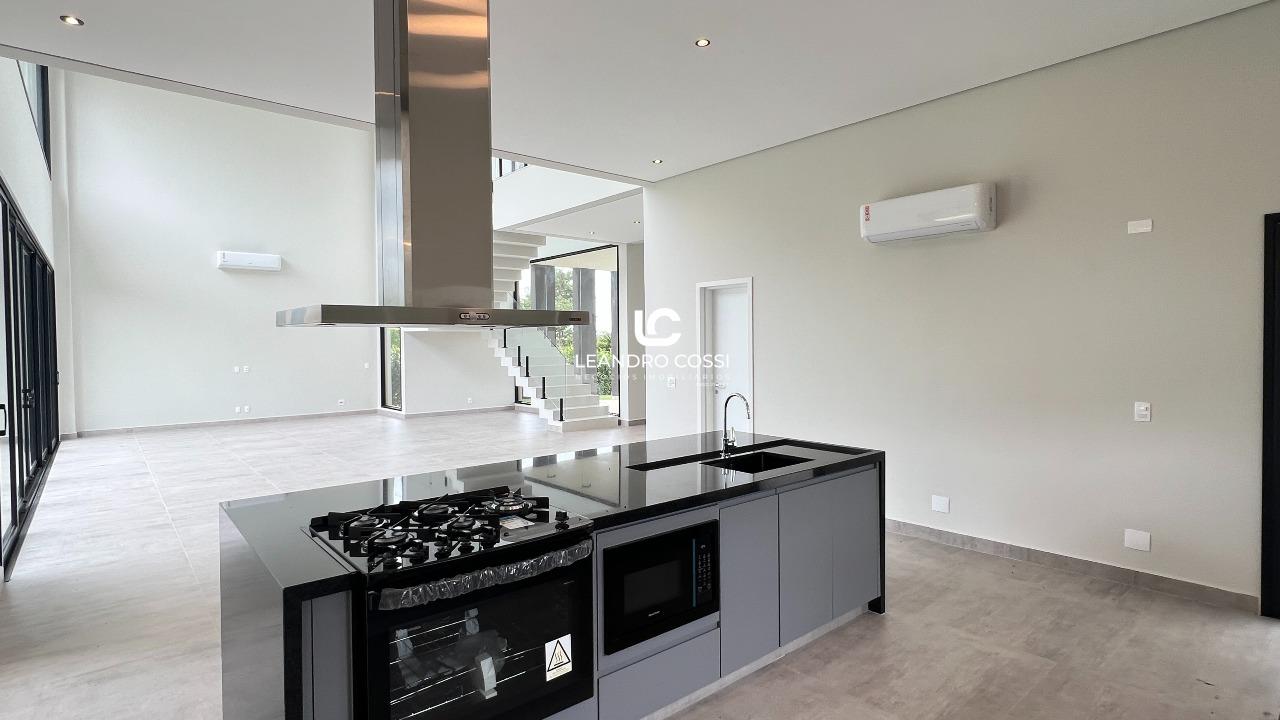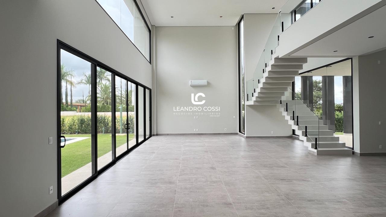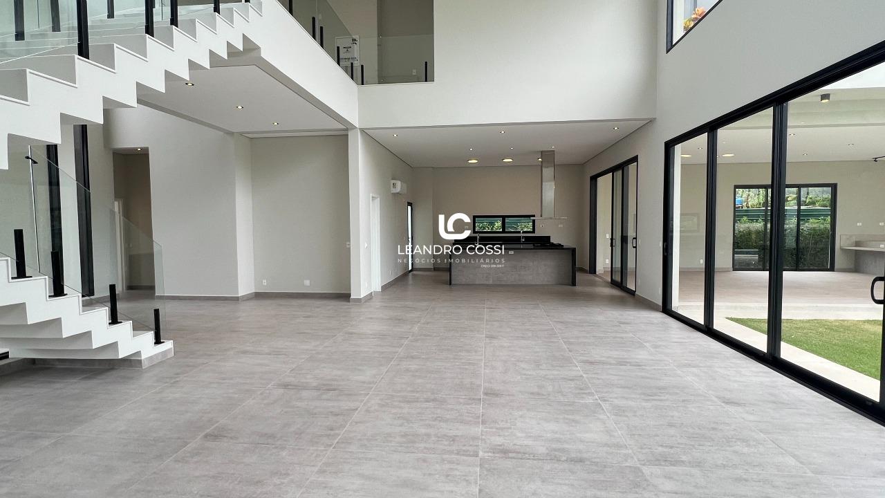 A residência conta com 4 suítes, sendo uma suíte master com closet e terraço exclusivo, proporcionando um espaço íntimo e reservado. Os ambientes sociais são integrados, com sala de estar e jantar conectadas à cozinha, além de lavabo, criando um layout moderno e acolhedor.