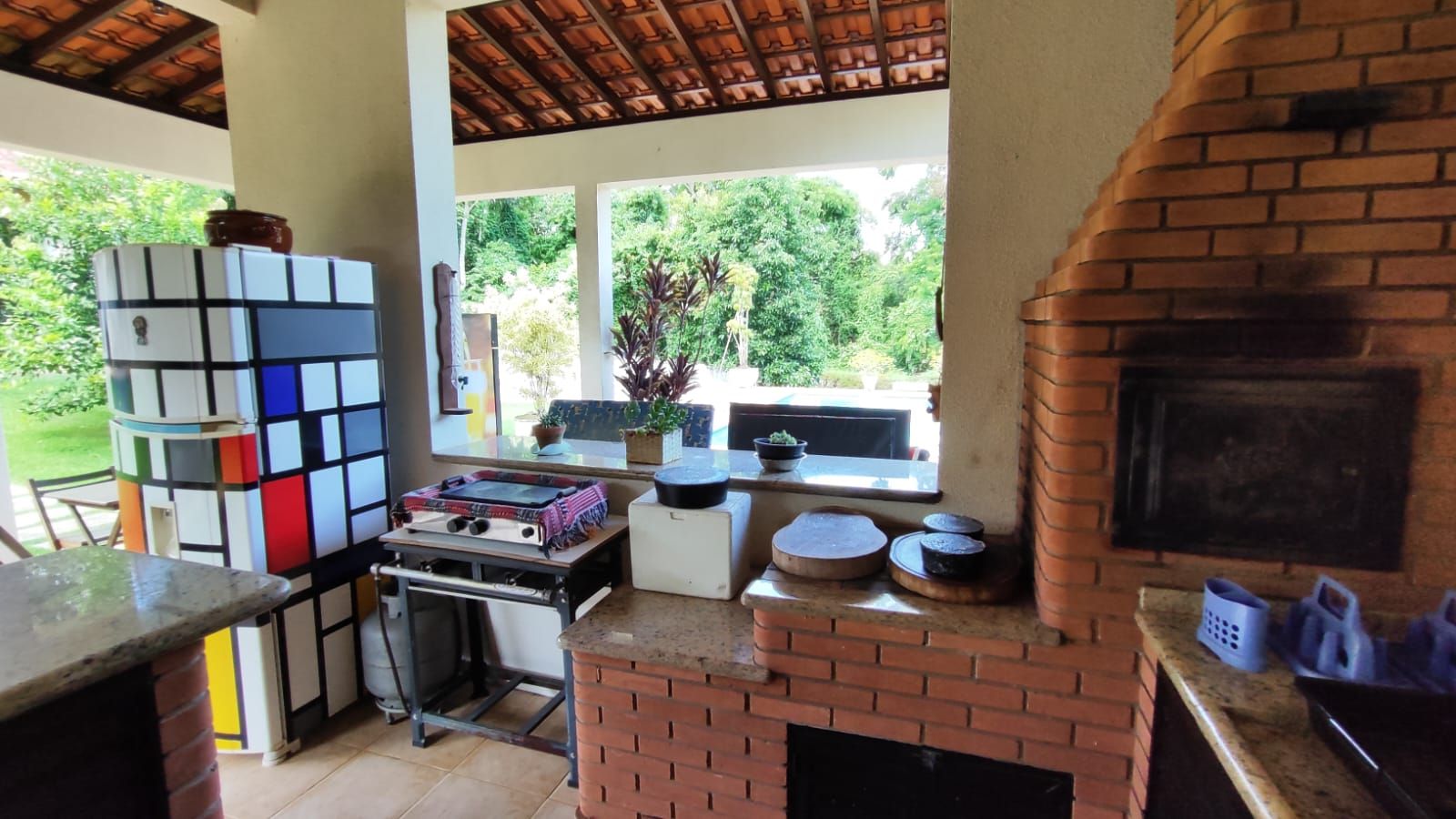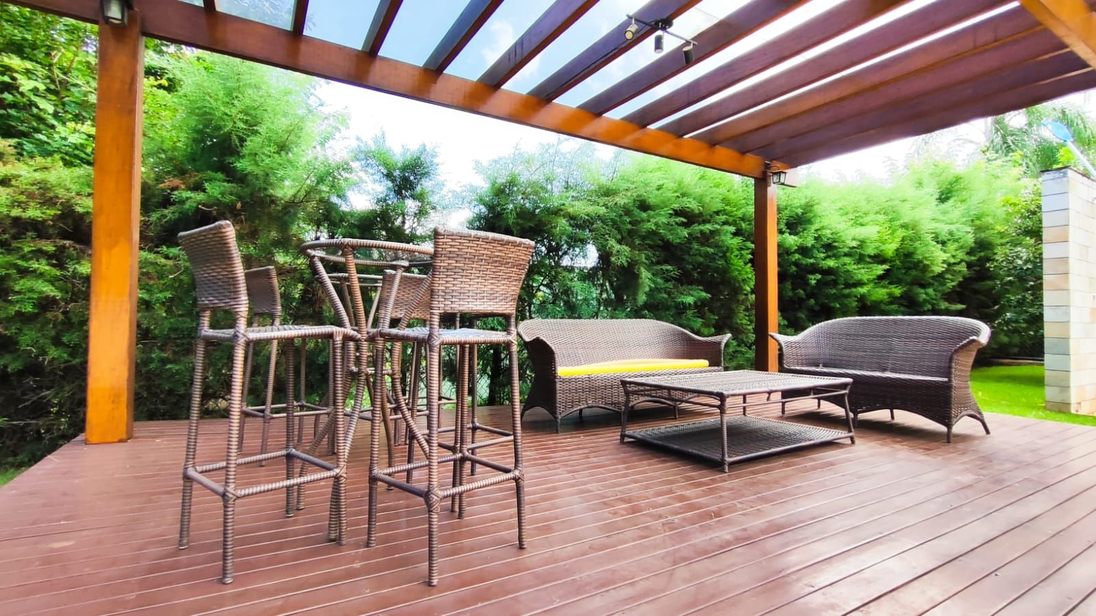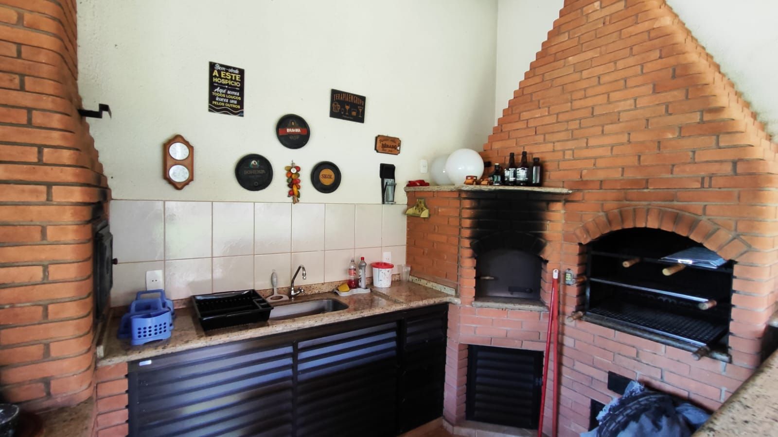 Área gourmet avarandada com churrasqueira, forno de pizza, fogão e forno a lenha
