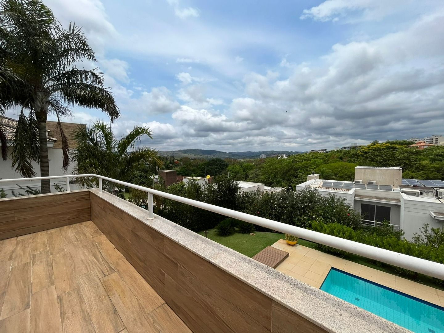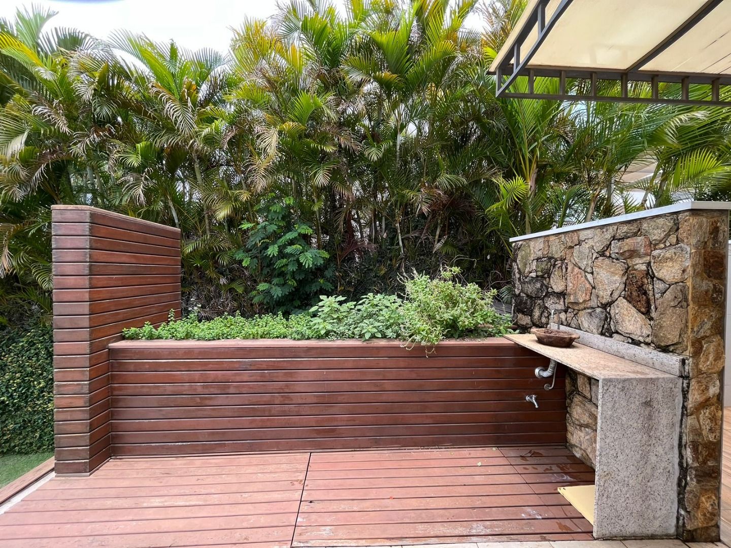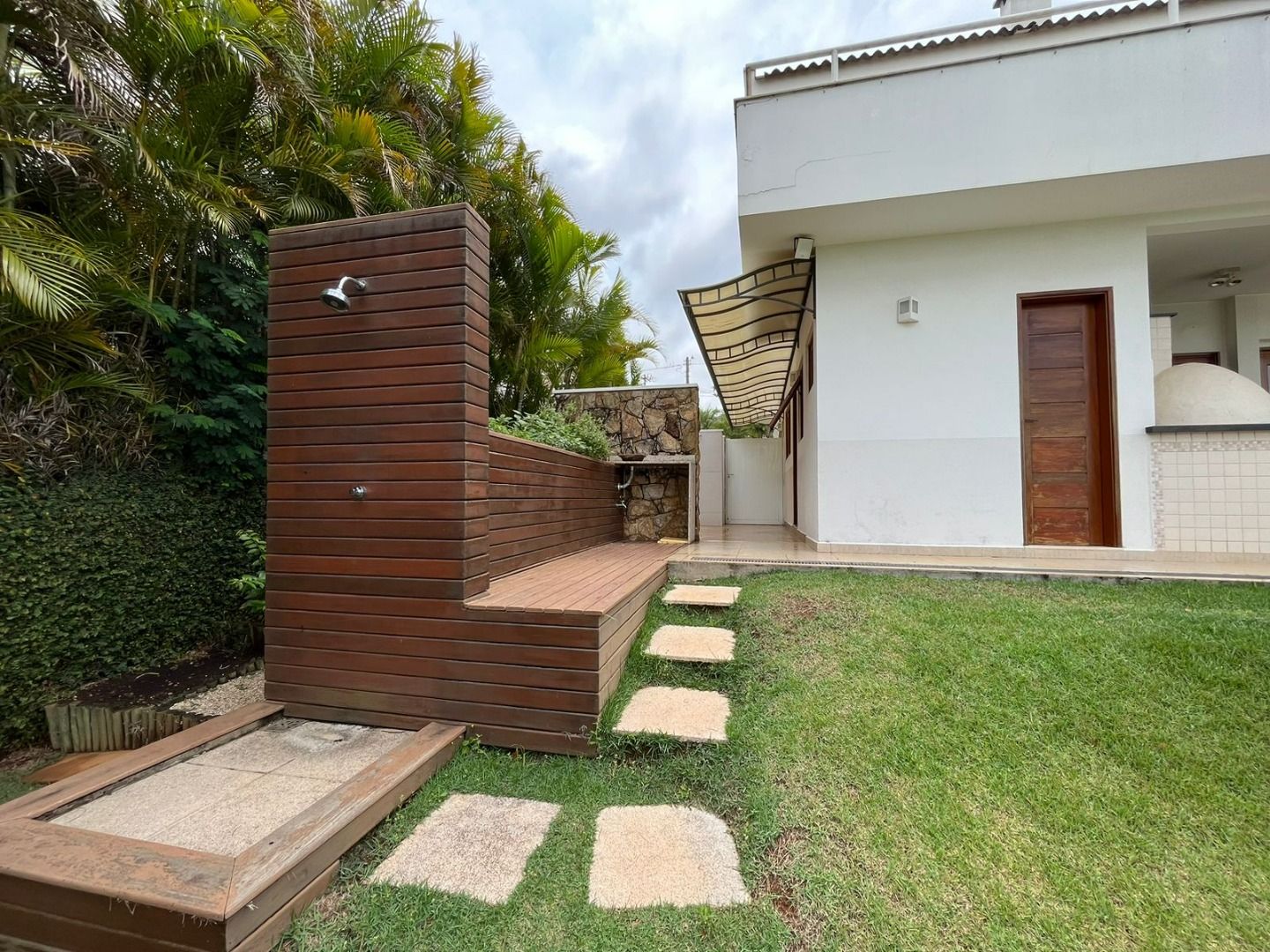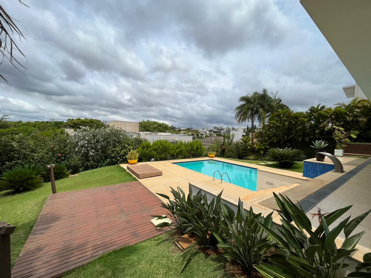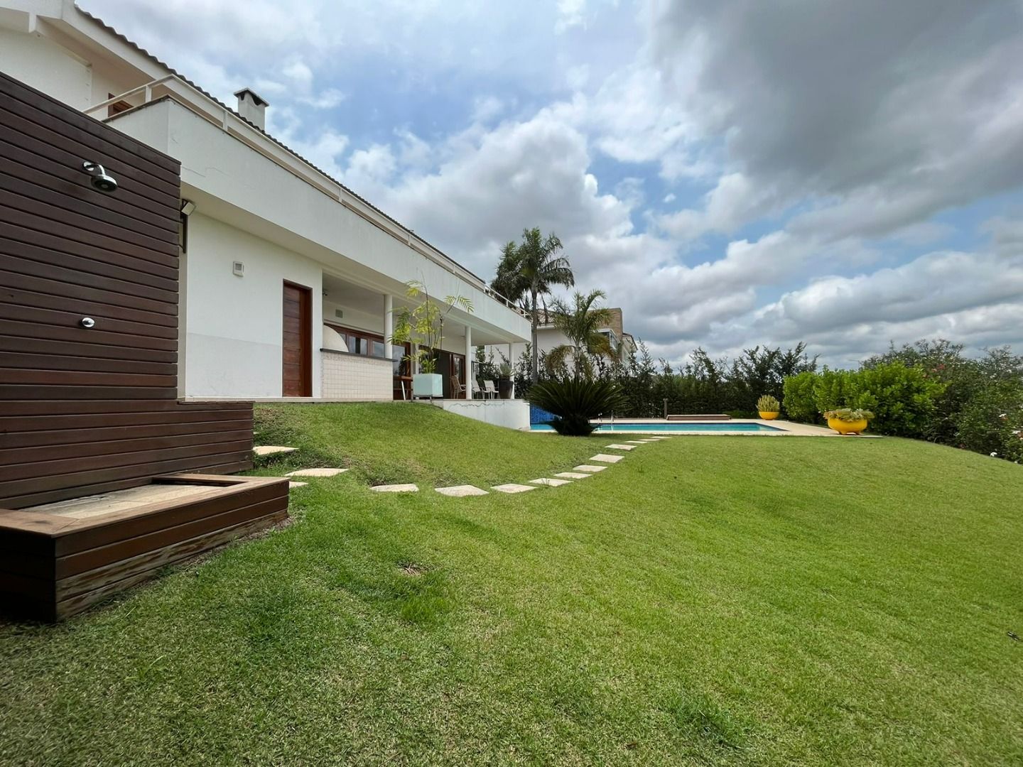 Jardim com piscina, deck, ducha e horta, perfeito para relaxamento e confraternizações