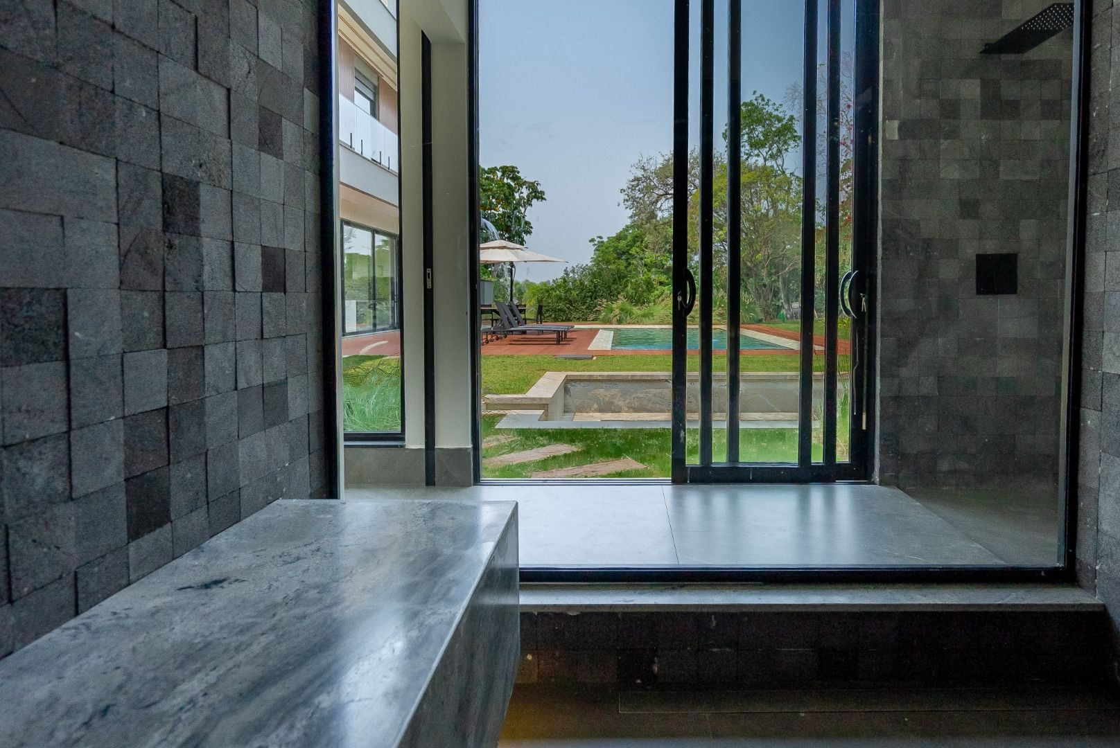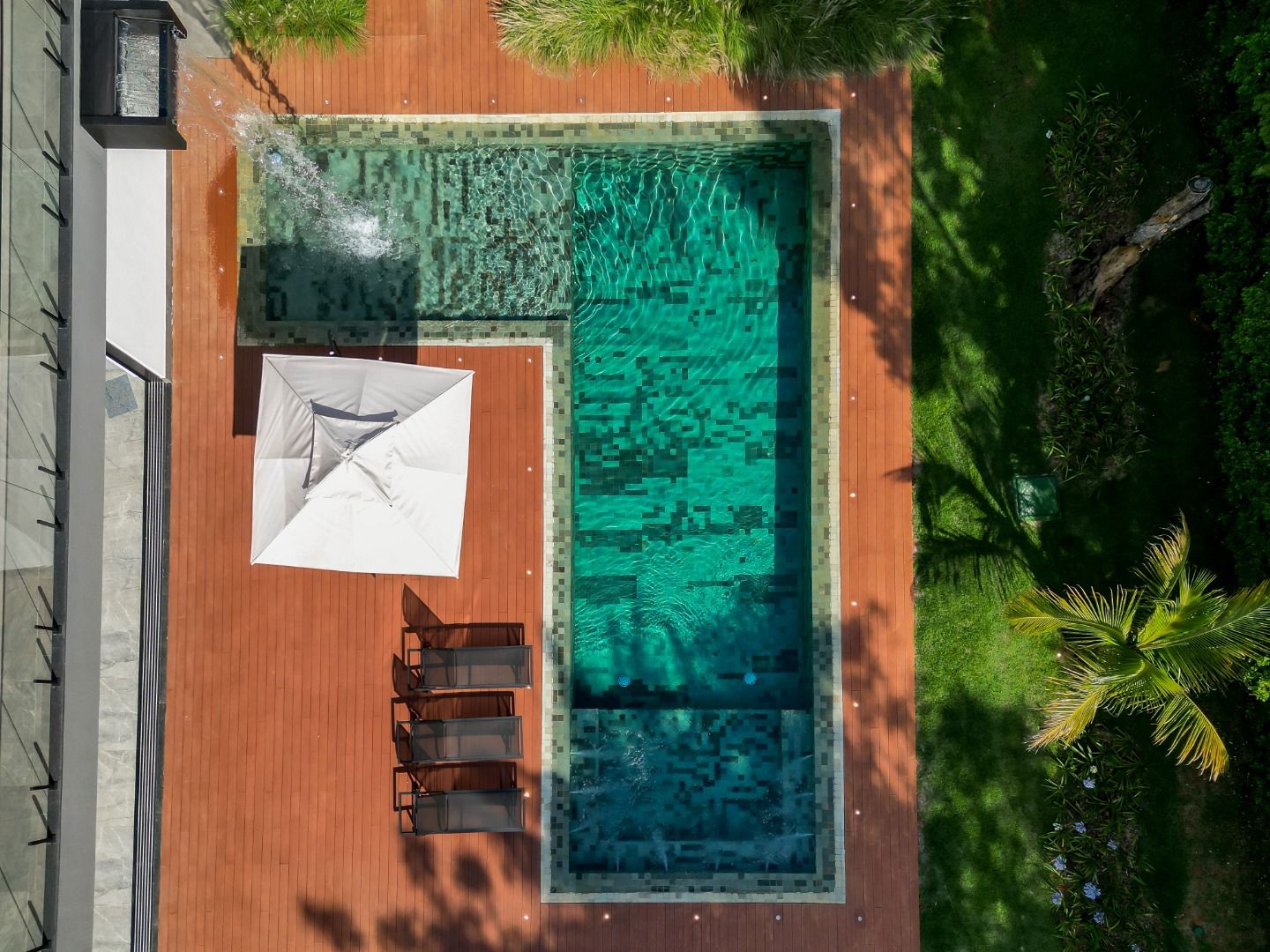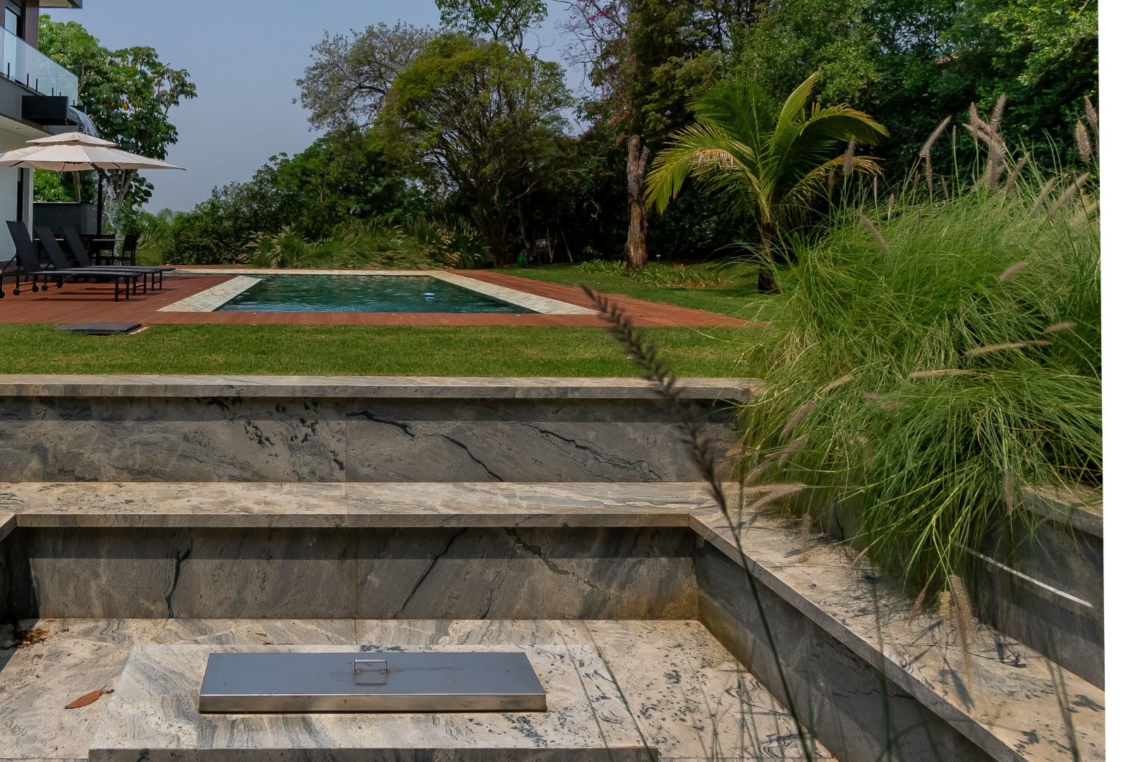 Piscina revestida em pedra Hijau com cascata e design elegante