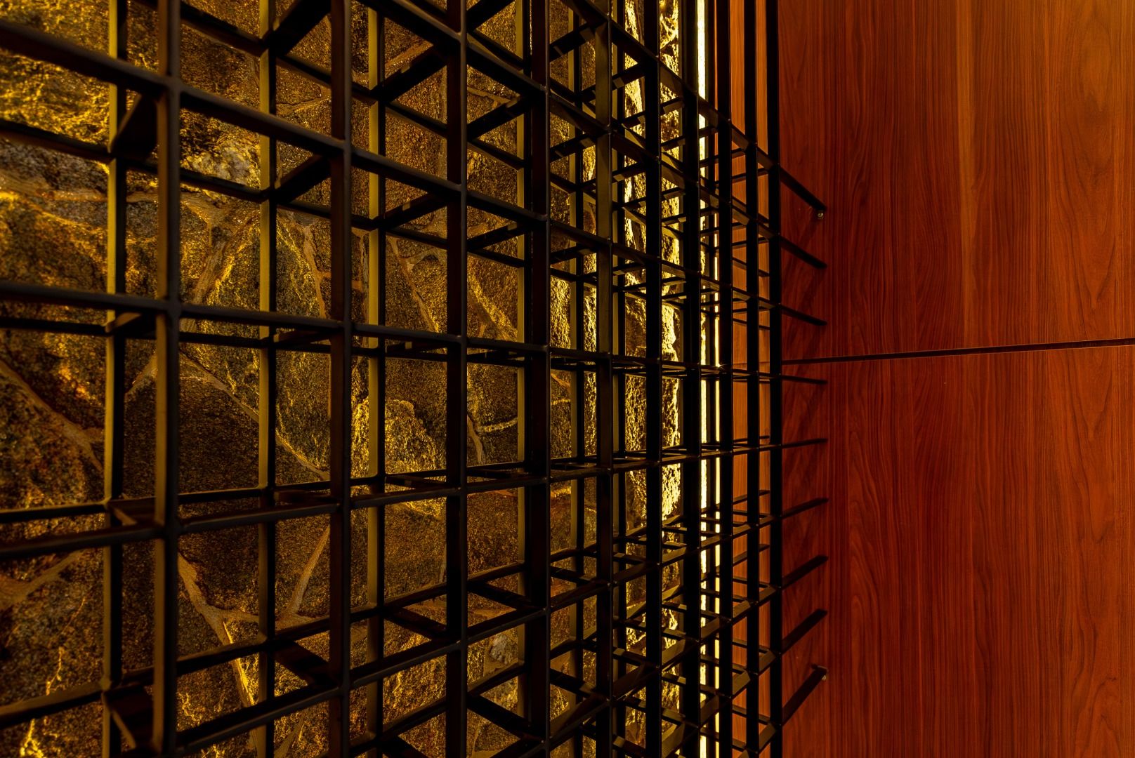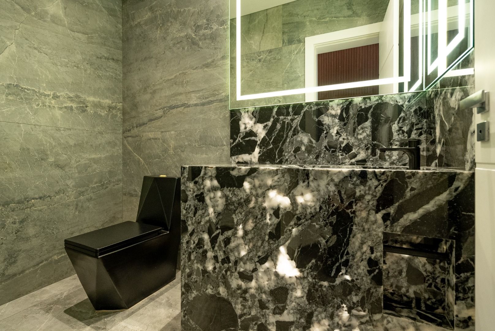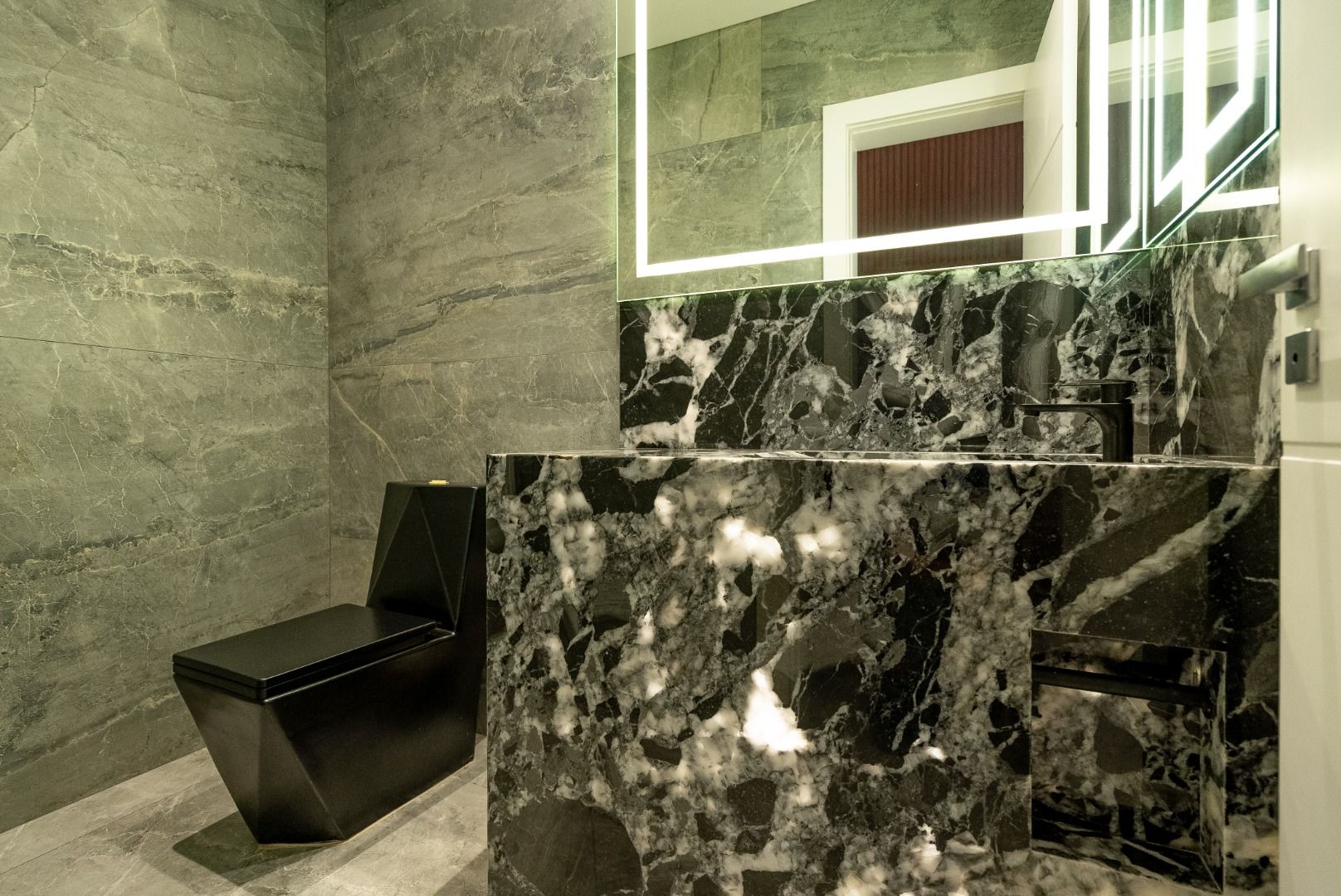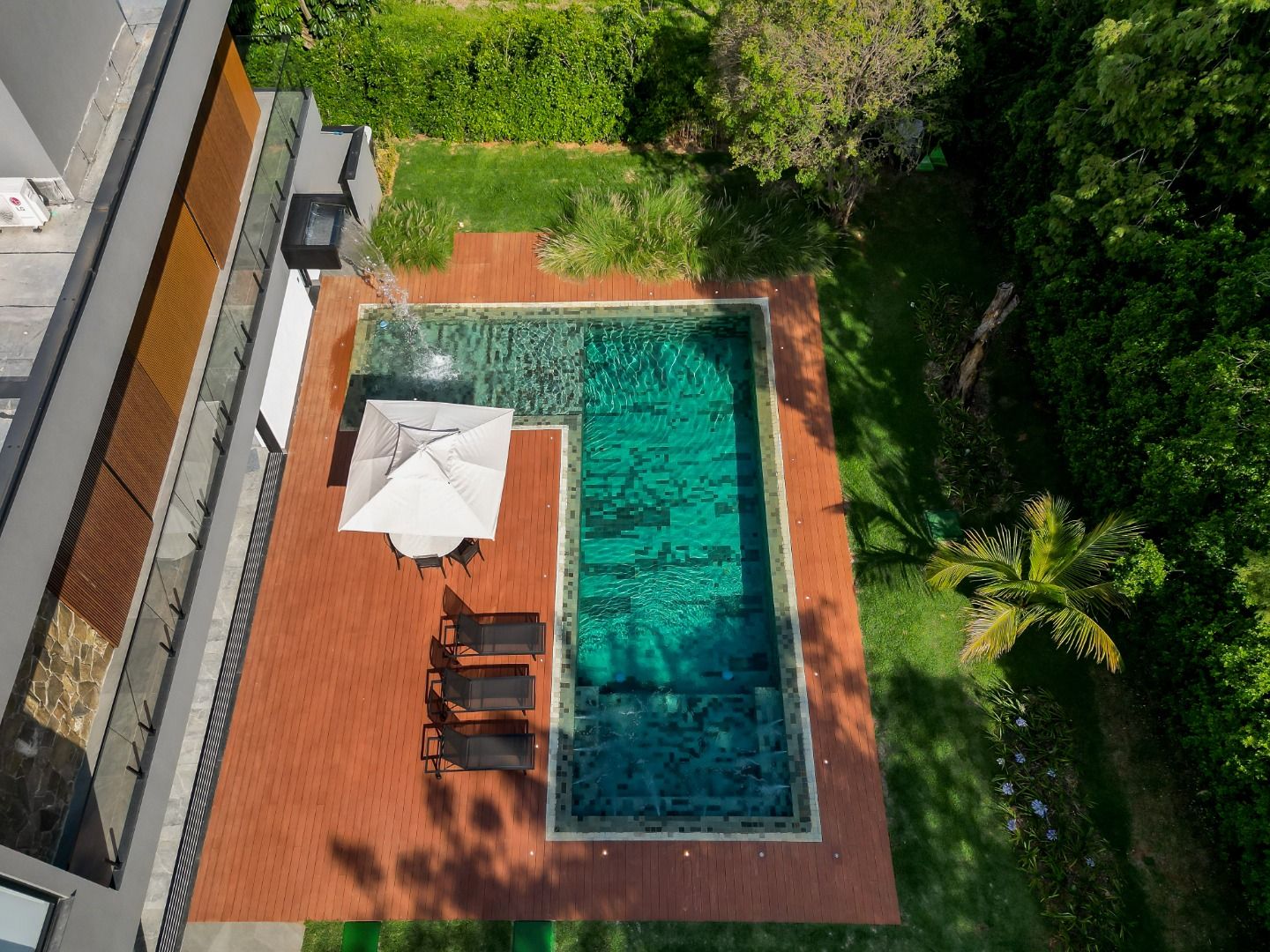 Piscina revestida em pedra Hijau com cascata e design elegante