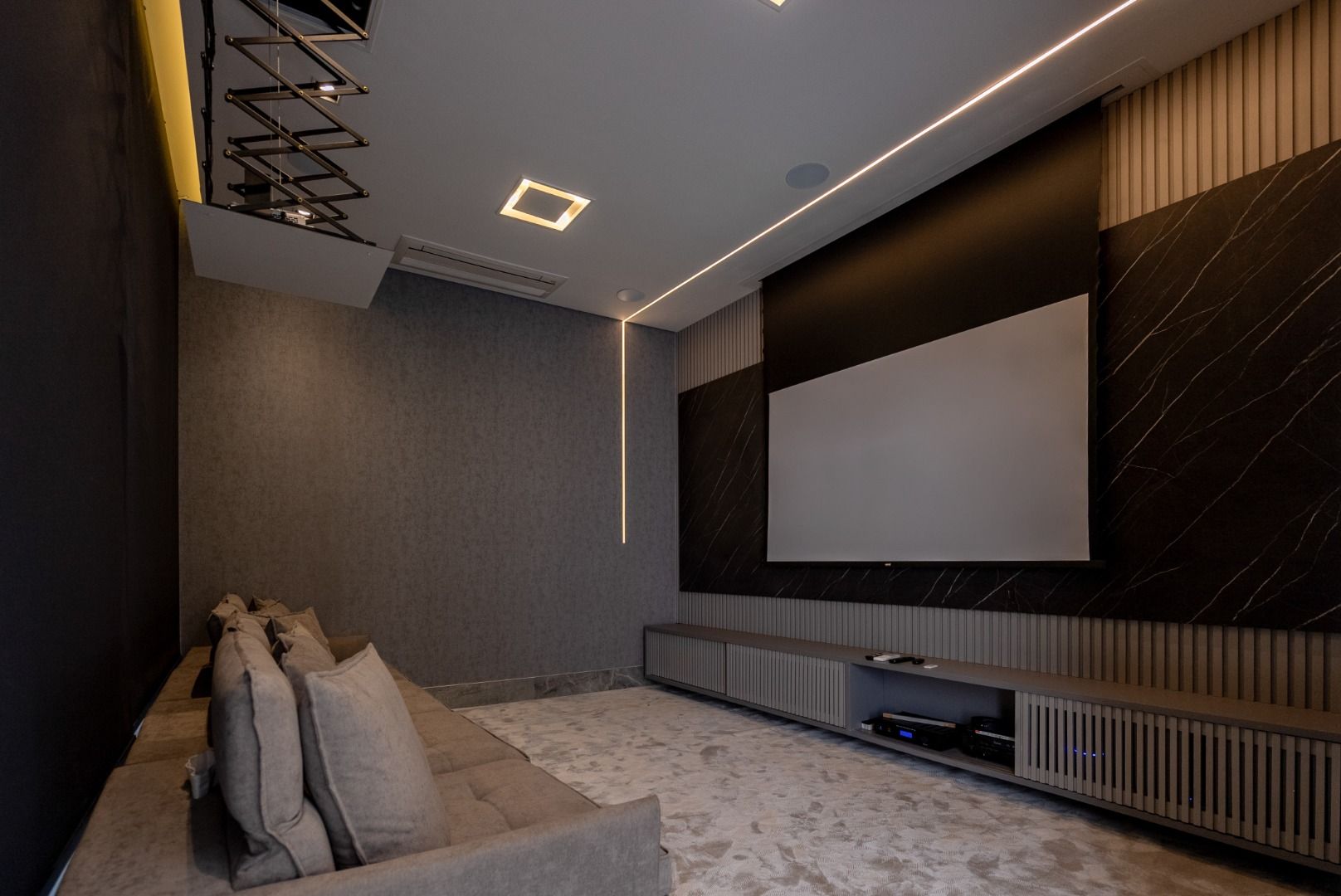 Sala de cinema exclusiva com tela de 120”, projetor HD e som surround