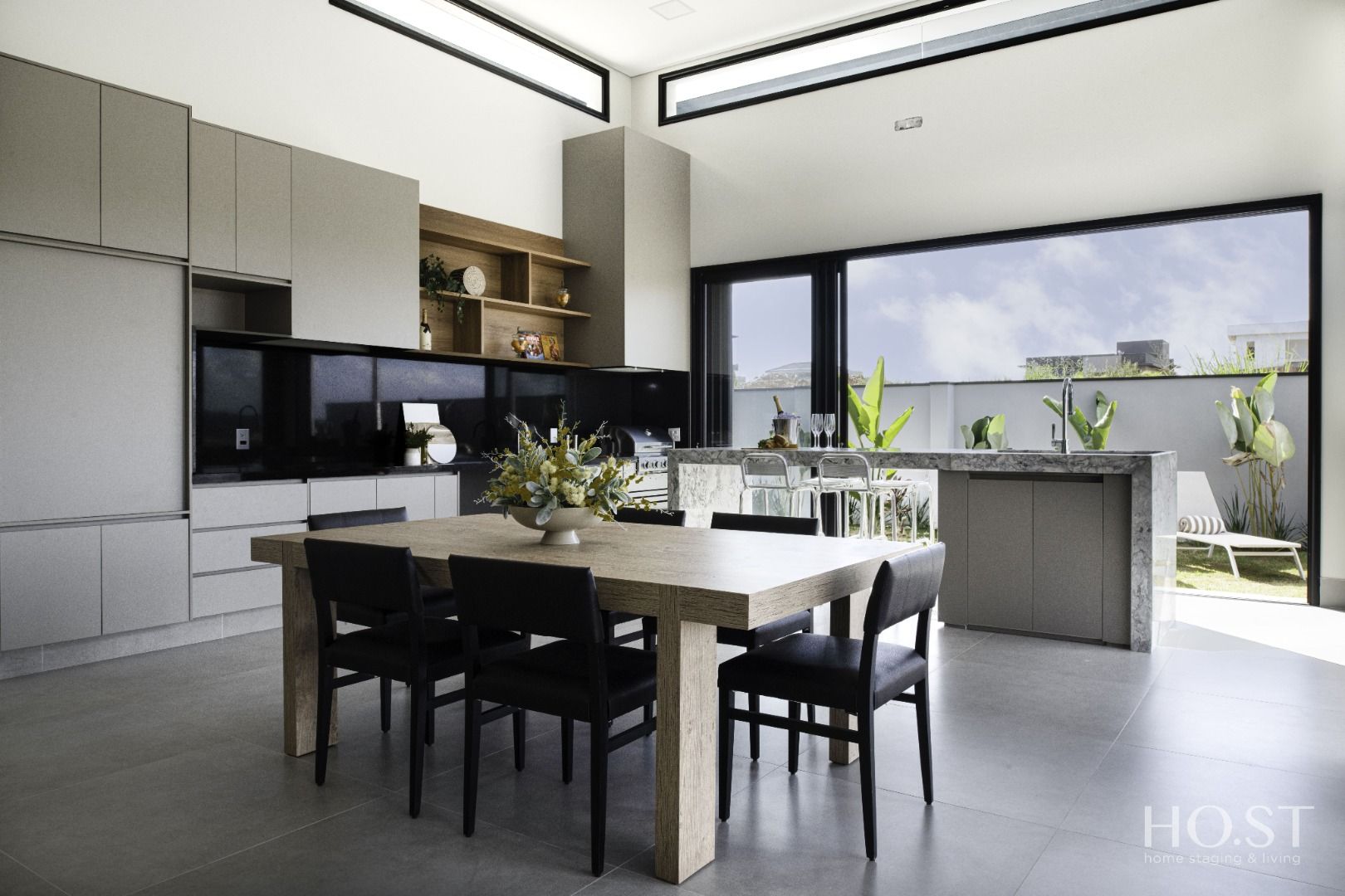 Com projeto moderno e ambientes integrados, a área social é composta por sala de estar, sala de jantar e cozinha contemporânea com despensa, além de lavabo e lavanderia com acesso independente.