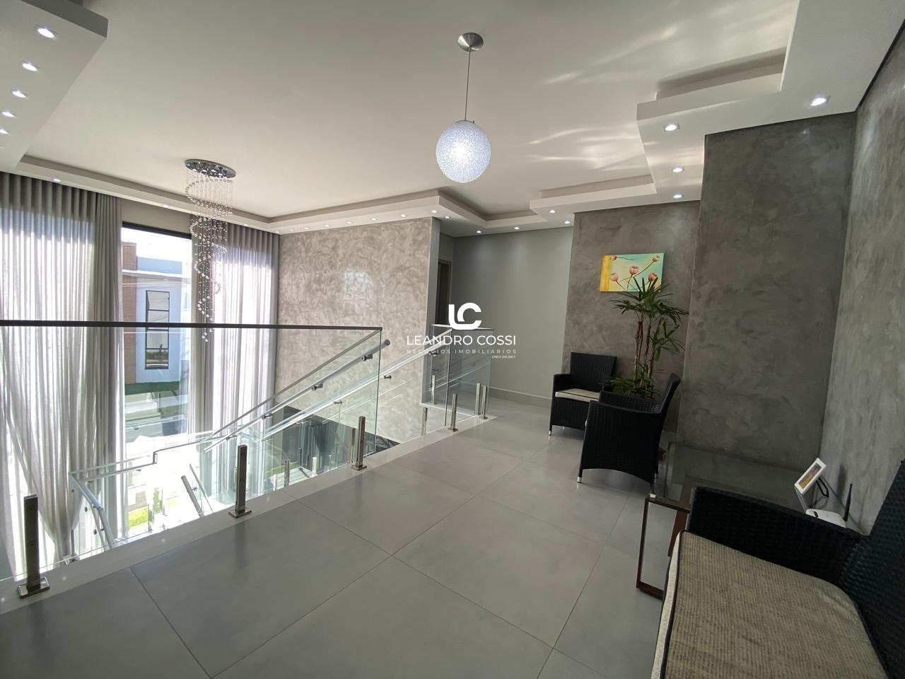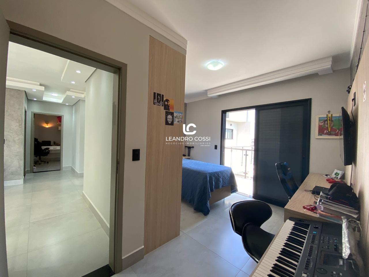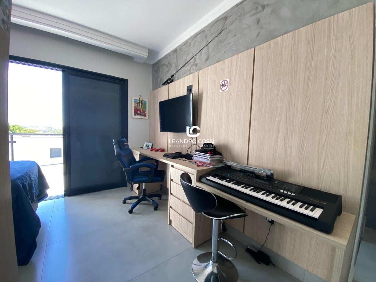 No piso superior, a casa conta com 5 suítes amplas e confortáveis, além de um escritório ideal para home office e um espaço reservado para academia no pavimento superior.