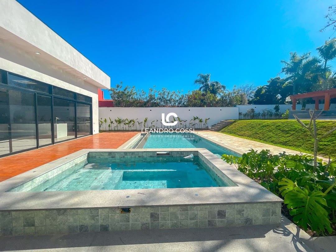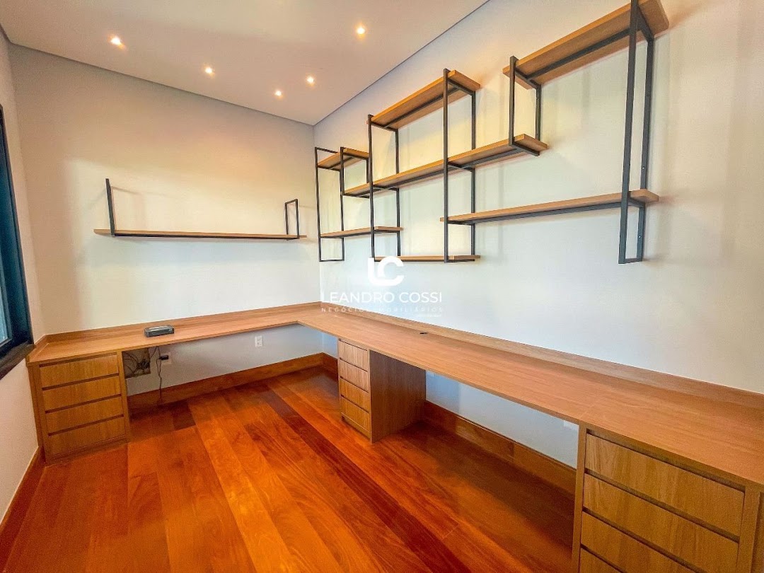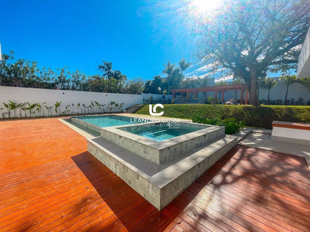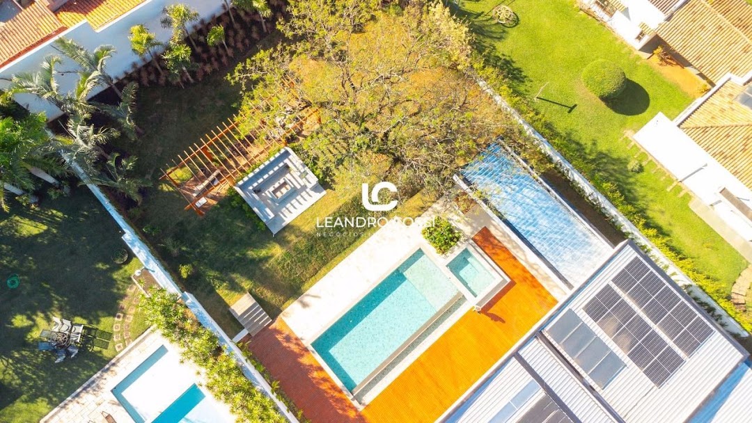 A casa possui 5 suítes, sendo uma suíte master com closet espaçoso e dois banheiros. Conta ainda com escritório, sala de home TV, área de serviço completa e lavanderia com acesso independente.