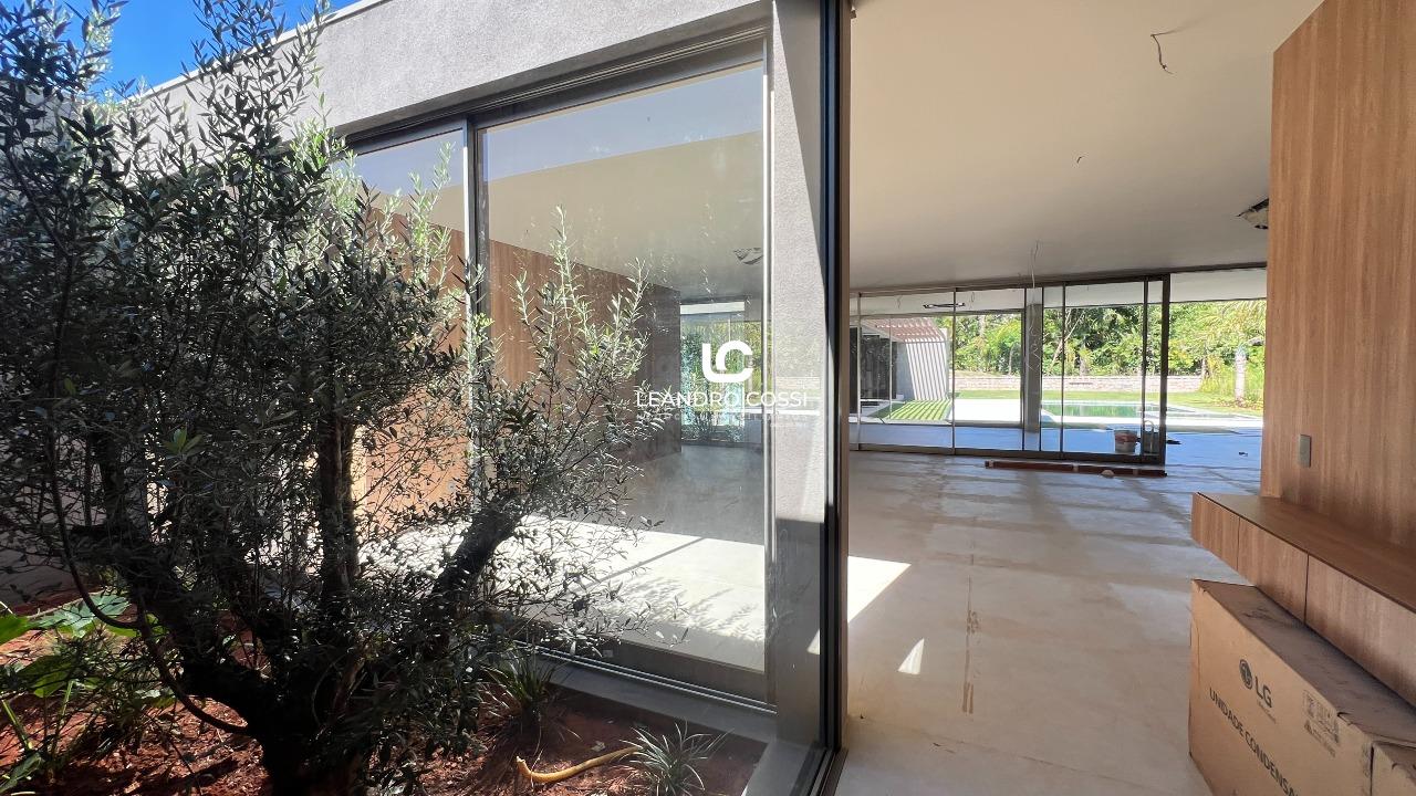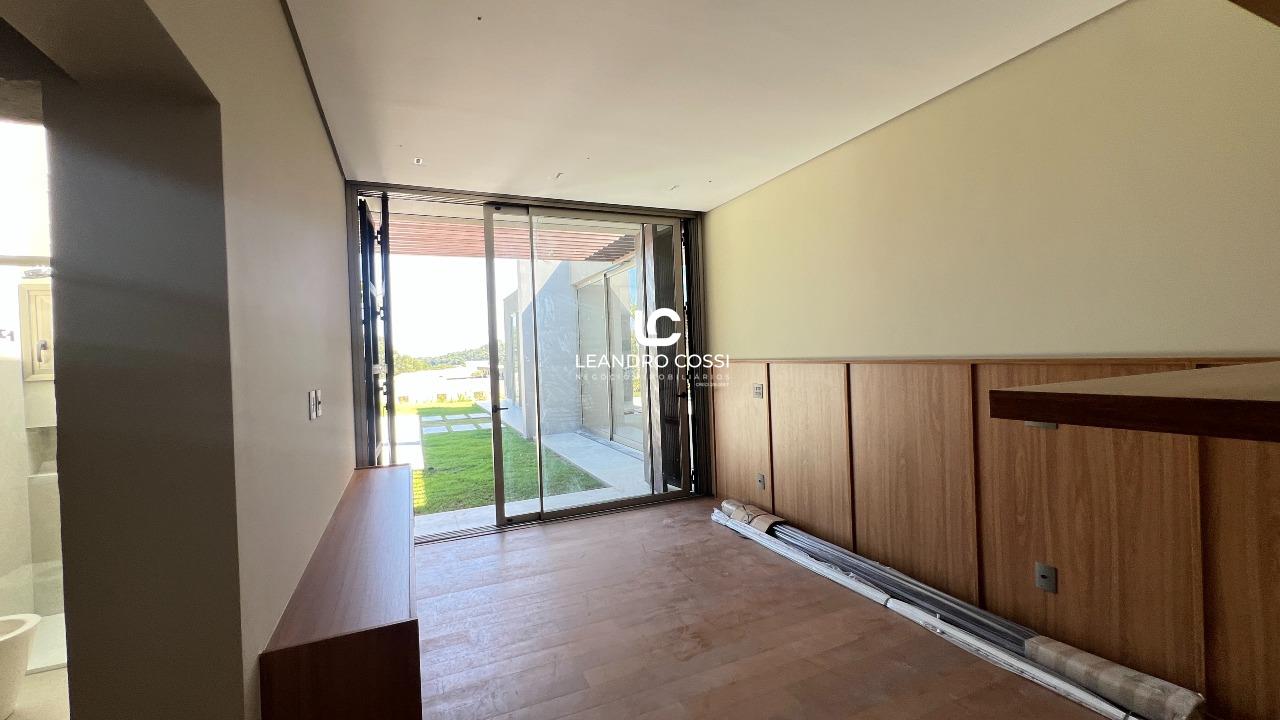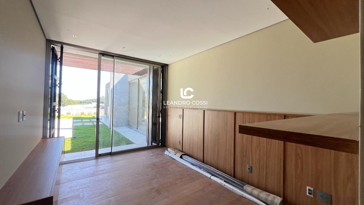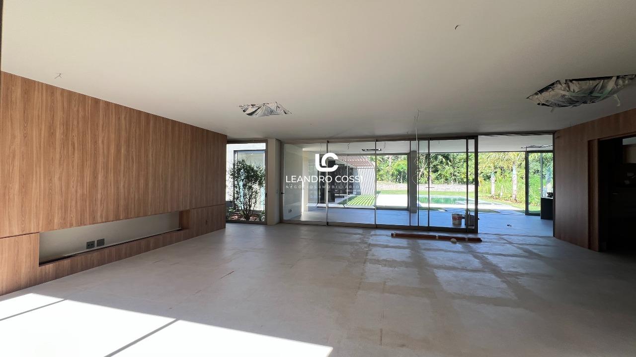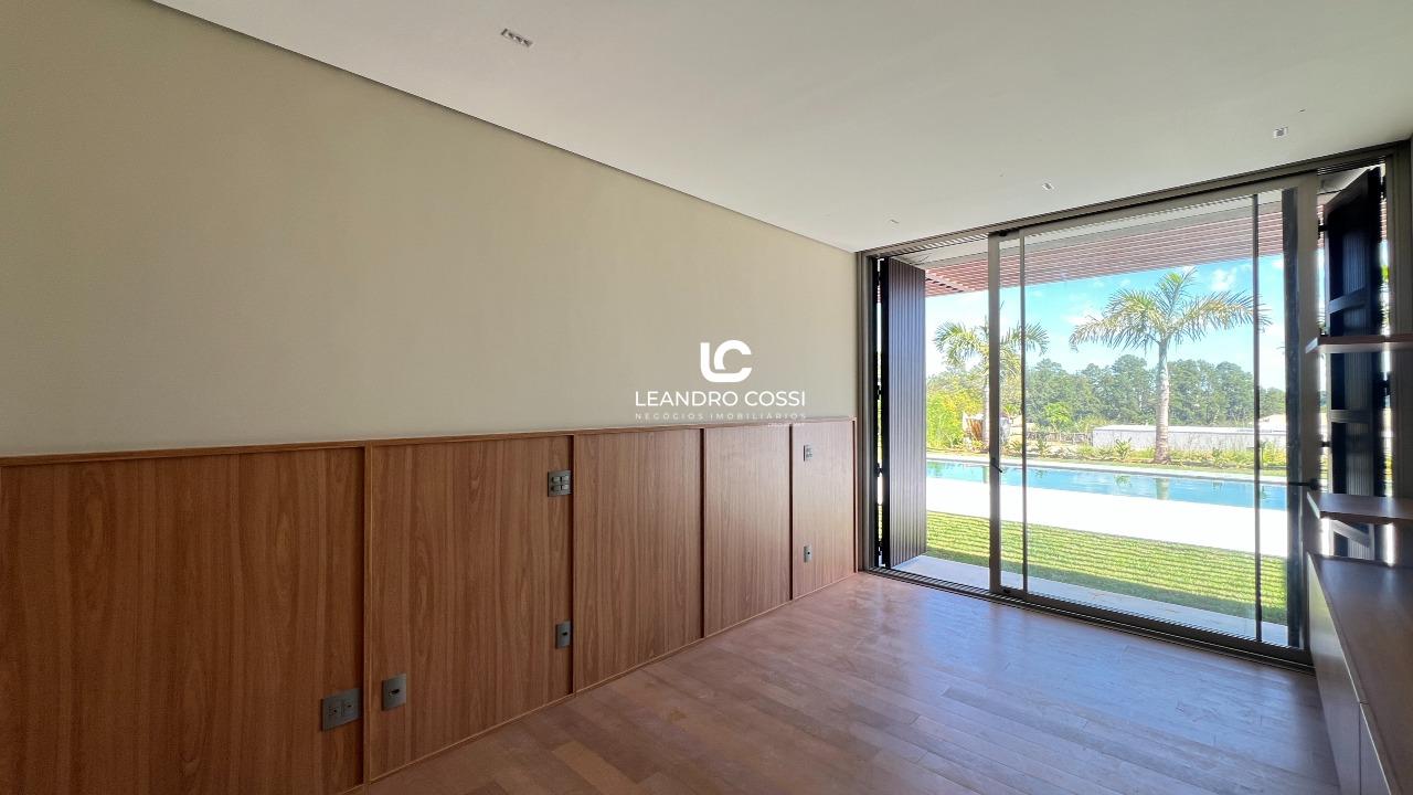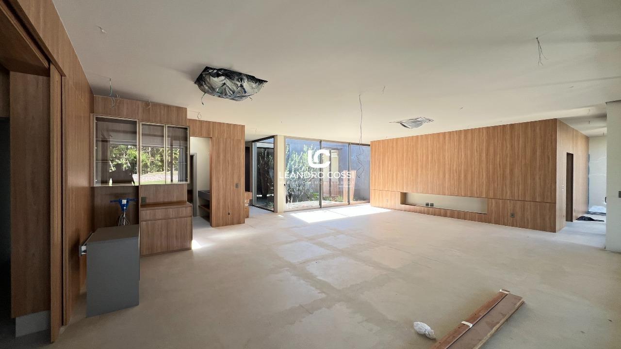 Todos os ambientes se distribuem em um único pavimento, favorecendo a circulação e a integração. A área íntima conta com cinco suítes espaçosas, além de um ambiente versátil que pode ser utilizado como escritório ou facilmente adaptado para uma sexta suíte, acompanhando diferentes necessidades da família. Já a área social se destaca pelo pé direito elevado e pela conexão direta com o jardim, proporcionando iluminação natural e uma sensação constante de amplitude e bem-estar.