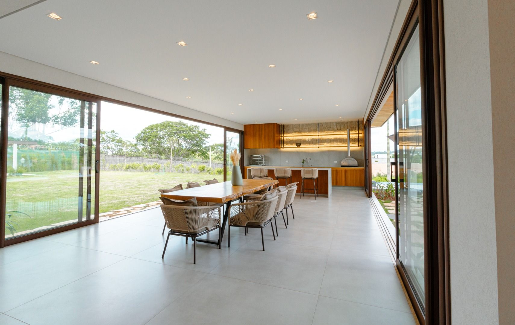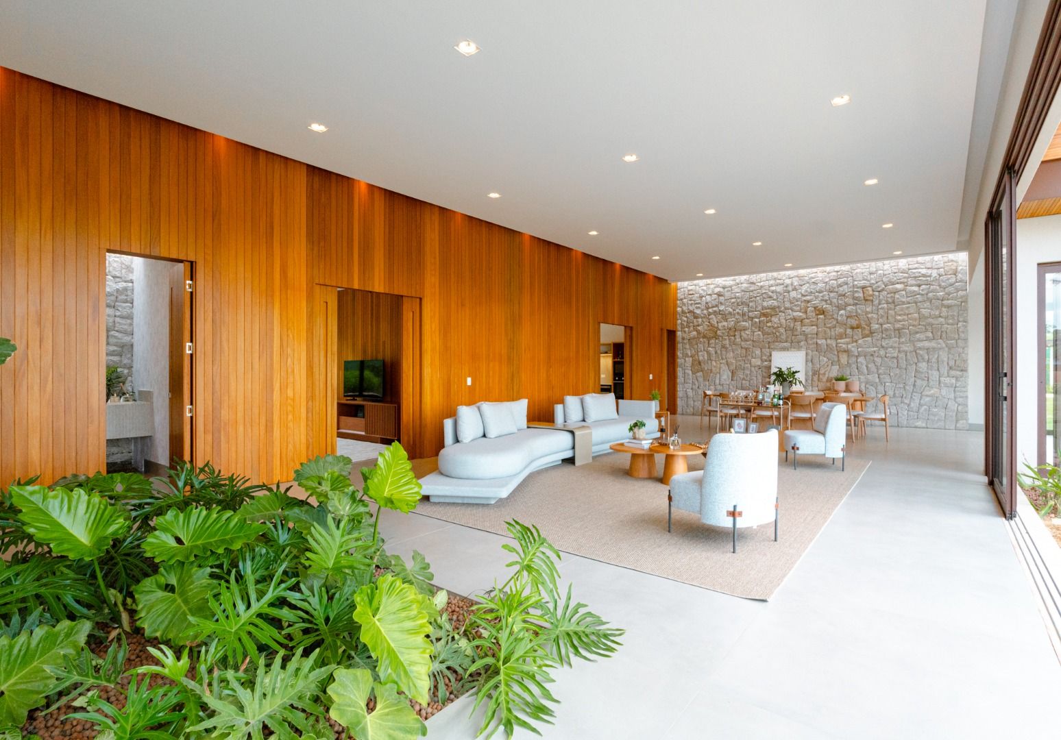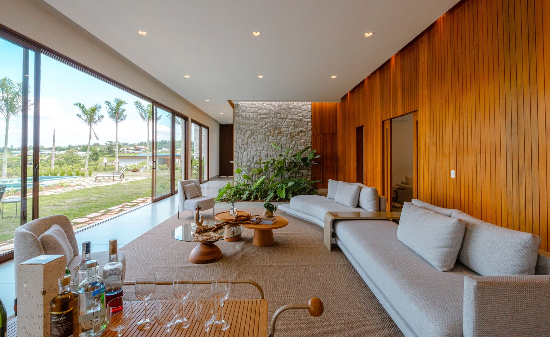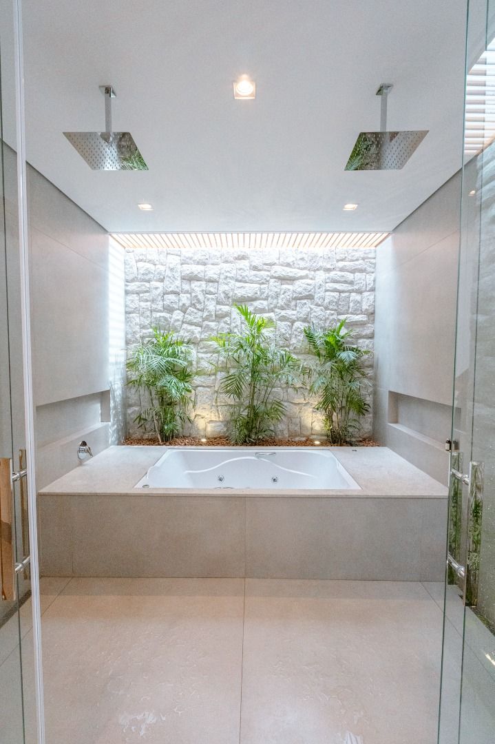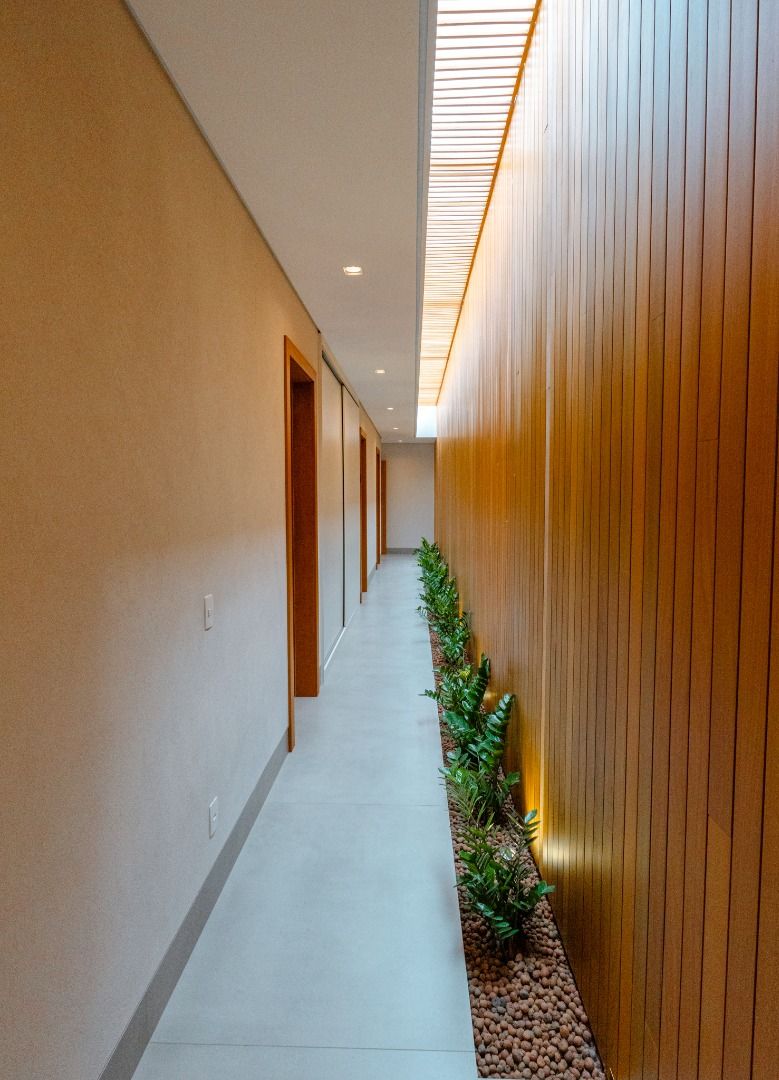 Dispõe de 5 suítes espaçosas, todas com vista para a área externa, incluindo uma suíte master com closet, chuveiros duplos e banheira de imersão. Sala de estar com pé-direito duplo, painel em madeira ripada e um charmoso lavabo com jardim interno. Espaço gourmet sofisticado, integrado à cozinha e com vista para a área de lazer, além de uma sala de TV anexa.