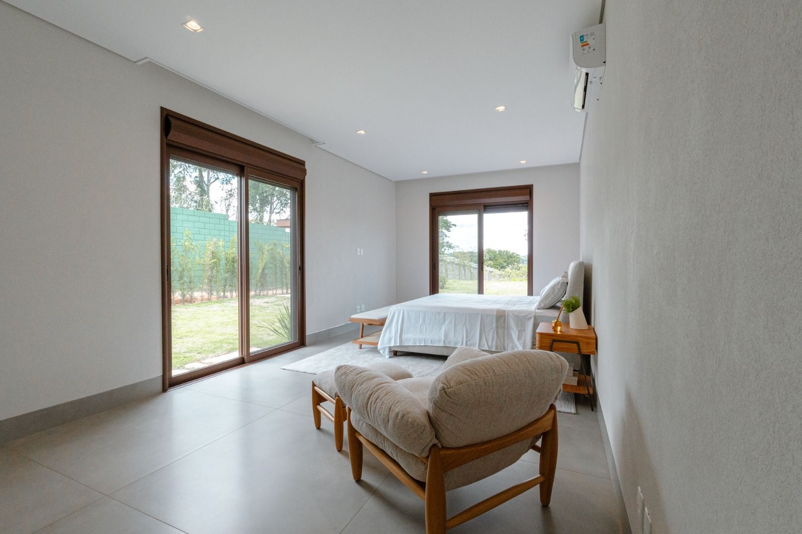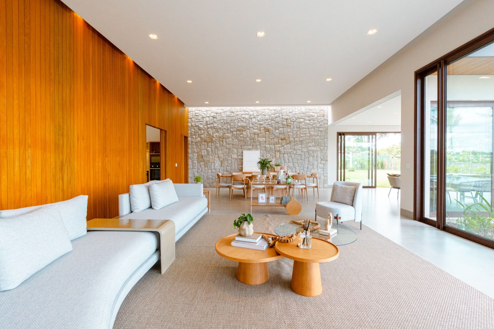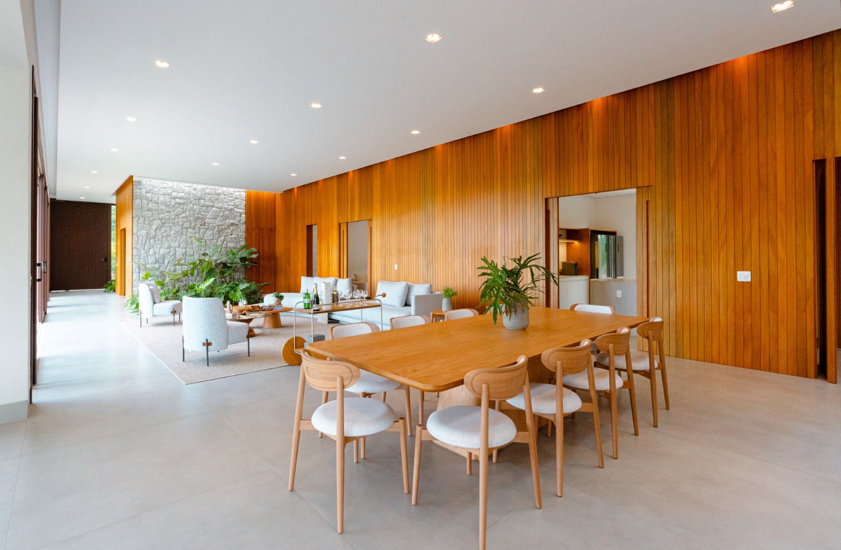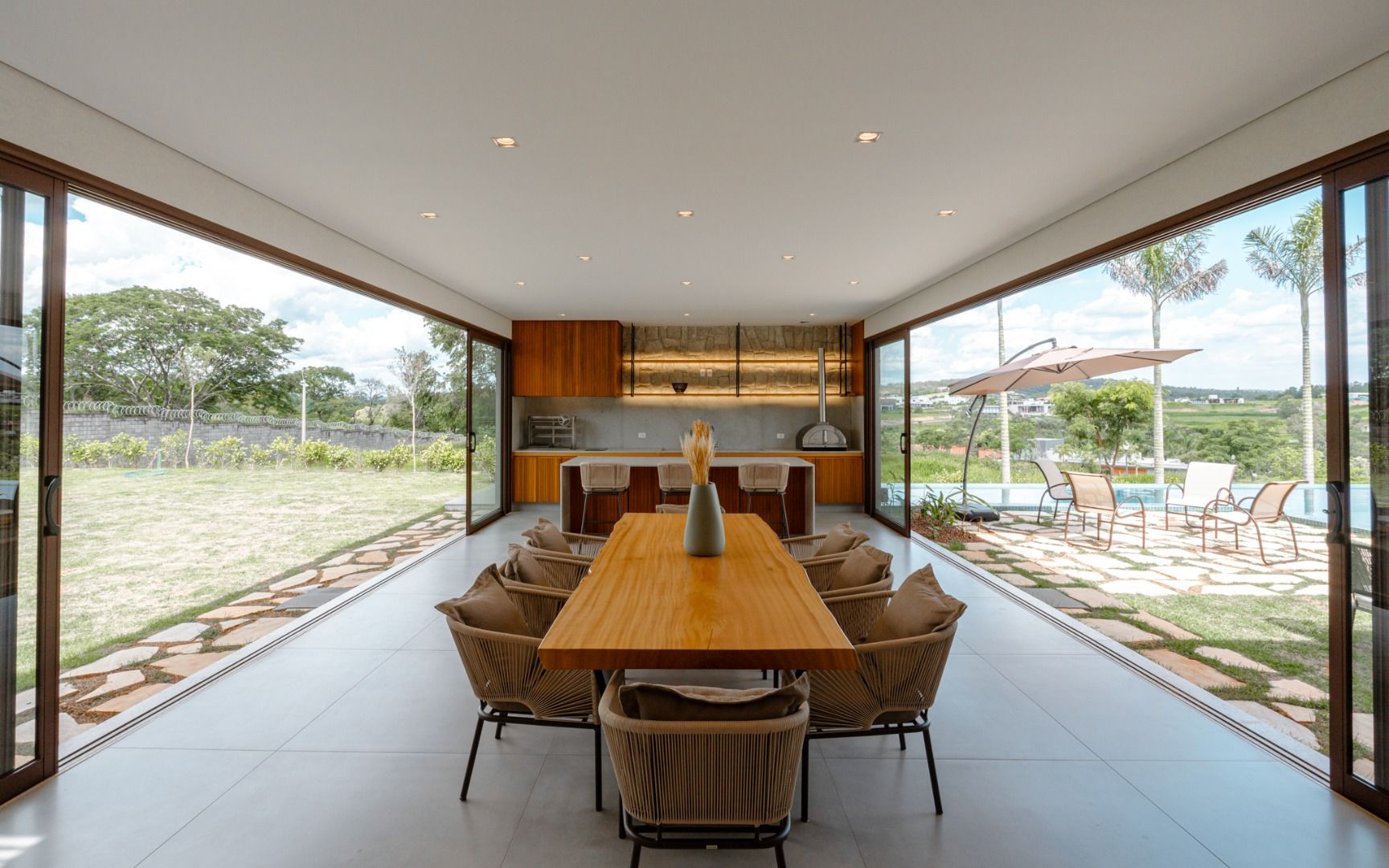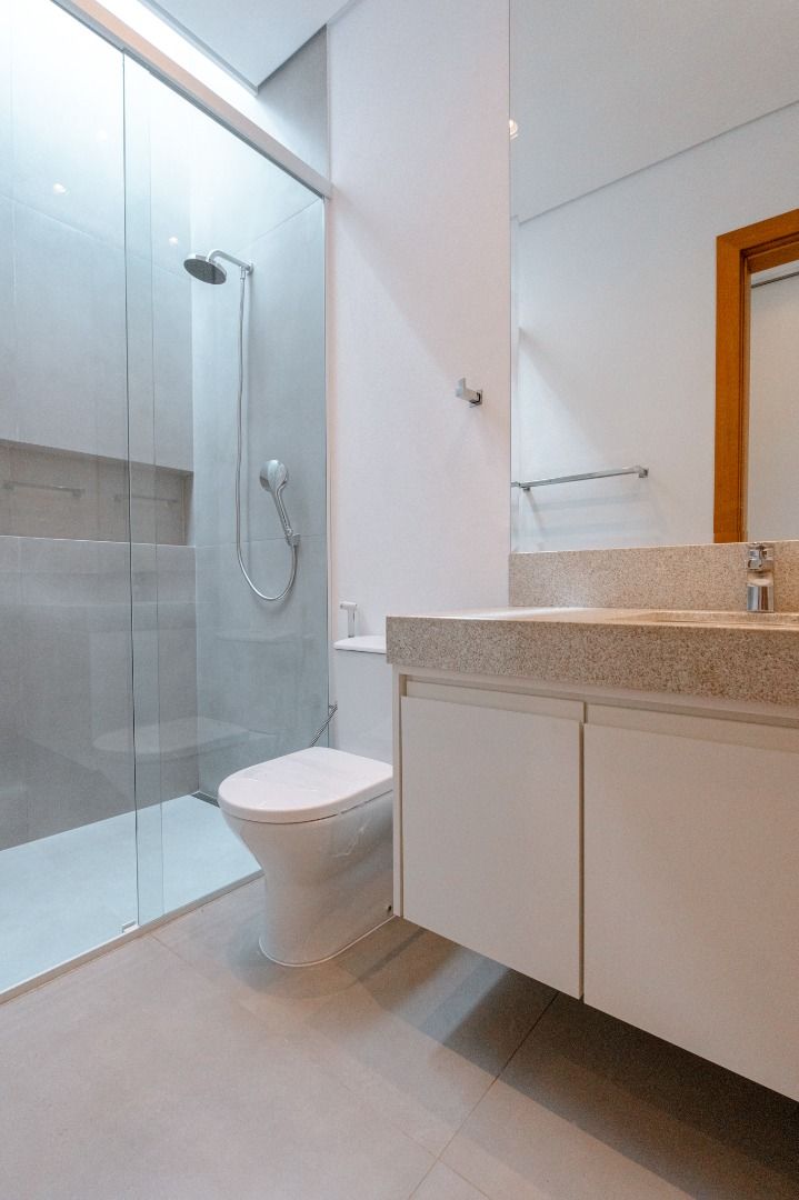 Dispõe de 5 suítes espaçosas, todas com vista para a área externa, incluindo uma suíte master com closet, chuveiros duplos e banheira de imersão. Sala de estar com pé-direito duplo, painel em madeira ripada e um charmoso lavabo com jardim interno. Espaço gourmet sofisticado, integrado à cozinha e com vista para a área de lazer, além de uma sala de TV anexa.