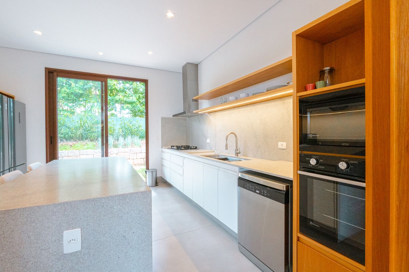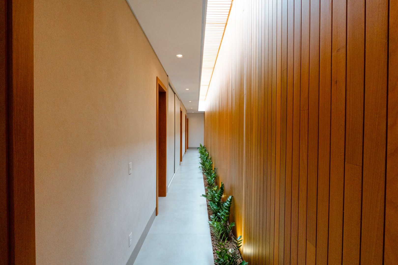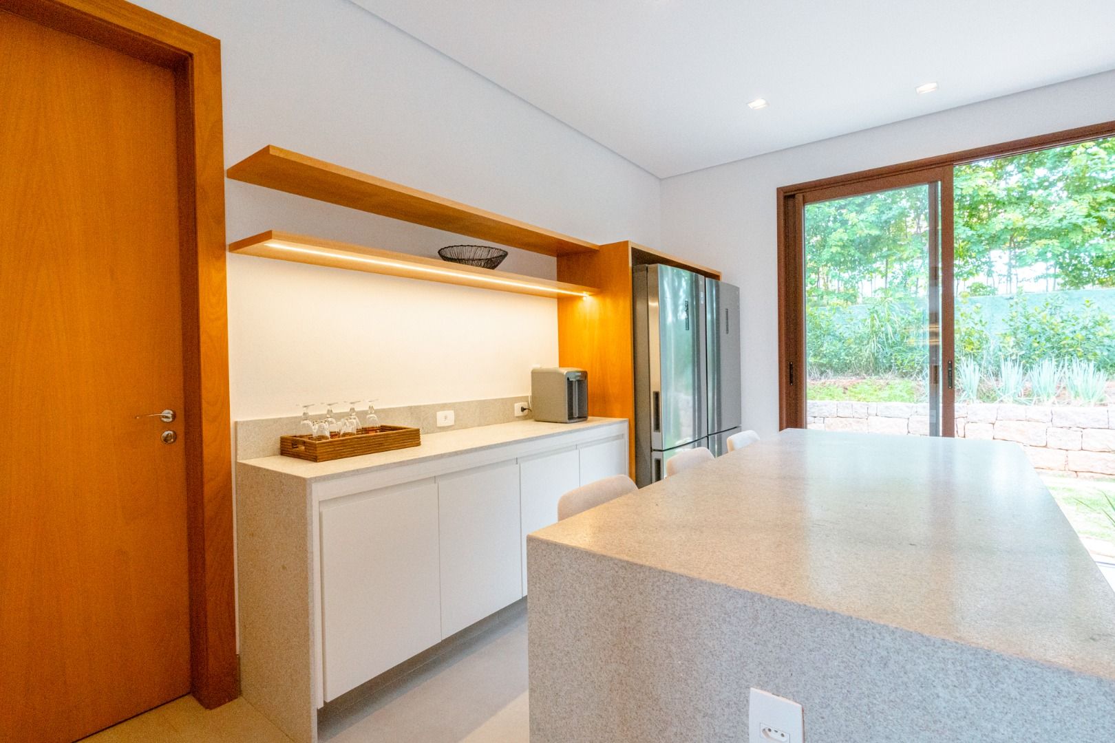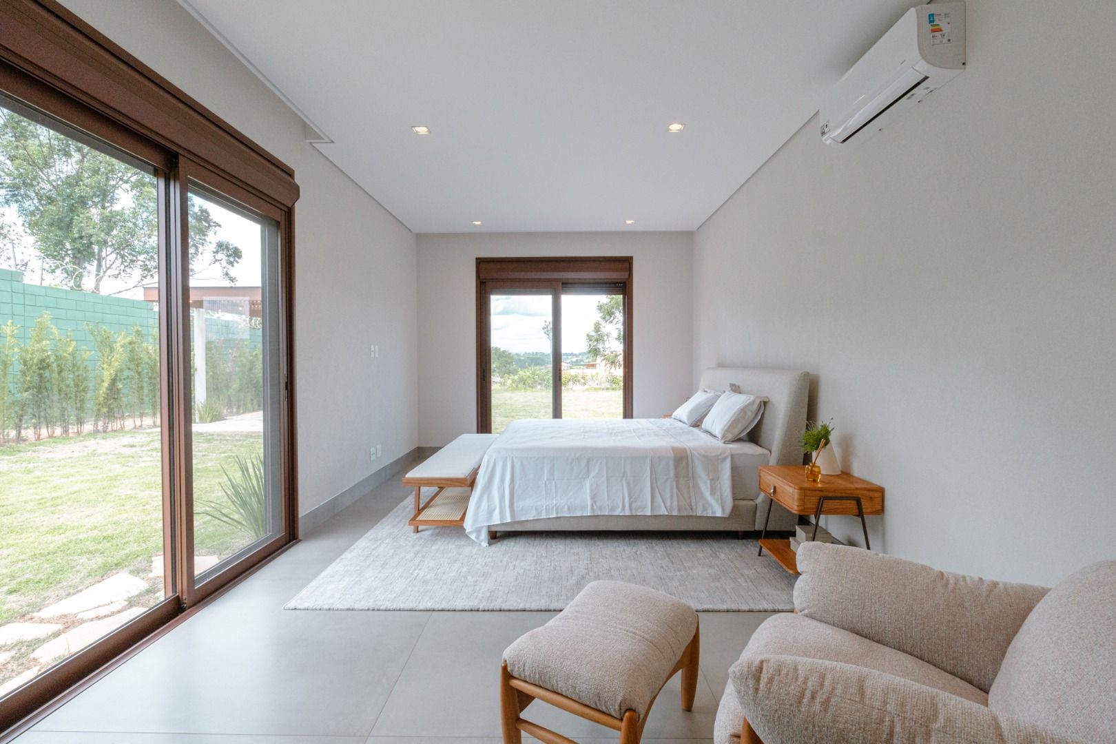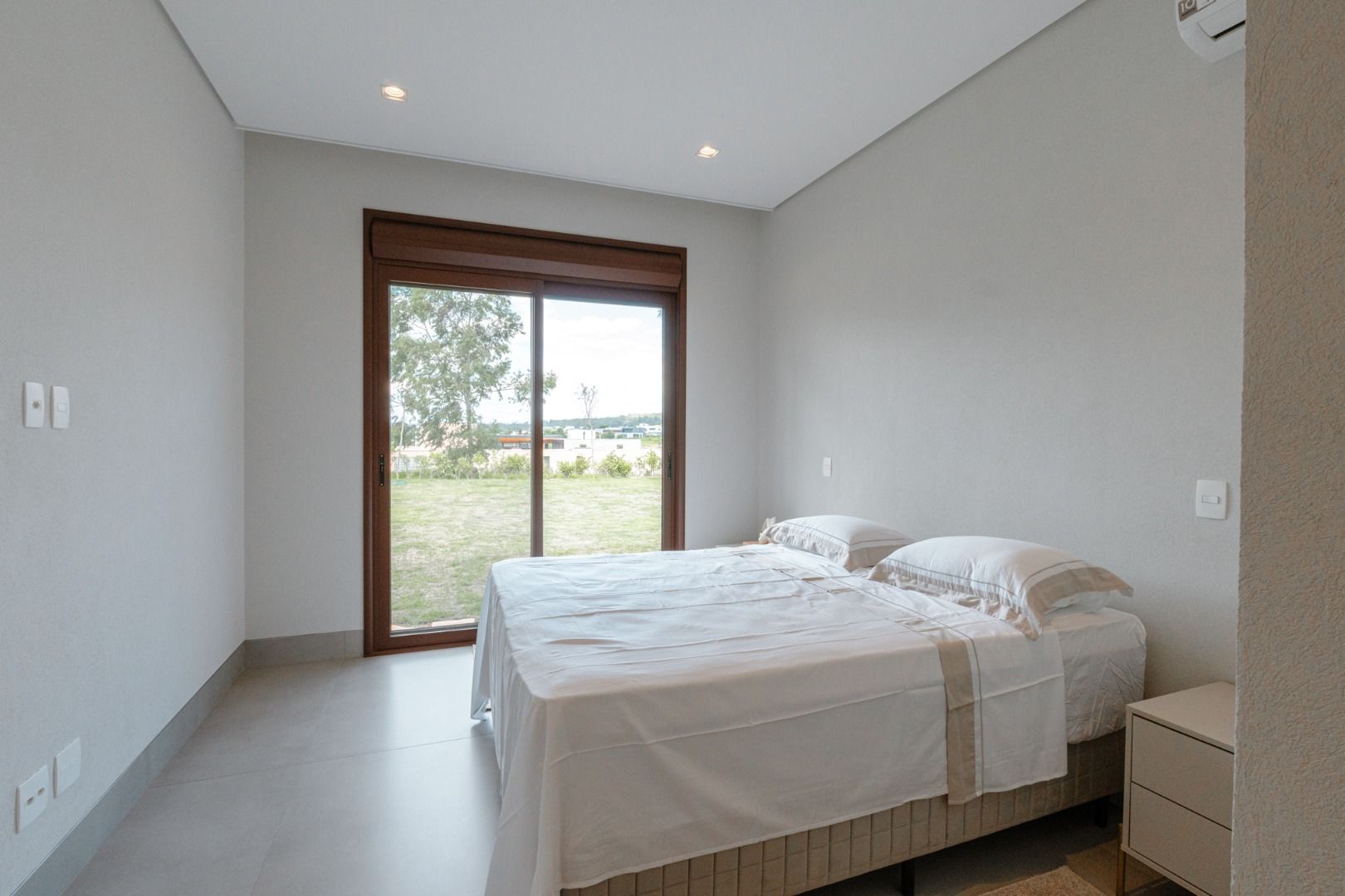 Dispõe de 5 suítes espaçosas, todas com vista para a área externa, incluindo uma suíte master com closet, chuveiros duplos e banheira de imersão. Sala de estar com pé-direito duplo, painel em madeira ripada e um charmoso lavabo com jardim interno. Espaço gourmet sofisticado, integrado à cozinha e com vista para a área de lazer, além de uma sala de TV anexa.
