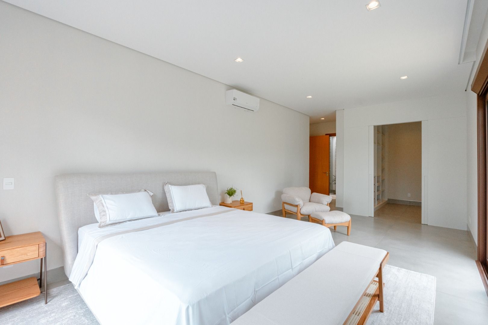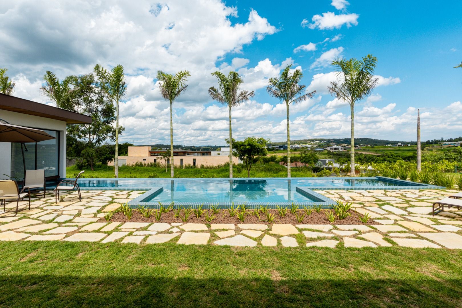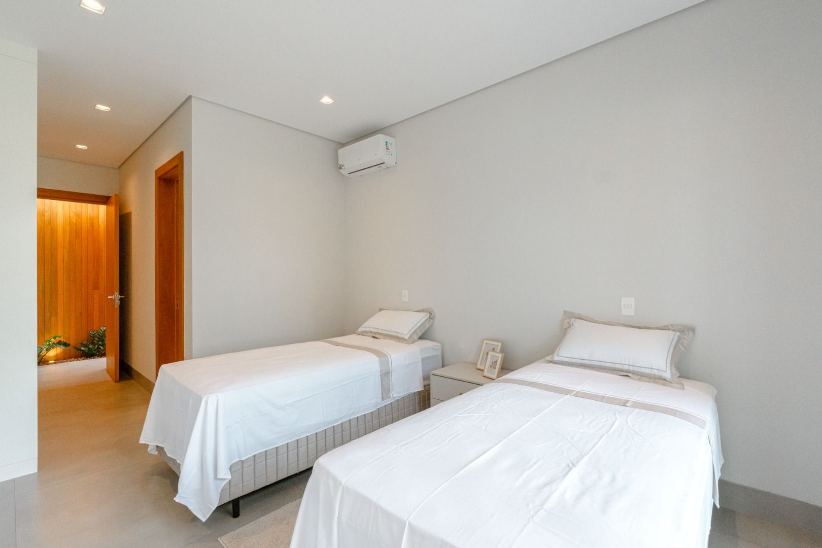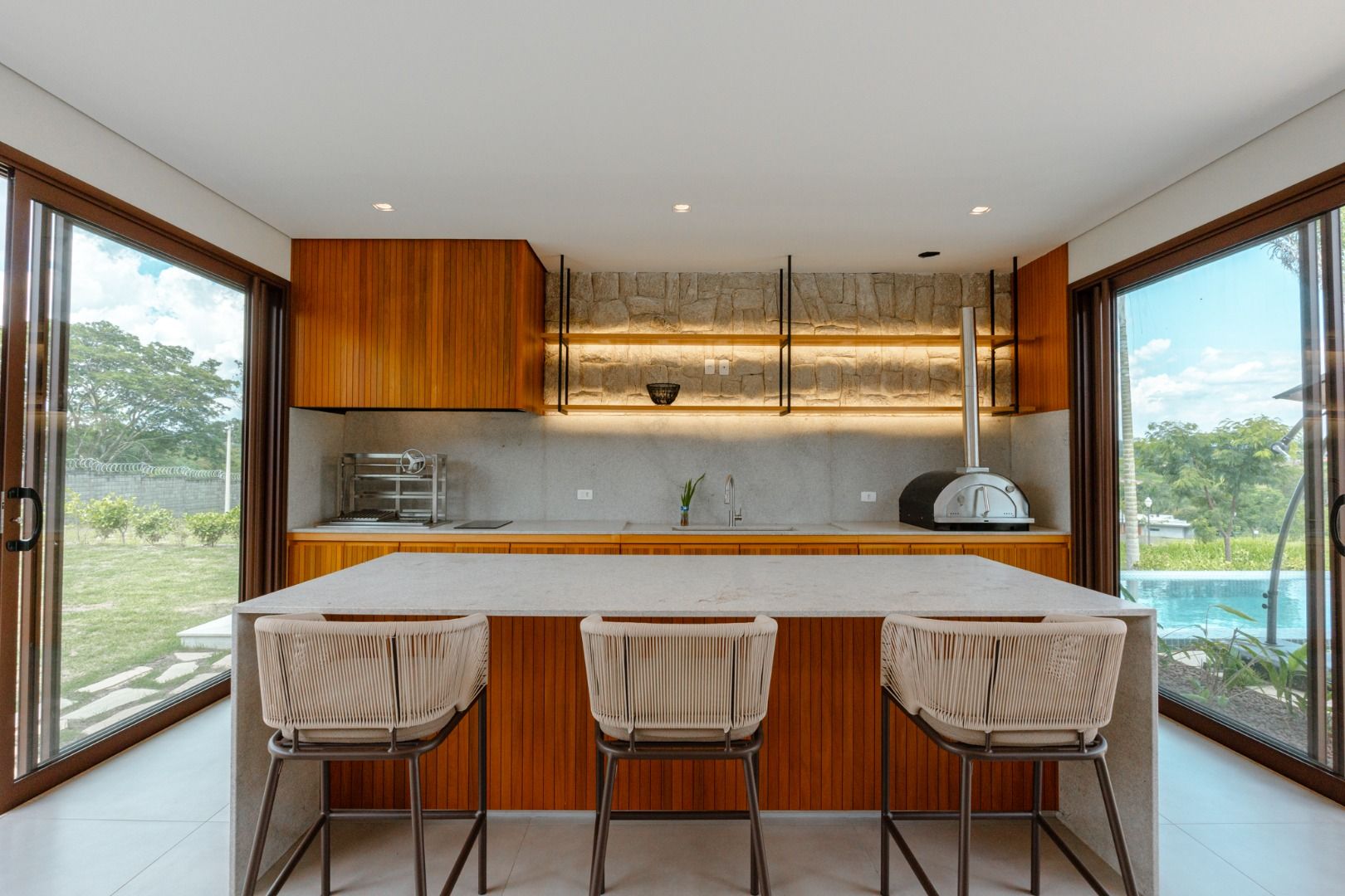 Dispõe de 5 suítes espaçosas, todas com vista para a área externa, incluindo uma suíte master com closet, chuveiros duplos e banheira de imersão. Sala de estar com pé-direito duplo, painel em madeira ripada e um charmoso lavabo com jardim interno. Espaço gourmet sofisticado, integrado à cozinha e com vista para a área de lazer, além de uma sala de TV anexa.