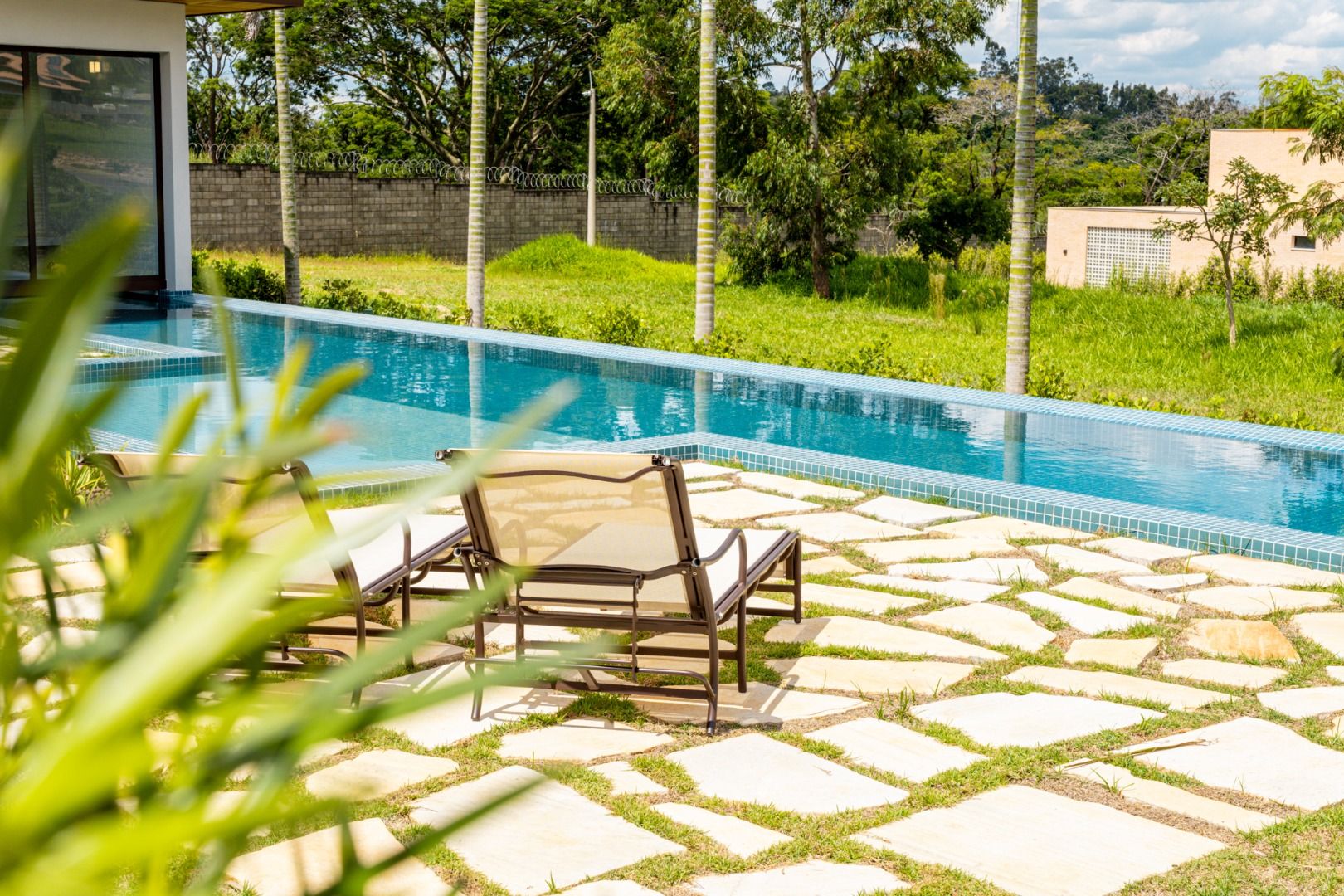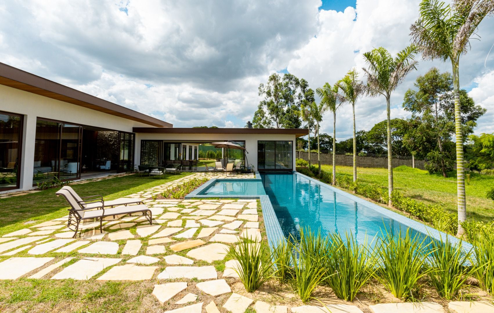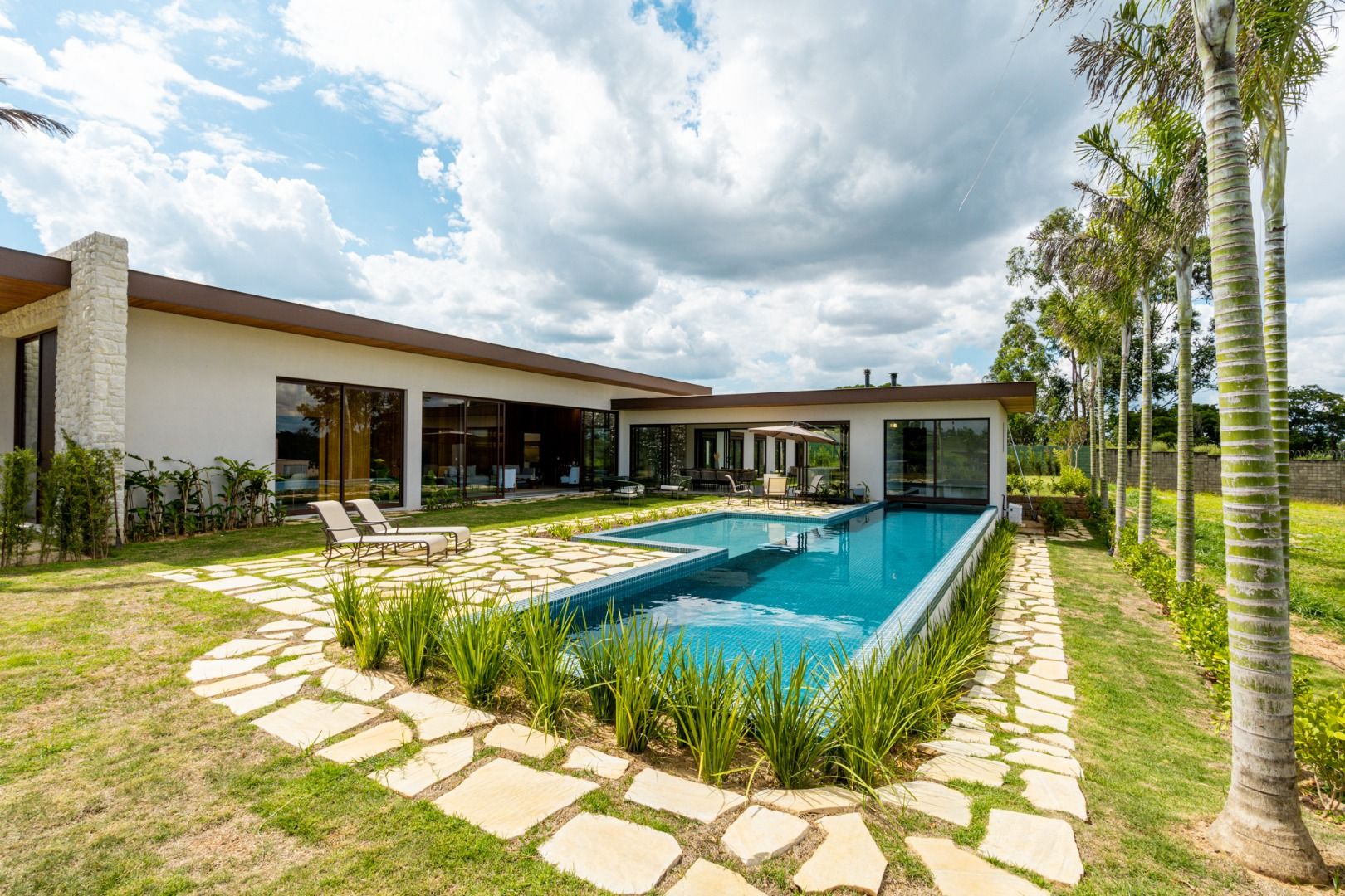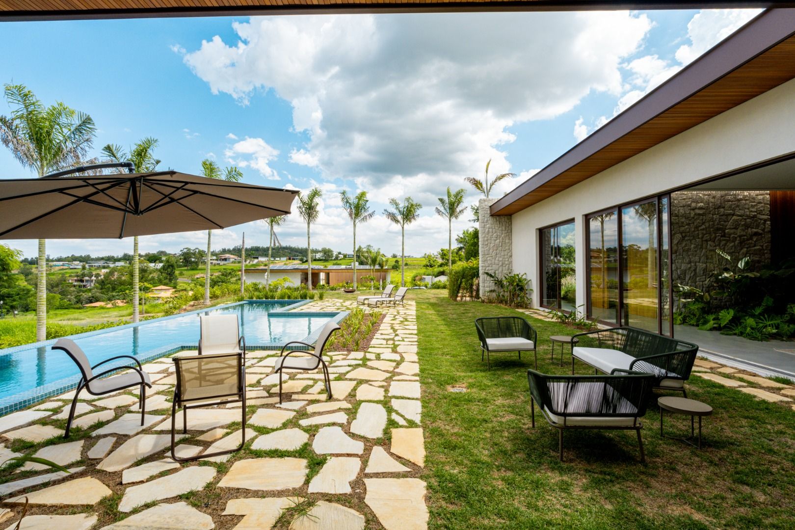 Área externa deslumbrante com piscina com raia, sauna e um amplo quintal gramado. O design contemporâneo utiliza madeira, pedras e vidros para proporcionar harmonia e sofisticação, criando ambientes aconchegantes e integrados com a natureza.