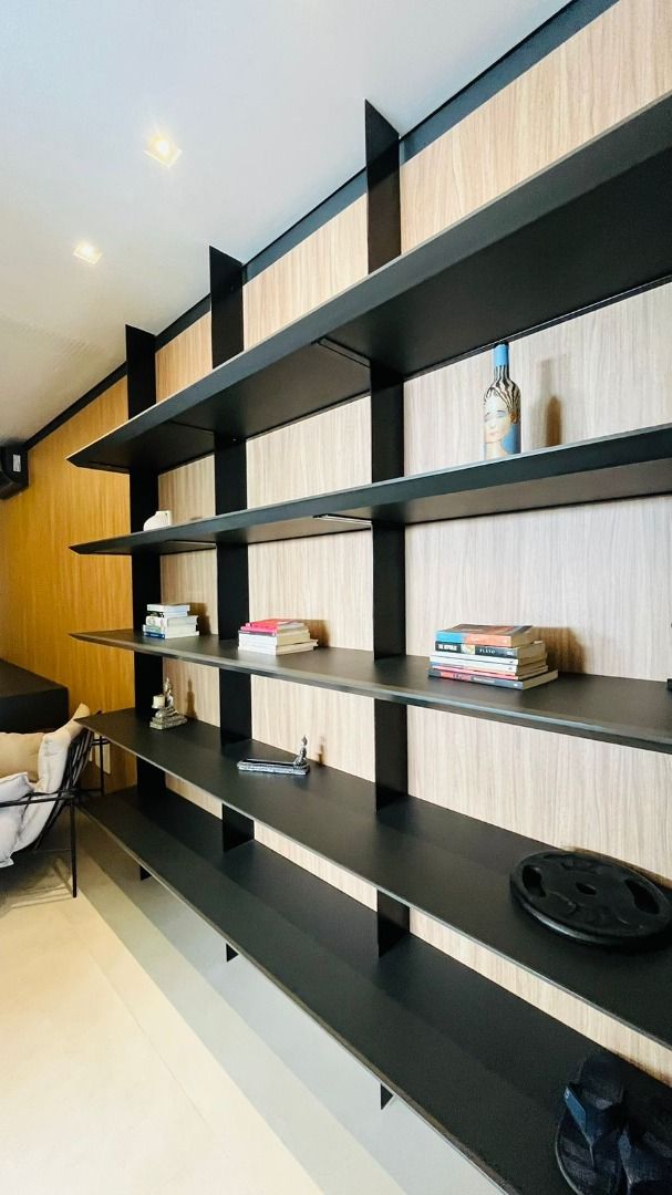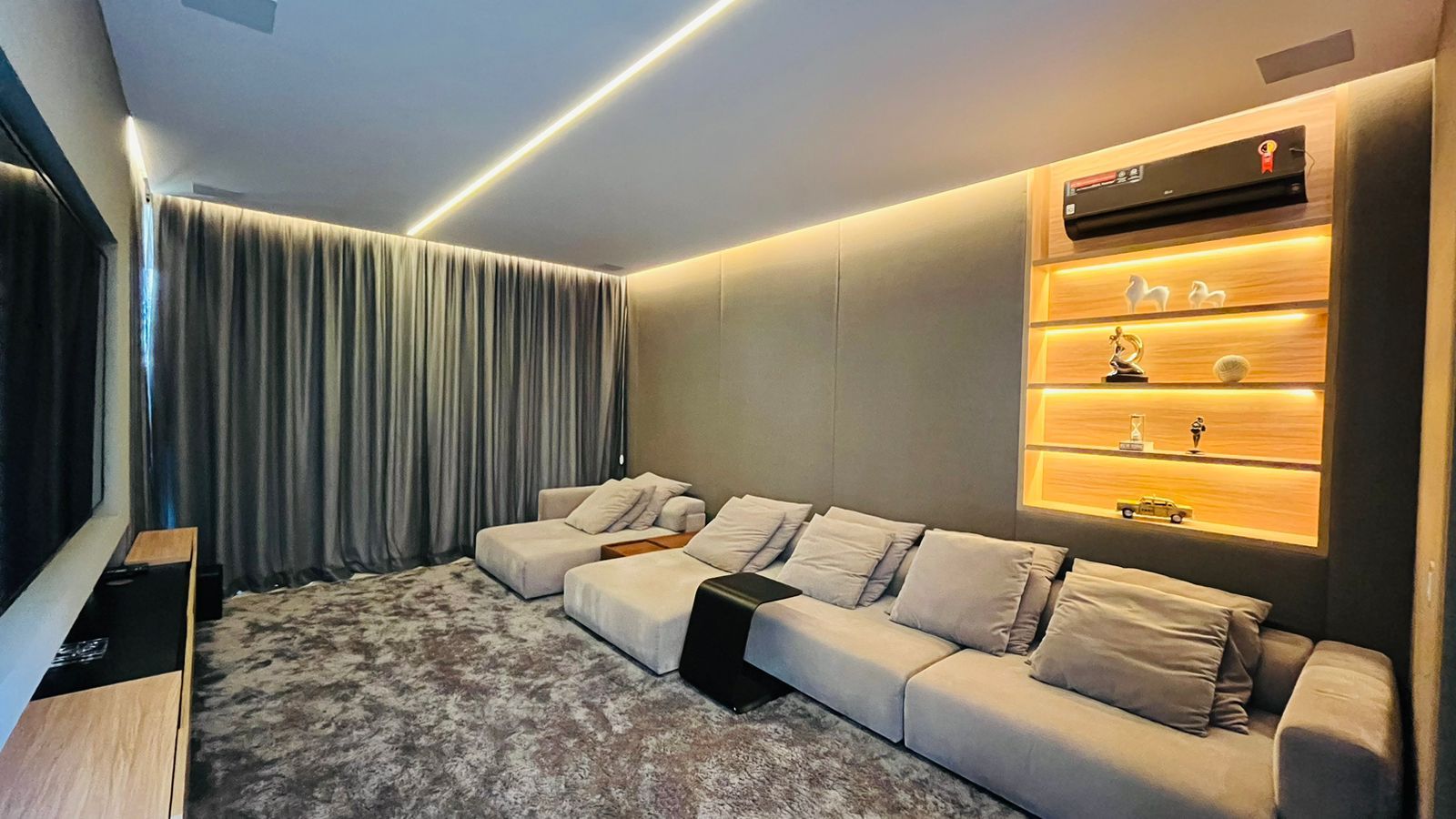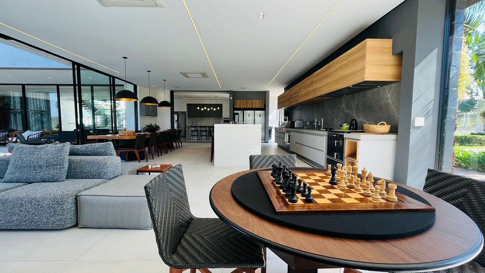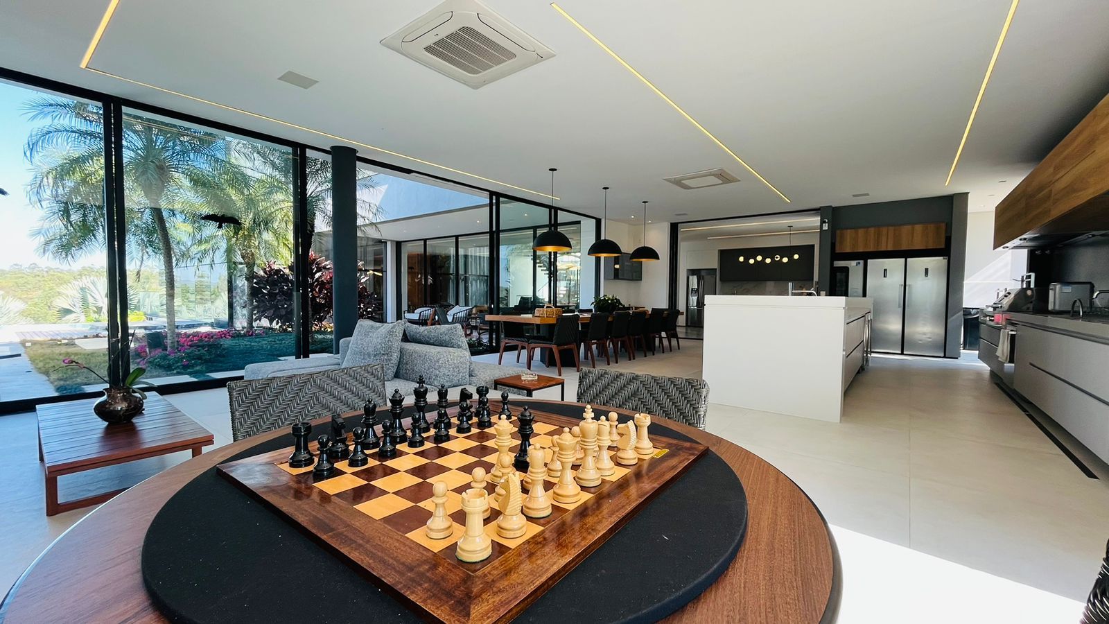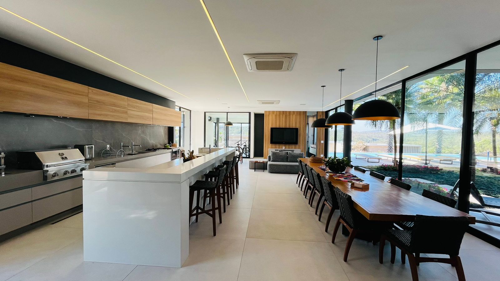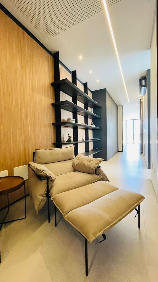 O amplo living com três ambientes proporciona uma experiência única de convivência, complementado por um home theater aconchegante e um escritório funcional.