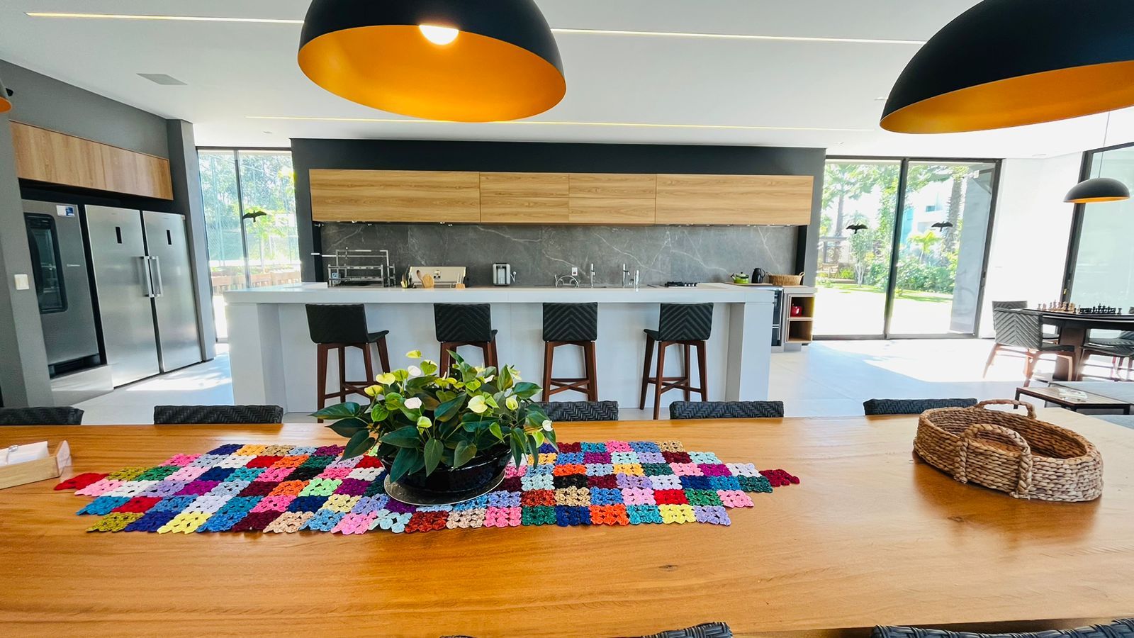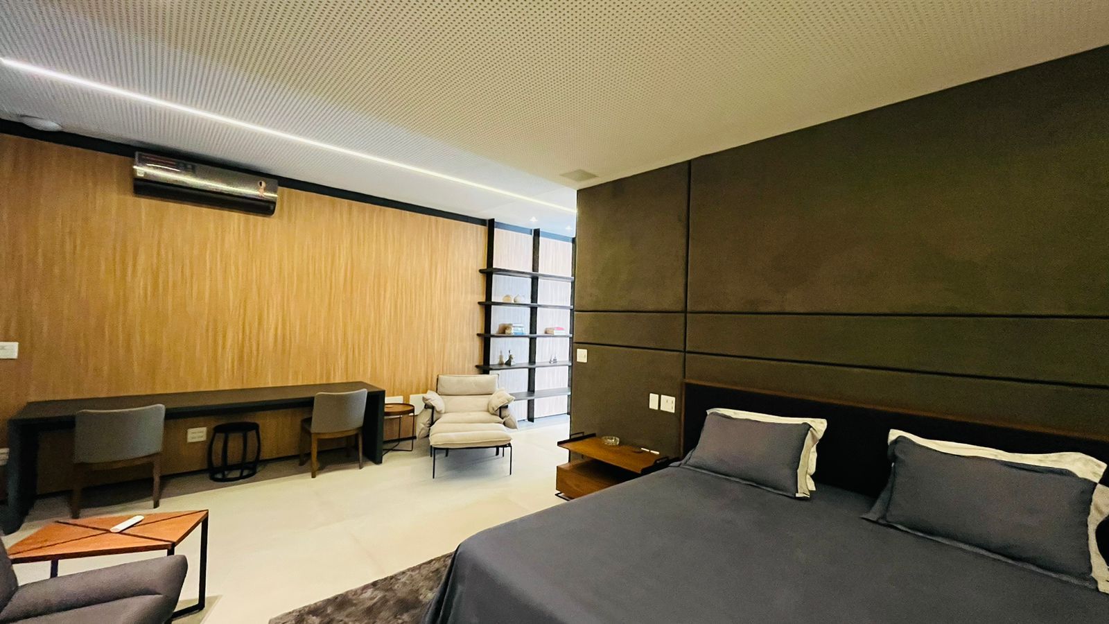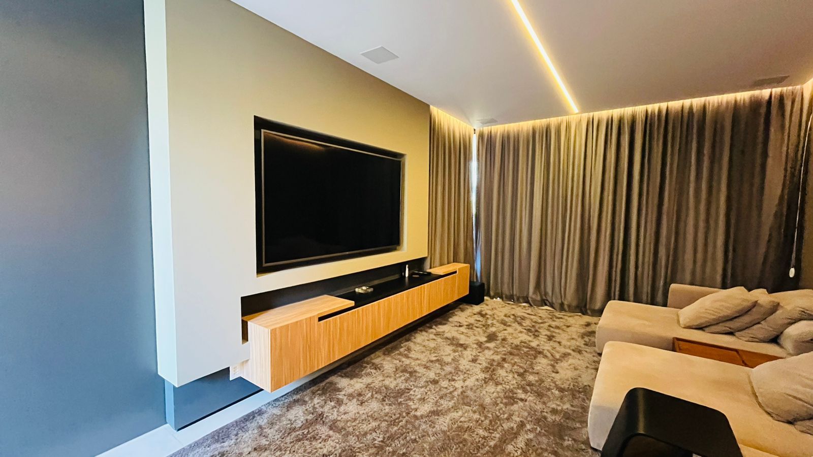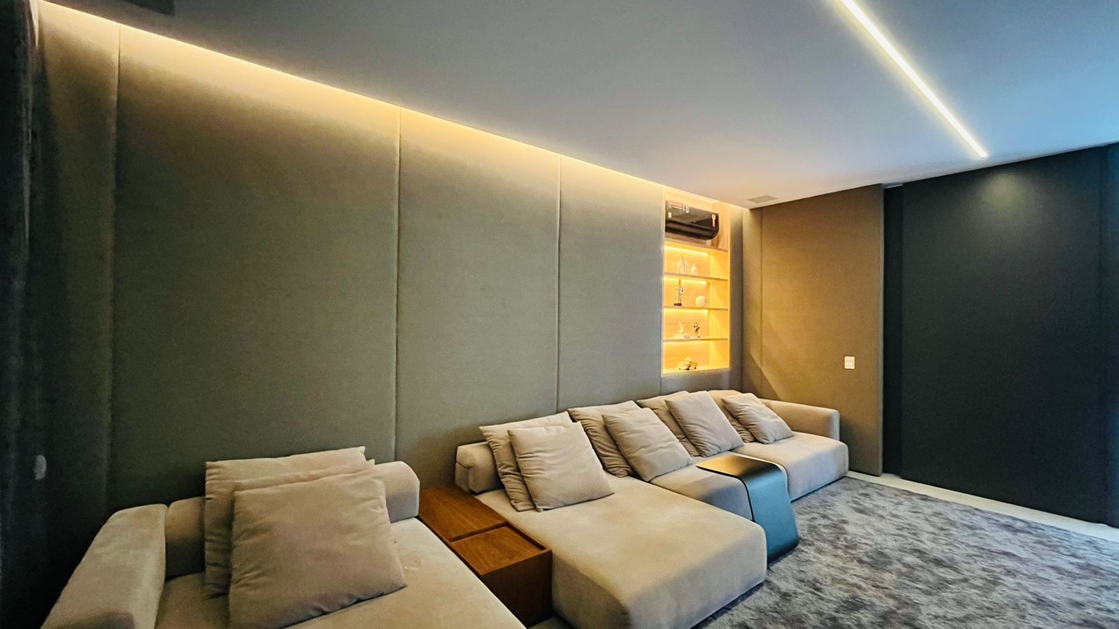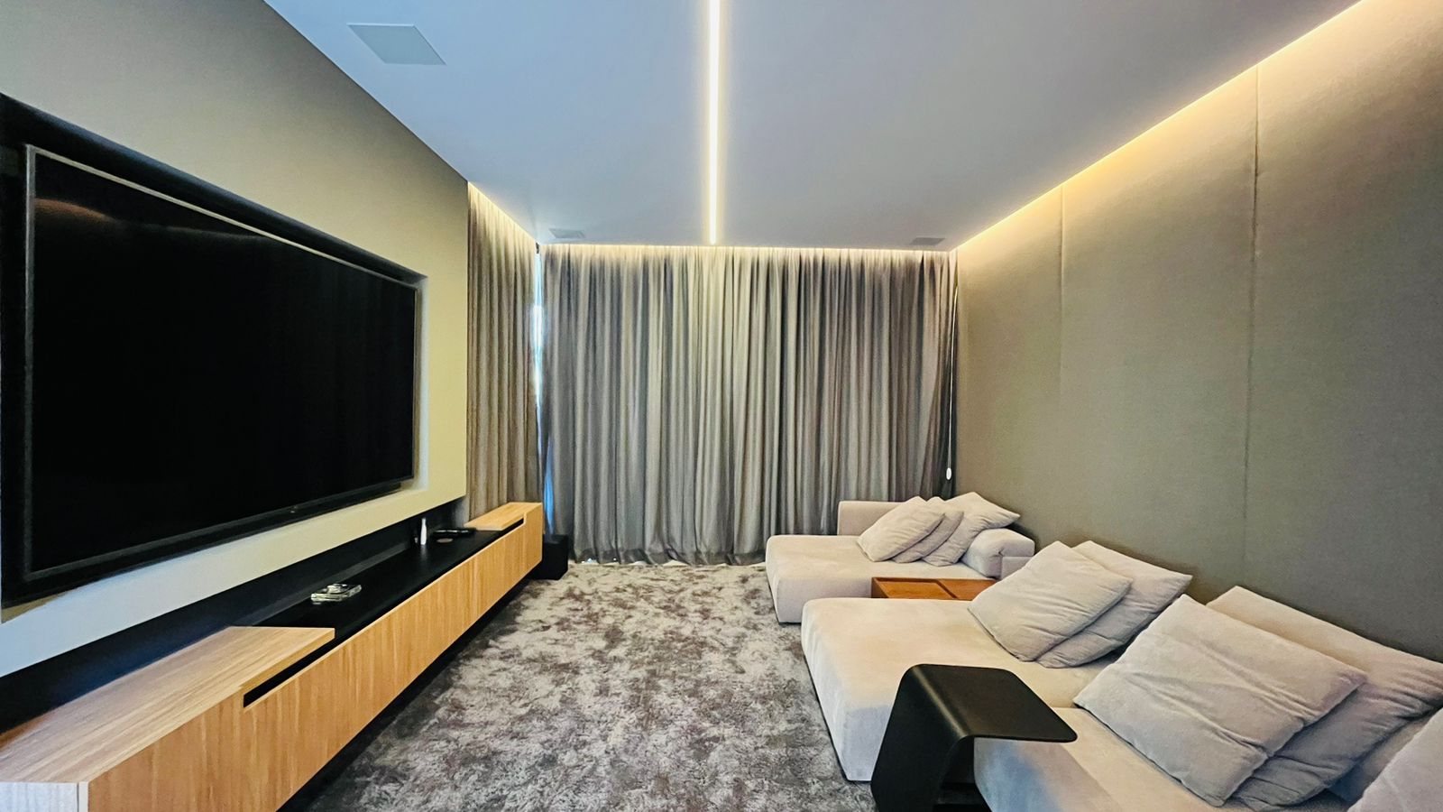 O amplo living com três ambientes proporciona uma experiência única de convivência, complementado por um home theater aconchegante e um escritório funcional.
