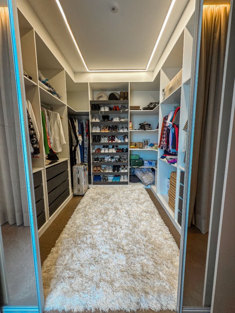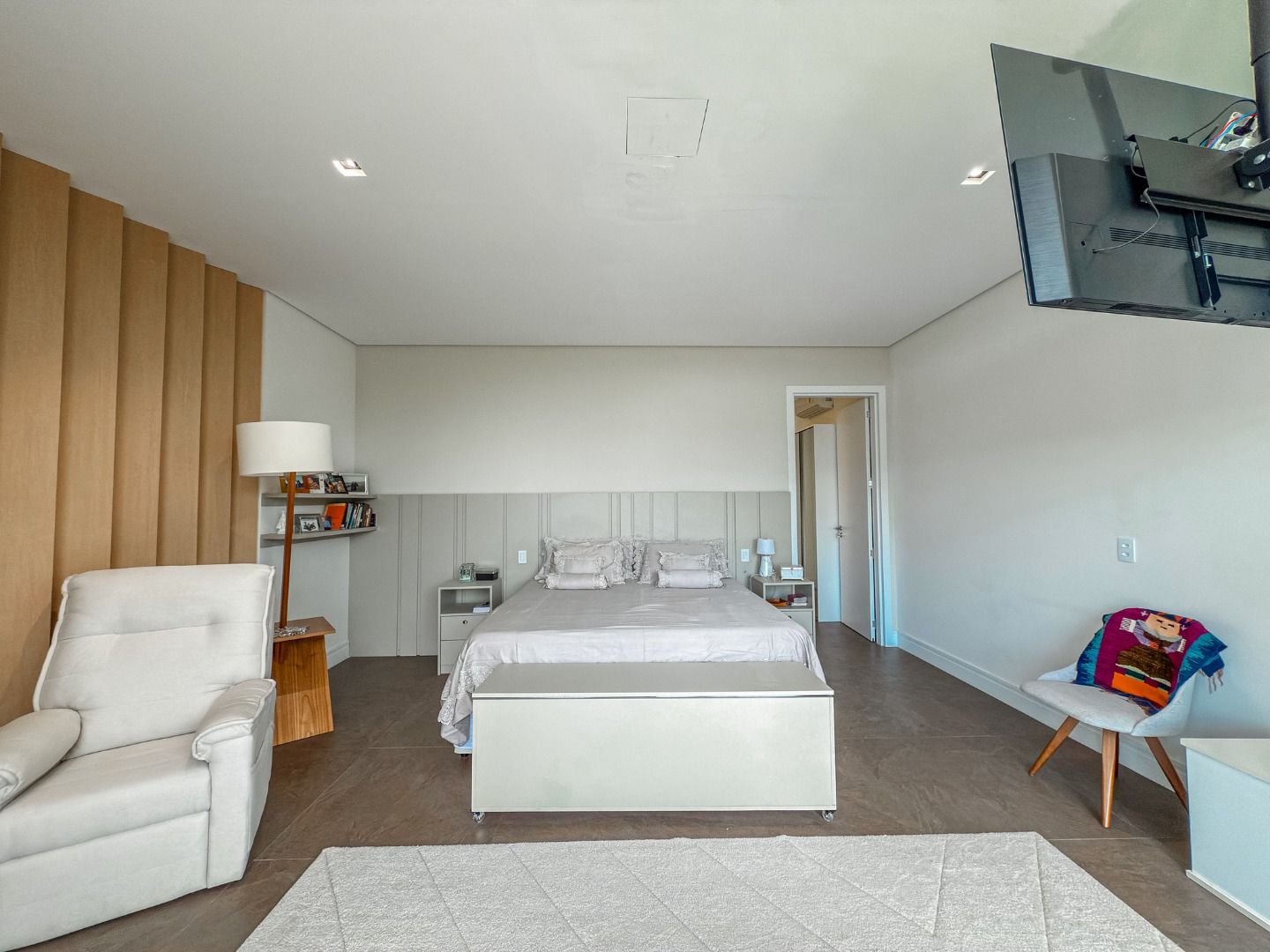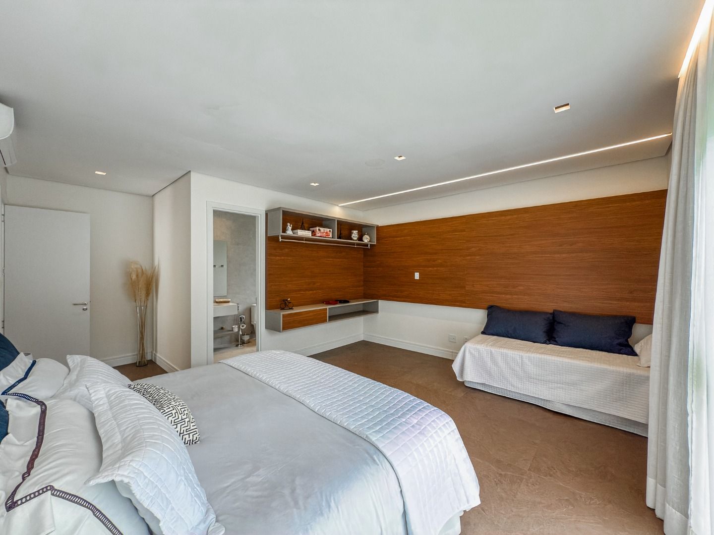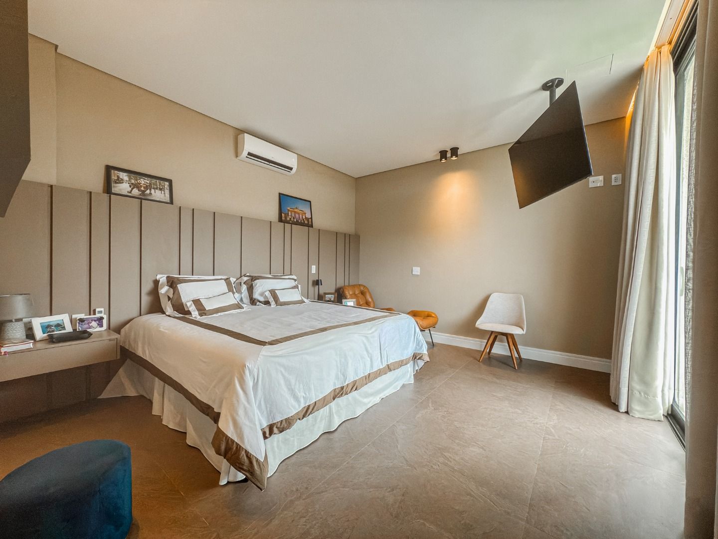 O piso superior acomoda quatro suítes espaçosas, com acabamentos de alto padrão, além de roupeiro e copa de apoio.