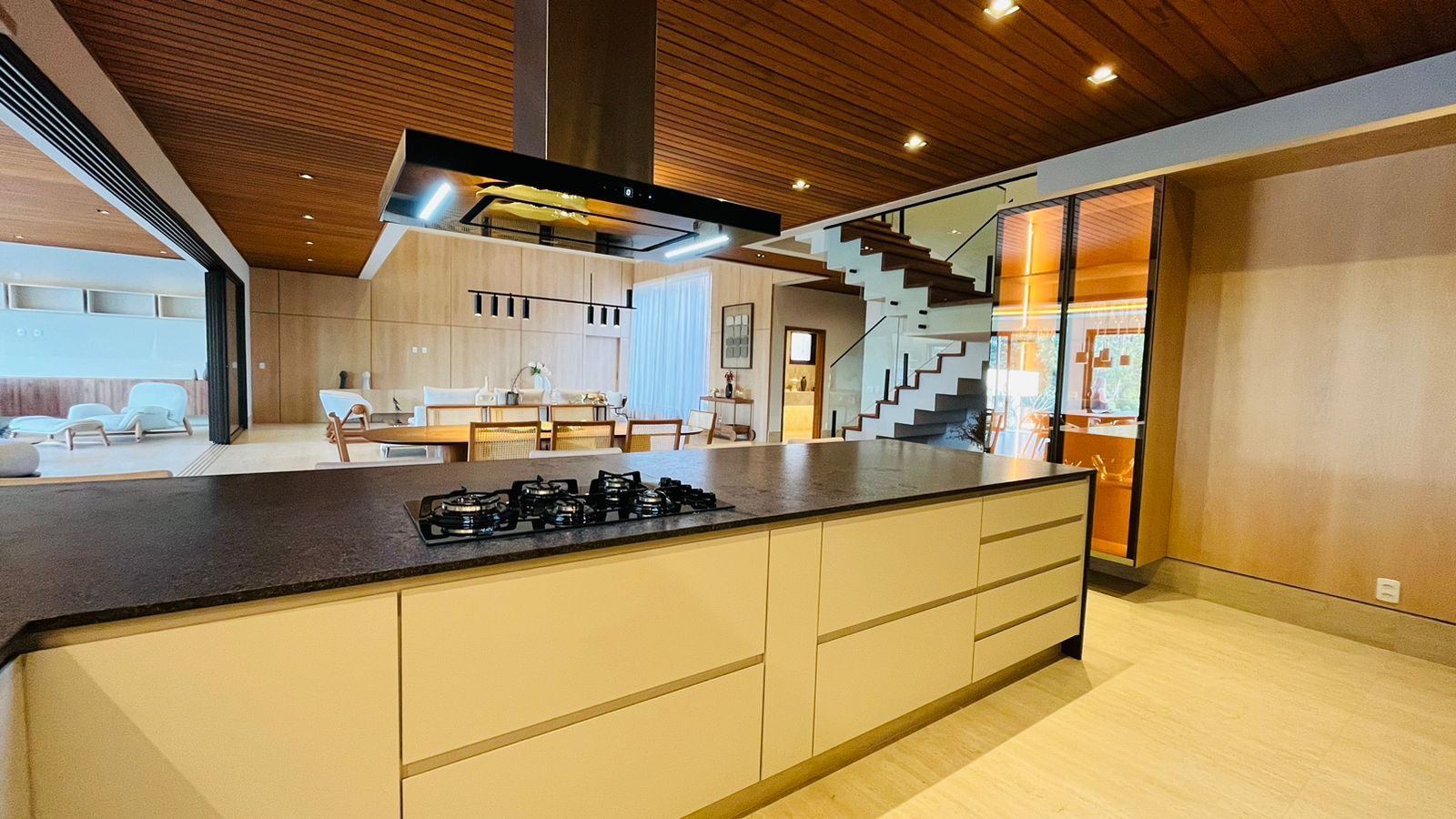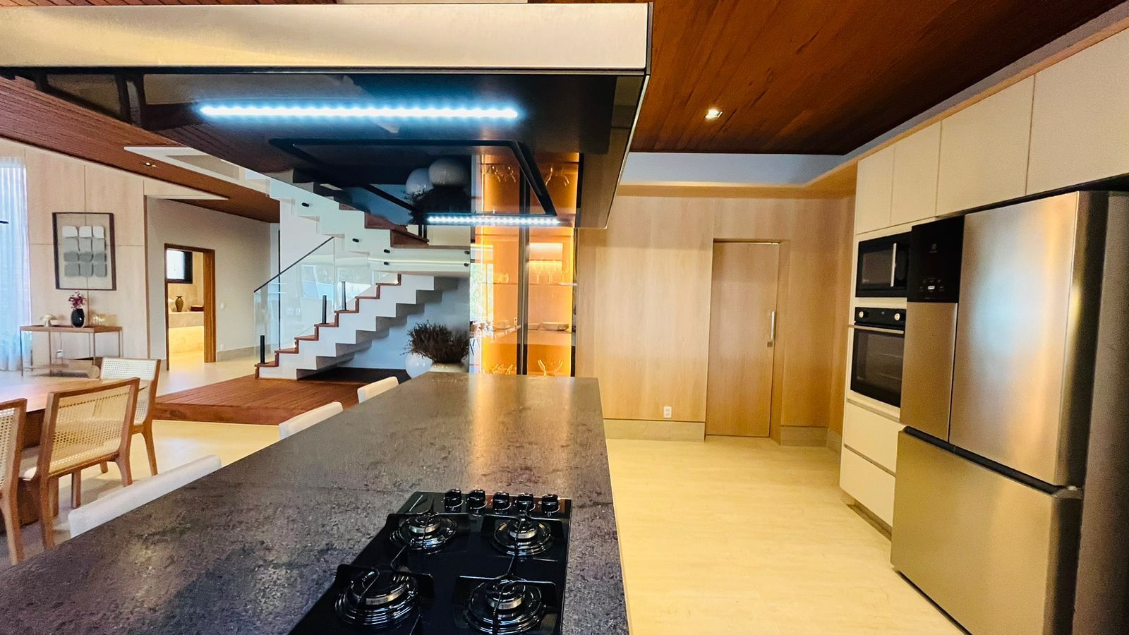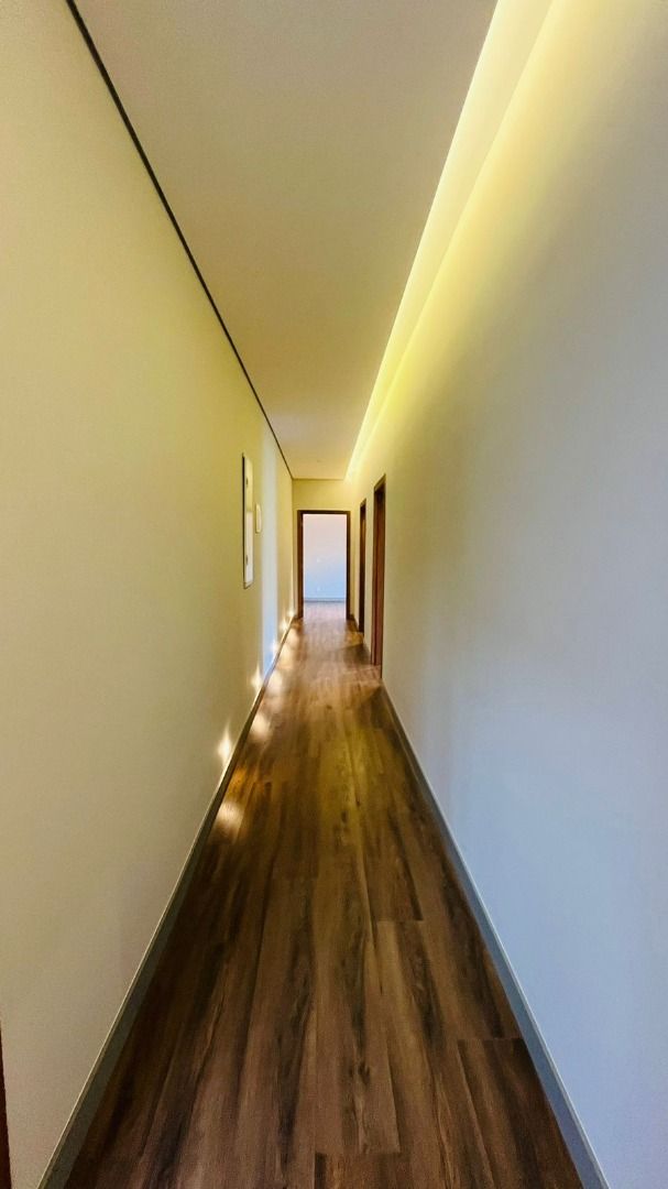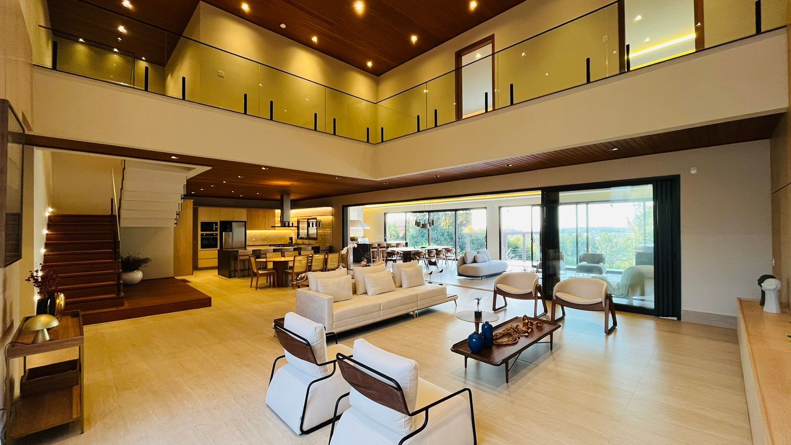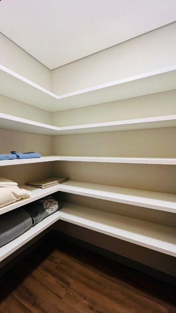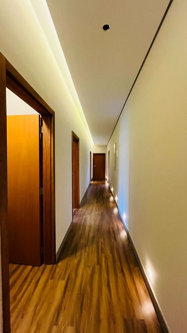 A área de convivência integrada inclui salas de estar, jantar, cozinha com ilha, despensa, lavabo e lavanderia. O imóvel dispõe de 7 dormitórios, sendo 6 suítes amplas e acessíveis, incluindo uma suíte master com closet e vista para a área verde. Conta ainda com quarto de empregada, banheiro, academia, sistema de energia padrão C5, torneiras e chuveiros monocomando, persianas automatizadas e telas mosquiteiras nos quartos e banheiros.