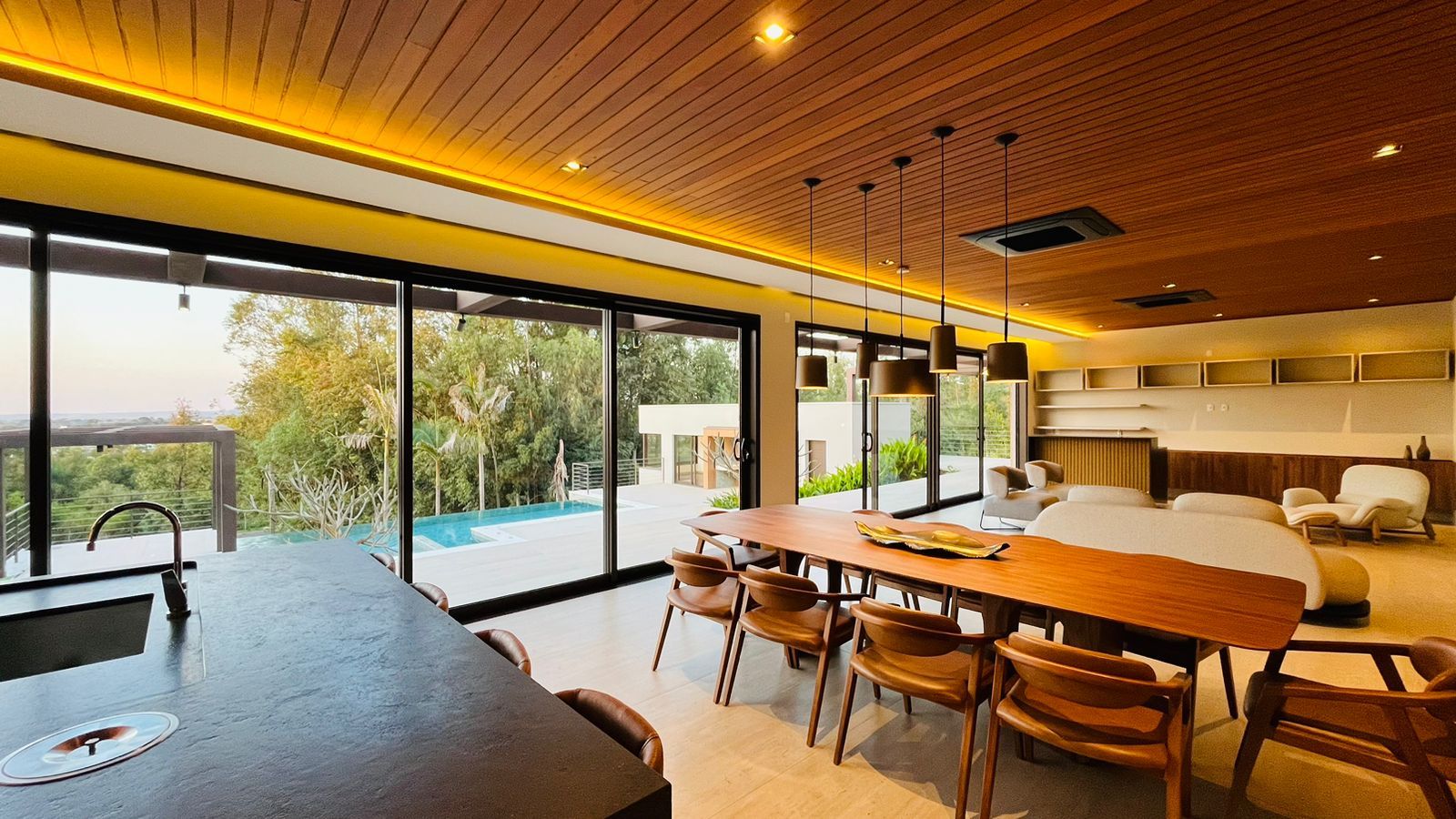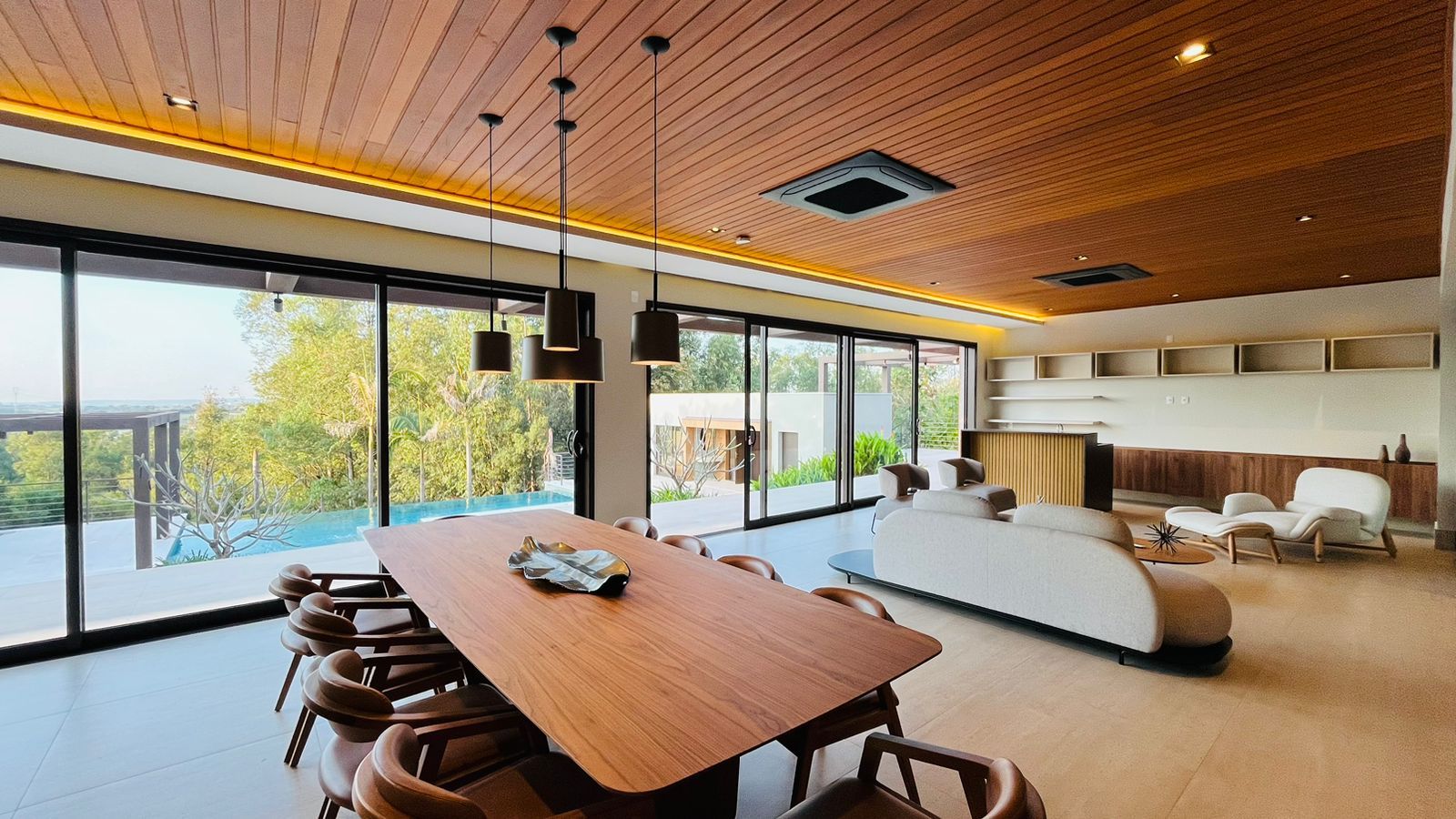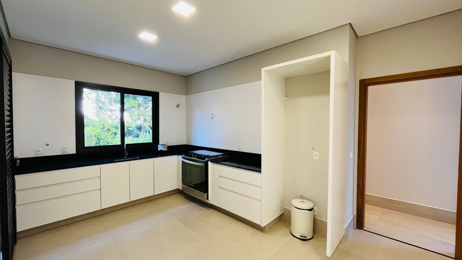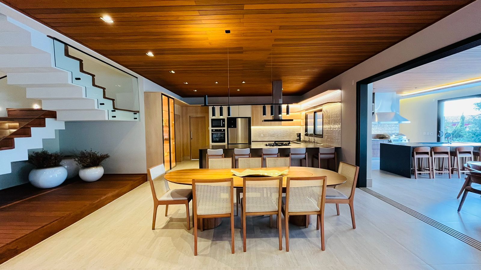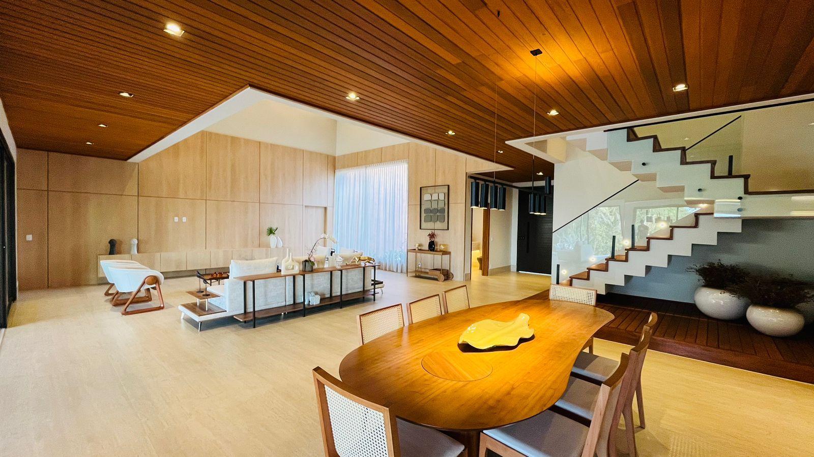 A área de convivência integrada inclui salas de estar, jantar, cozinha com ilha, despensa, lavabo e lavanderia. O imóvel dispõe de 7 dormitórios, sendo 6 suítes amplas e acessíveis, incluindo uma suíte master com closet e vista para a área verde. Conta ainda com quarto de empregada, banheiro, academia, sistema de energia padrão C5, torneiras e chuveiros monocomando, persianas automatizadas e telas mosquiteiras nos quartos e banheiros.