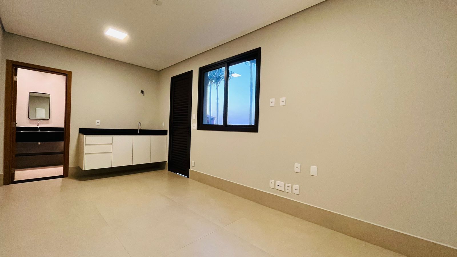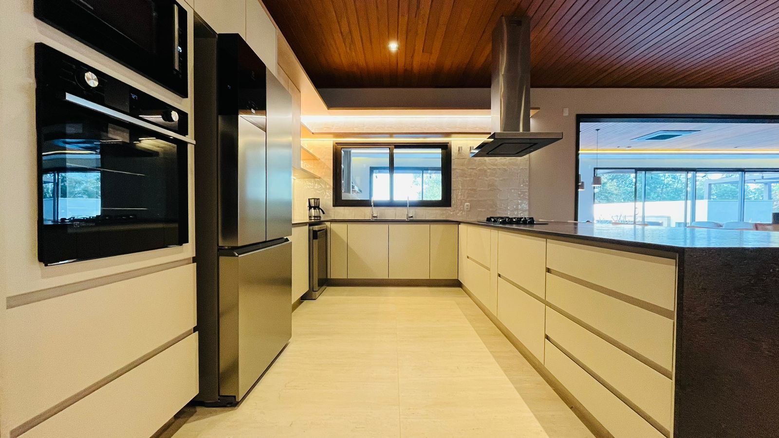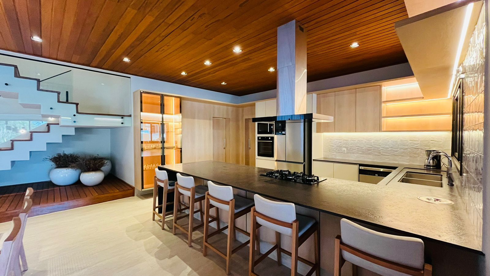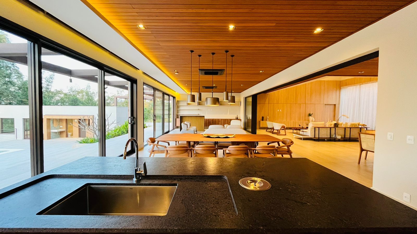 A área de convivência integrada inclui salas de estar, jantar, cozinha com ilha, despensa, lavabo e lavanderia. O imóvel dispõe de 7 dormitórios, sendo 6 suítes amplas e acessíveis, incluindo uma suíte master com closet e vista para a área verde. Conta ainda com quarto de empregada, banheiro, academia, sistema de energia padrão C5, torneiras e chuveiros monocomando, persianas automatizadas e telas mosquiteiras nos quartos e banheiros.