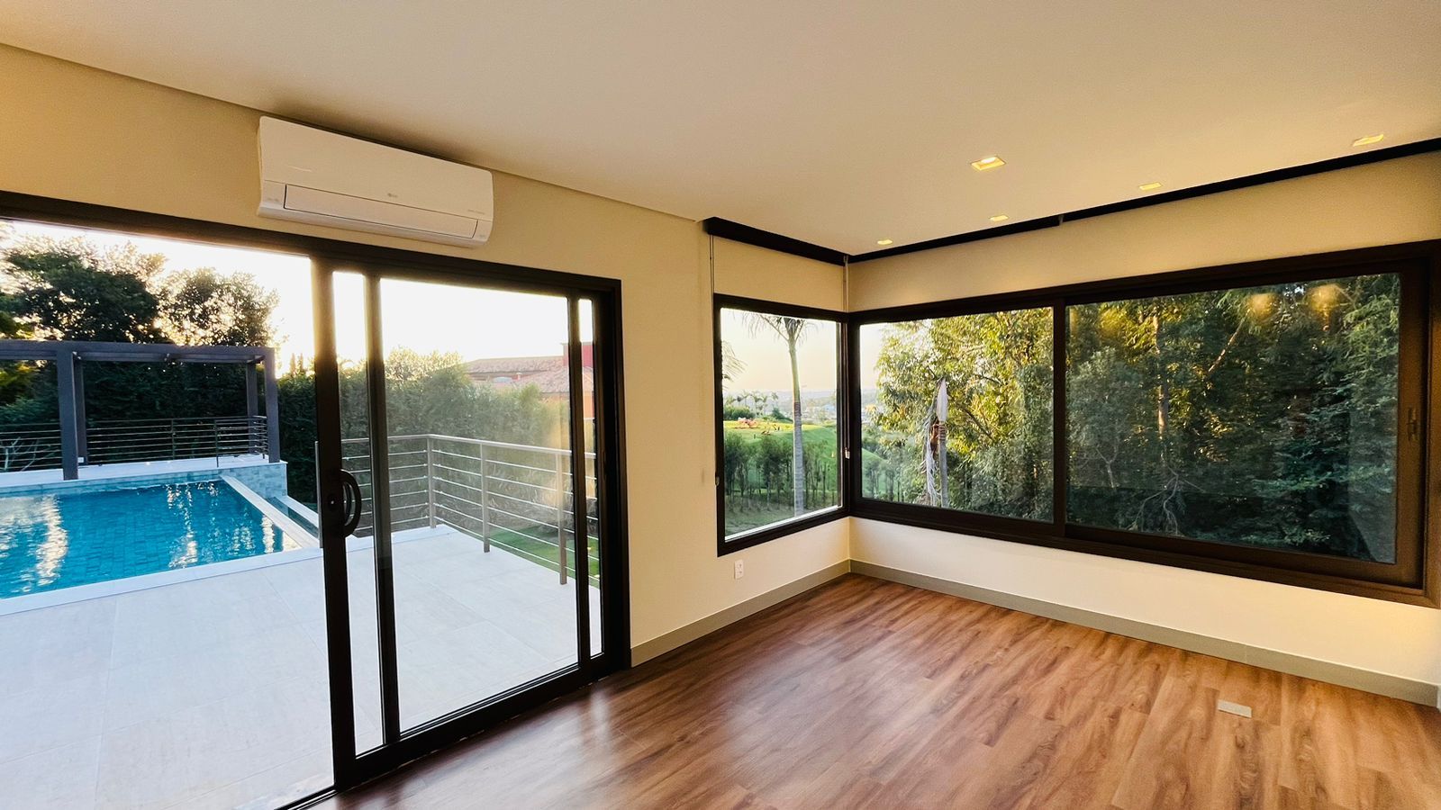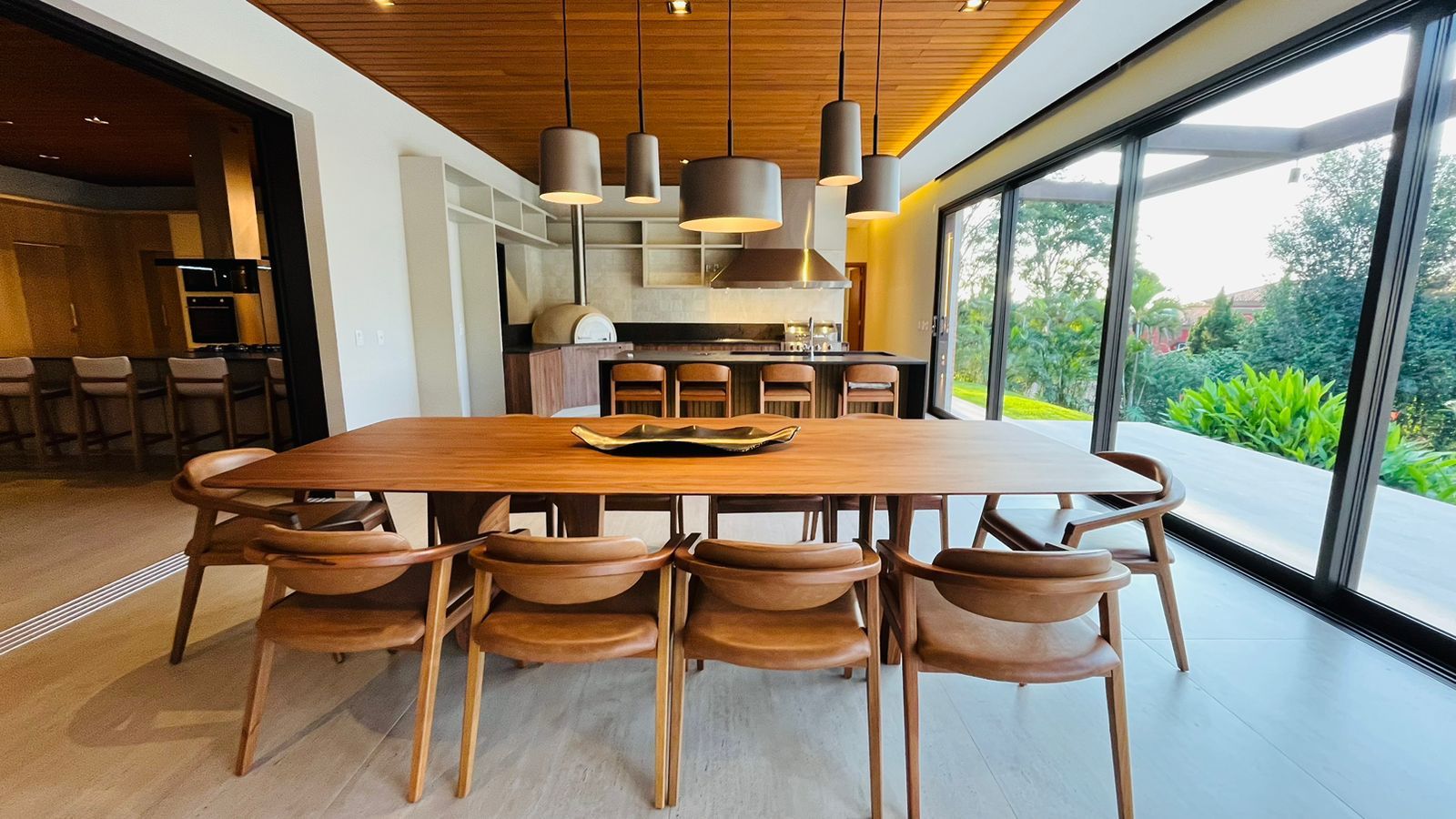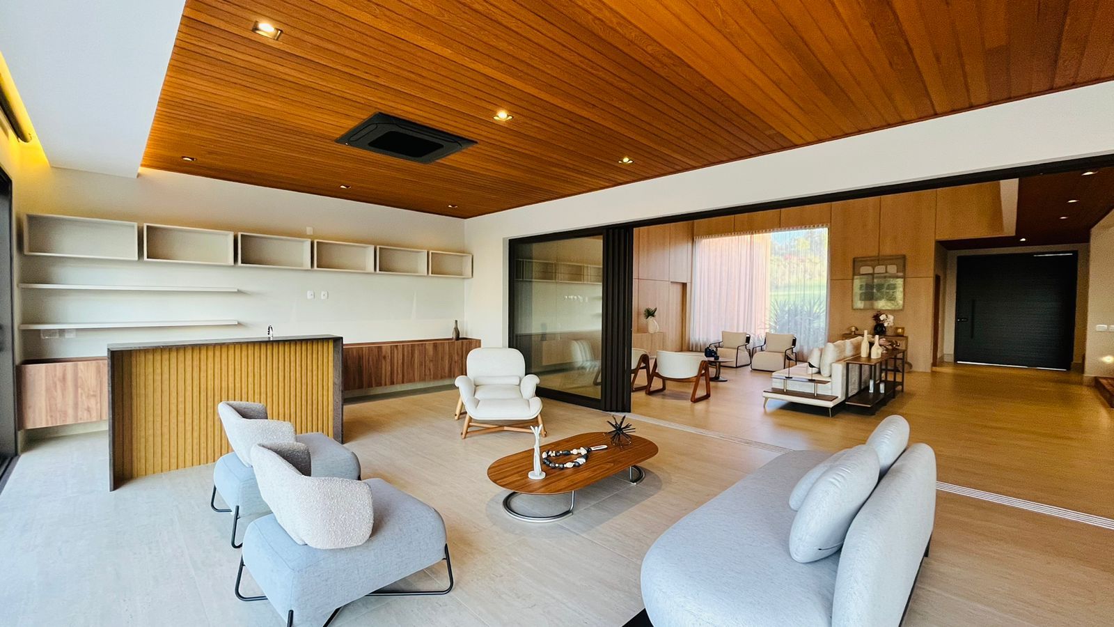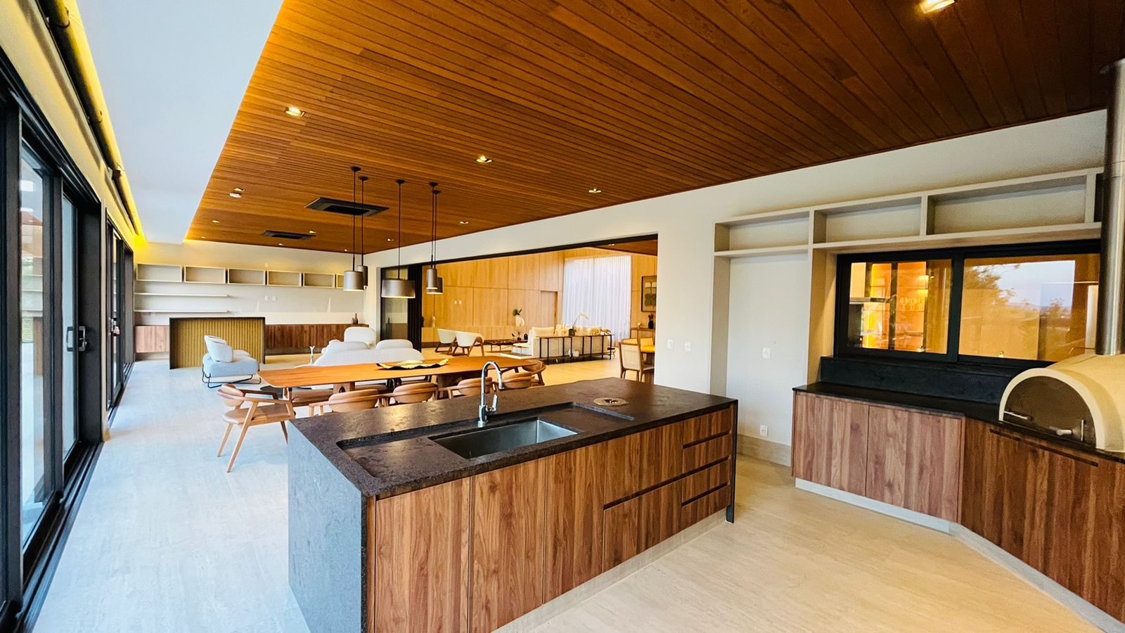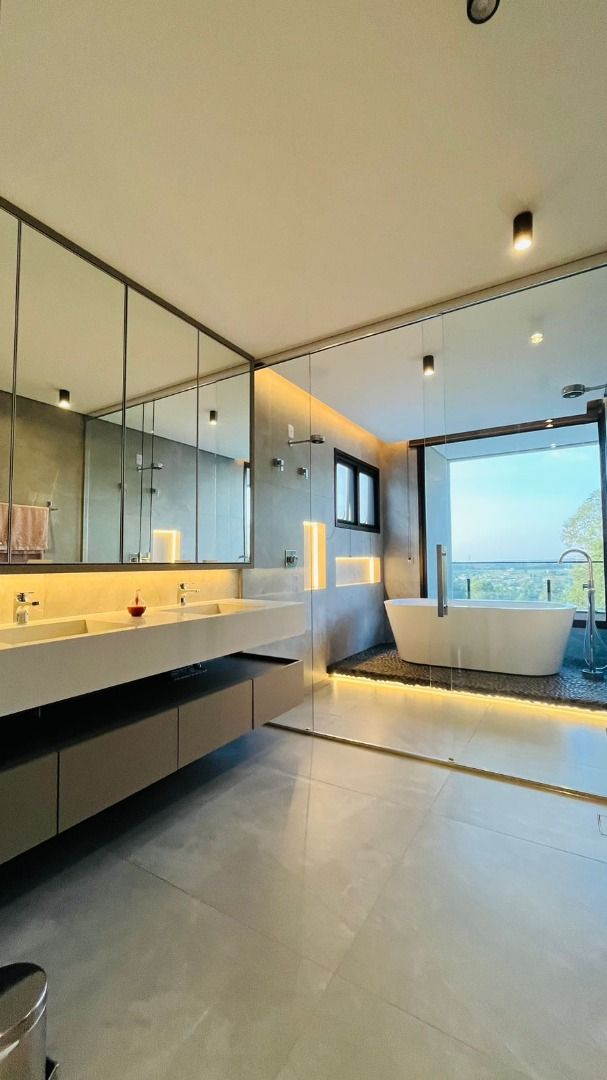 A área de convivência integrada inclui salas de estar, jantar, cozinha com ilha, despensa, lavabo e lavanderia. O imóvel dispõe de 7 dormitórios, sendo 6 suítes amplas e acessíveis, incluindo uma suíte master com closet e vista para a área verde. Conta ainda com quarto de empregada, banheiro, academia, sistema de energia padrão C5, torneiras e chuveiros monocomando, persianas automatizadas e telas mosquiteiras nos quartos e banheiros.