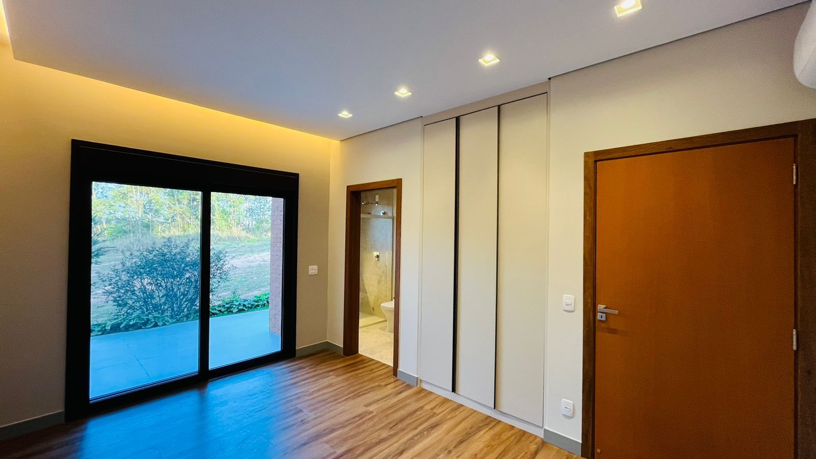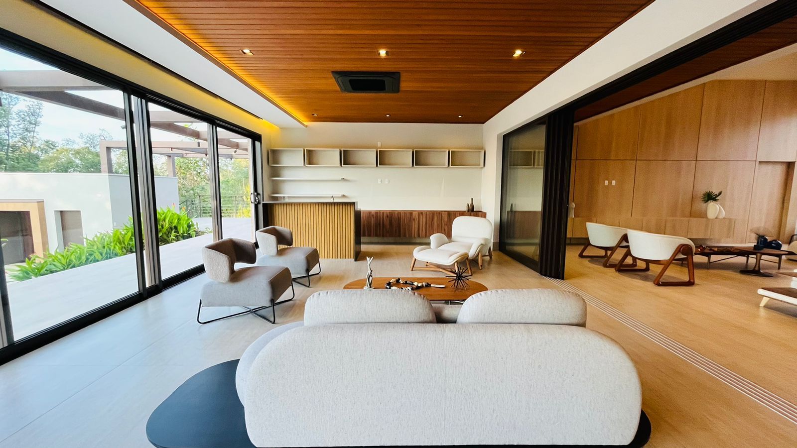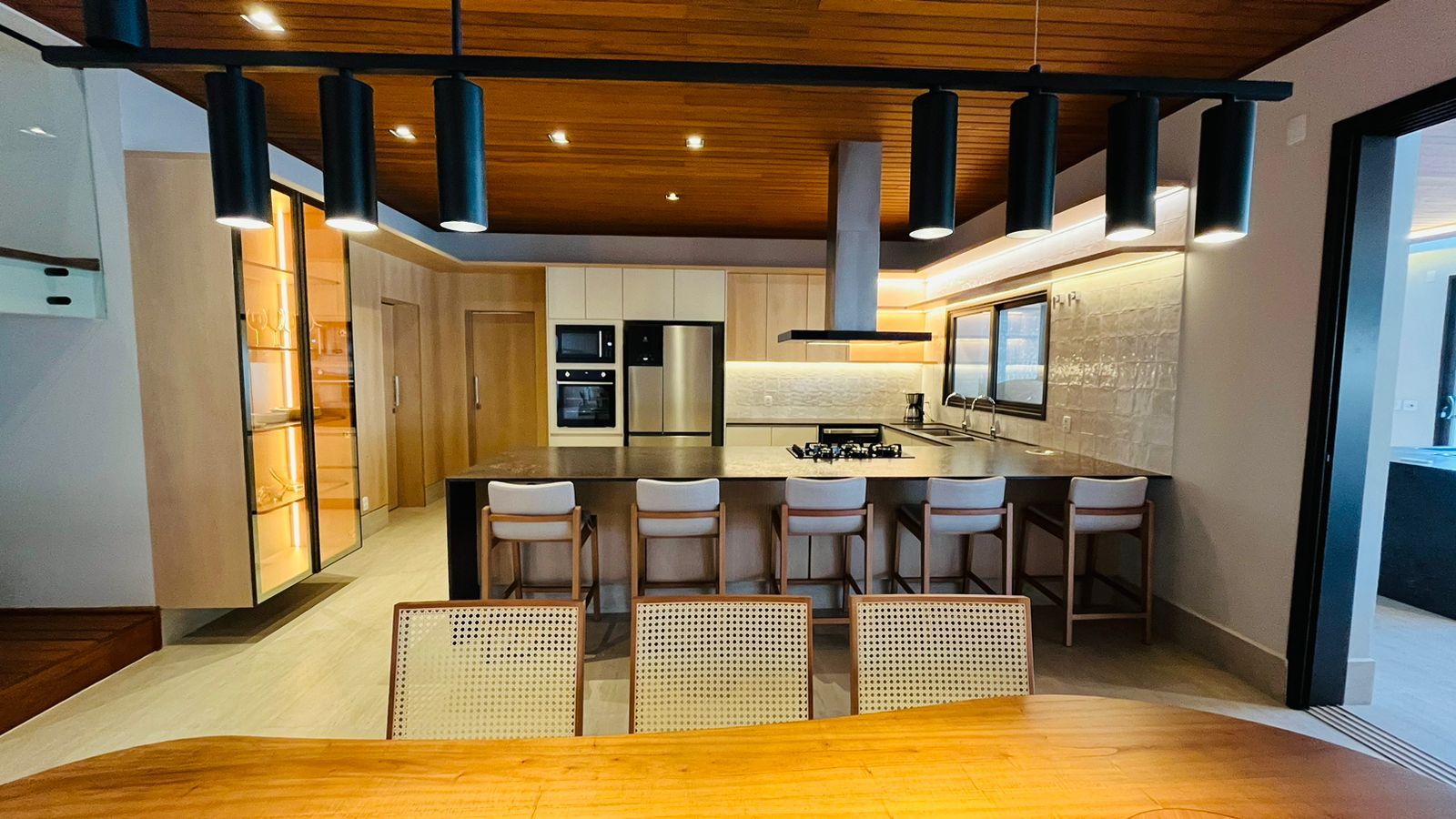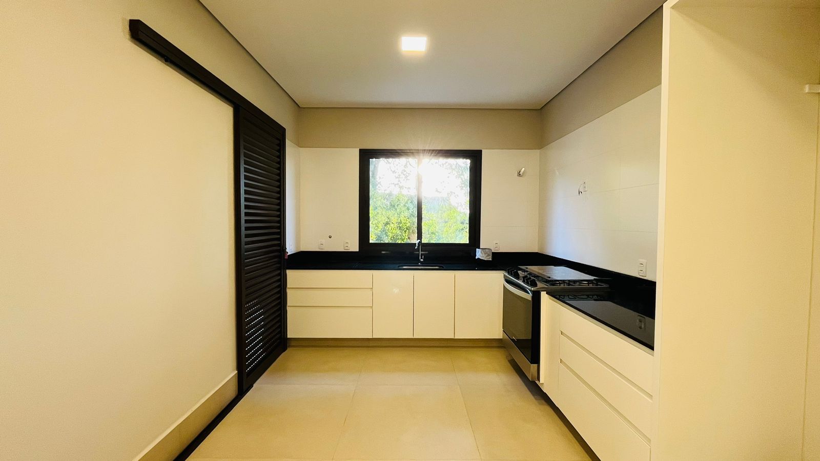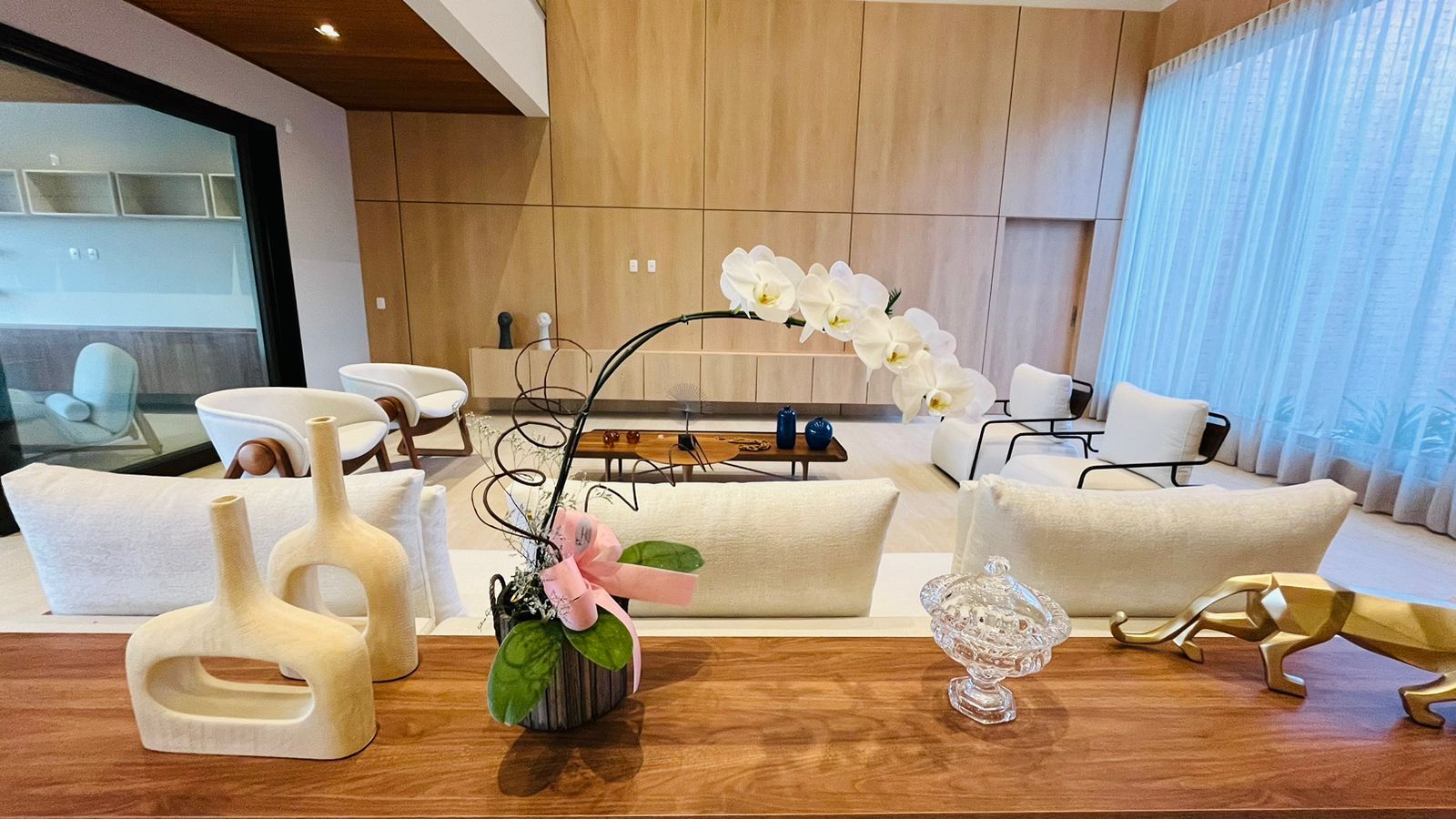 A área de convivência integrada inclui salas de estar, jantar, cozinha com ilha, despensa, lavabo e lavanderia. O imóvel dispõe de 7 dormitórios, sendo 6 suítes amplas e acessíveis, incluindo uma suíte master com closet e vista para a área verde. Conta ainda com quarto de empregada, banheiro, academia, sistema de energia padrão C5, torneiras e chuveiros monocomando, persianas automatizadas e telas mosquiteiras nos quartos e banheiros.