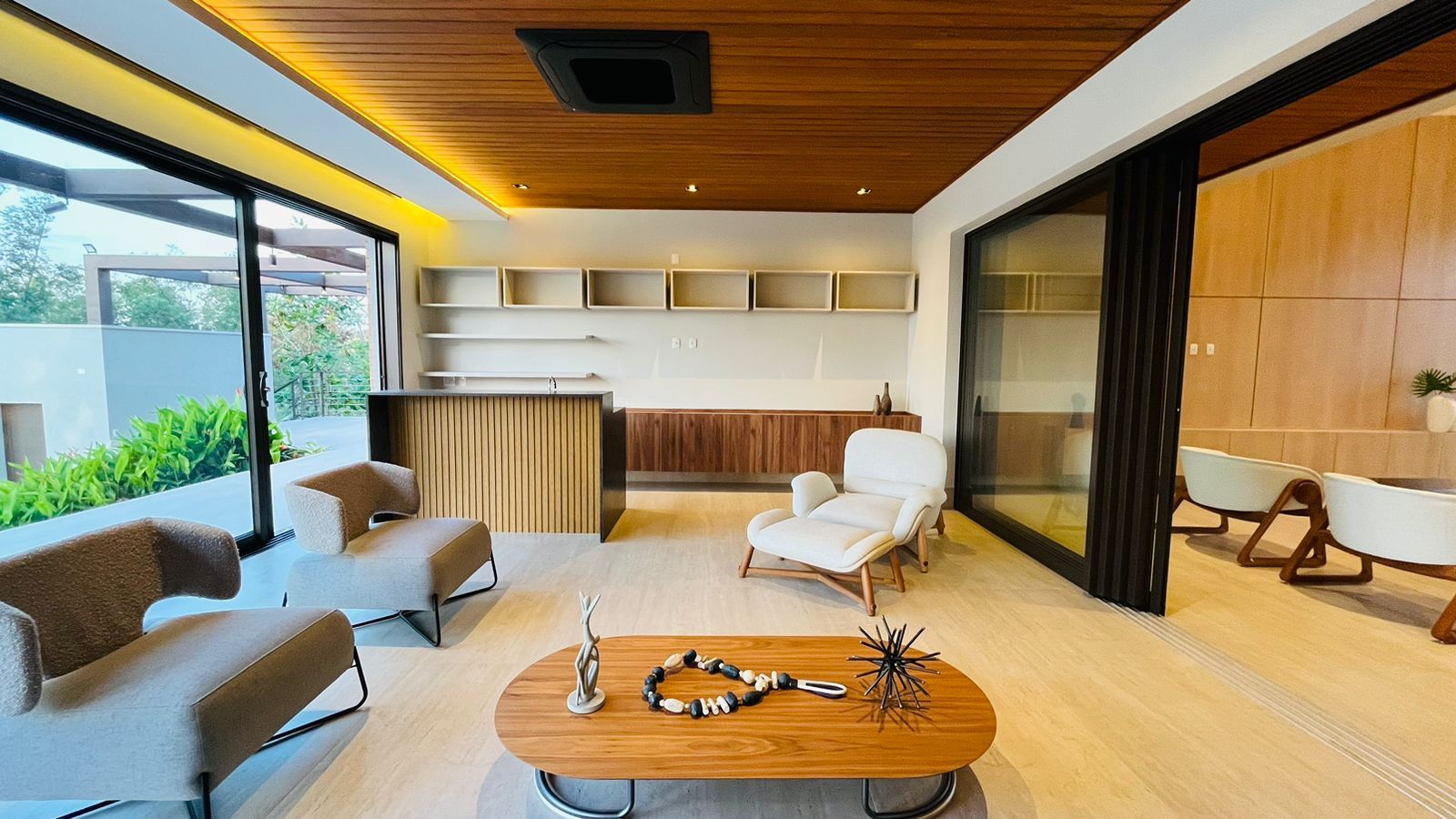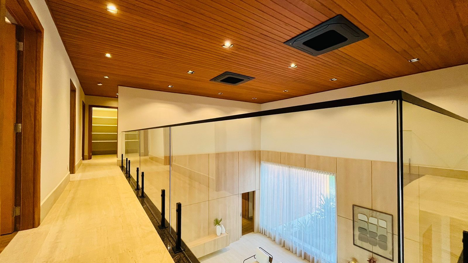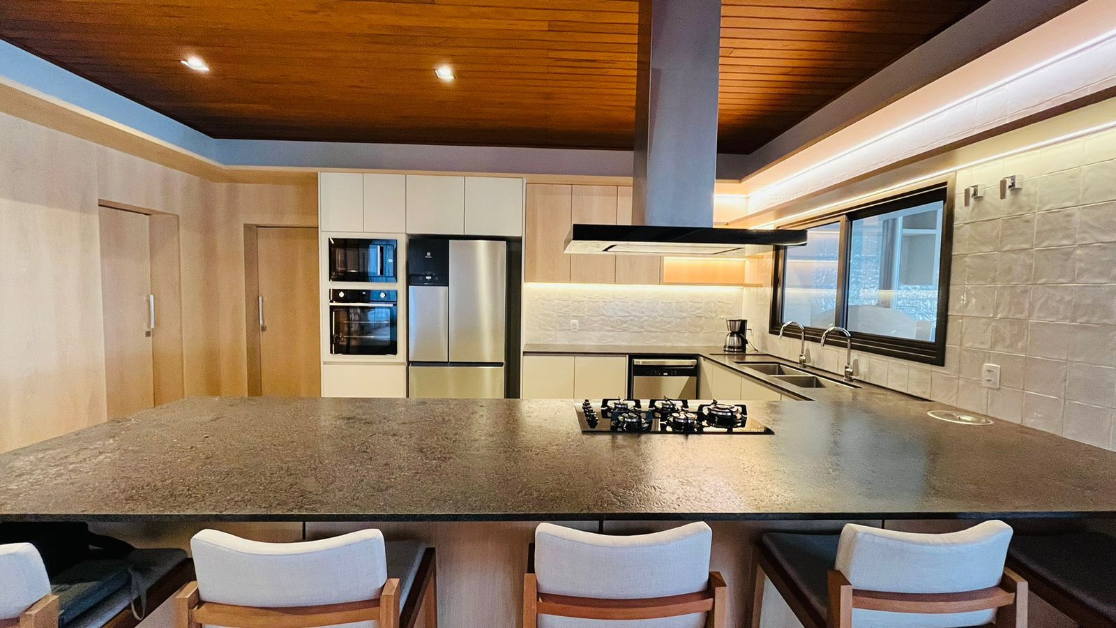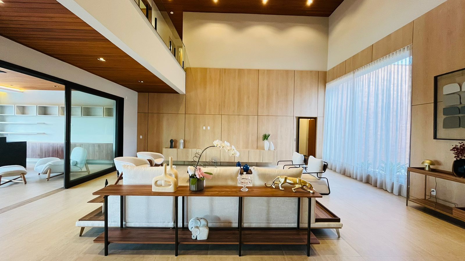 A área de convivência integrada inclui salas de estar, jantar, cozinha com ilha, despensa, lavabo e lavanderia. O imóvel dispõe de 7 dormitórios, sendo 6 suítes amplas e acessíveis, incluindo uma suíte master com closet e vista para a área verde. Conta ainda com quarto de empregada, banheiro, academia, sistema de energia padrão C5, torneiras e chuveiros monocomando, persianas automatizadas e telas mosquiteiras nos quartos e banheiros.