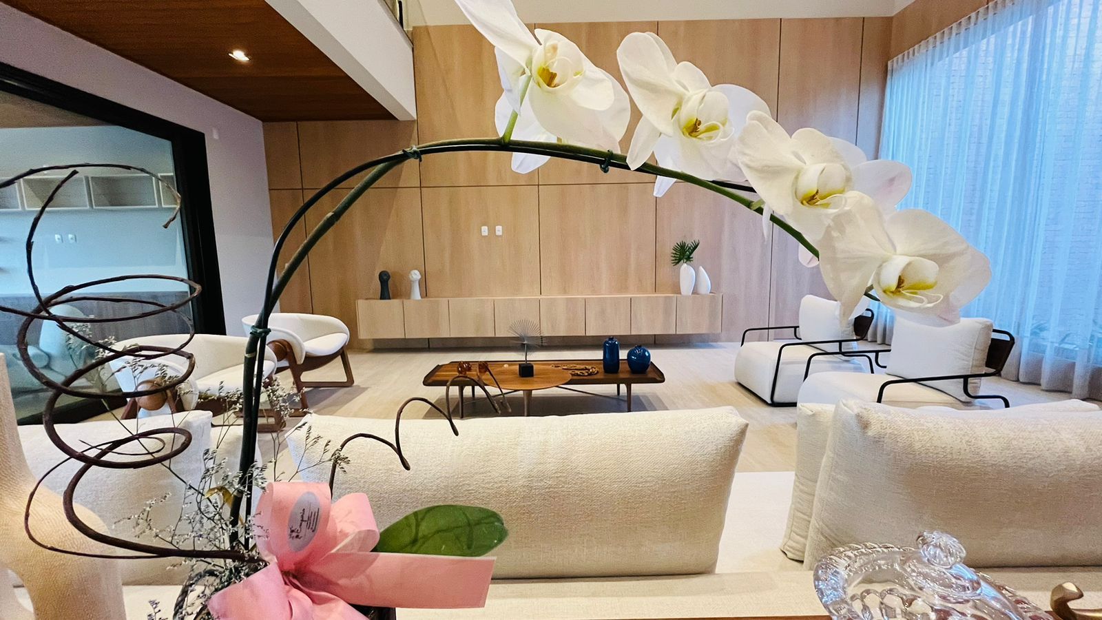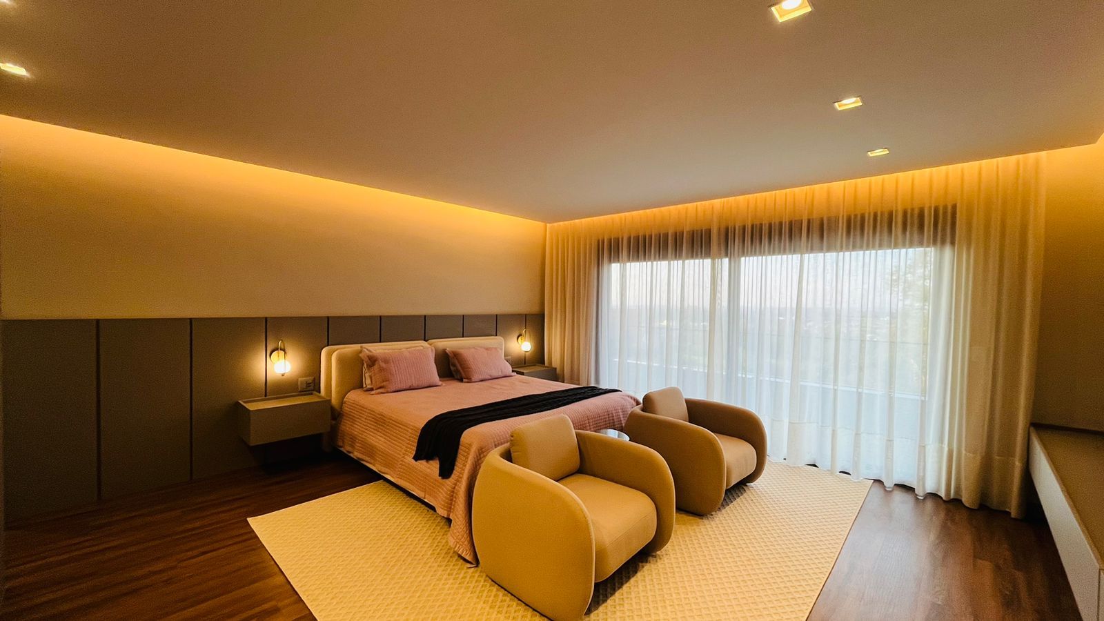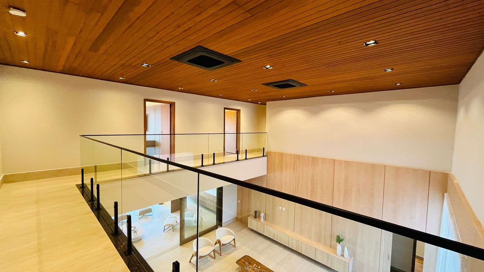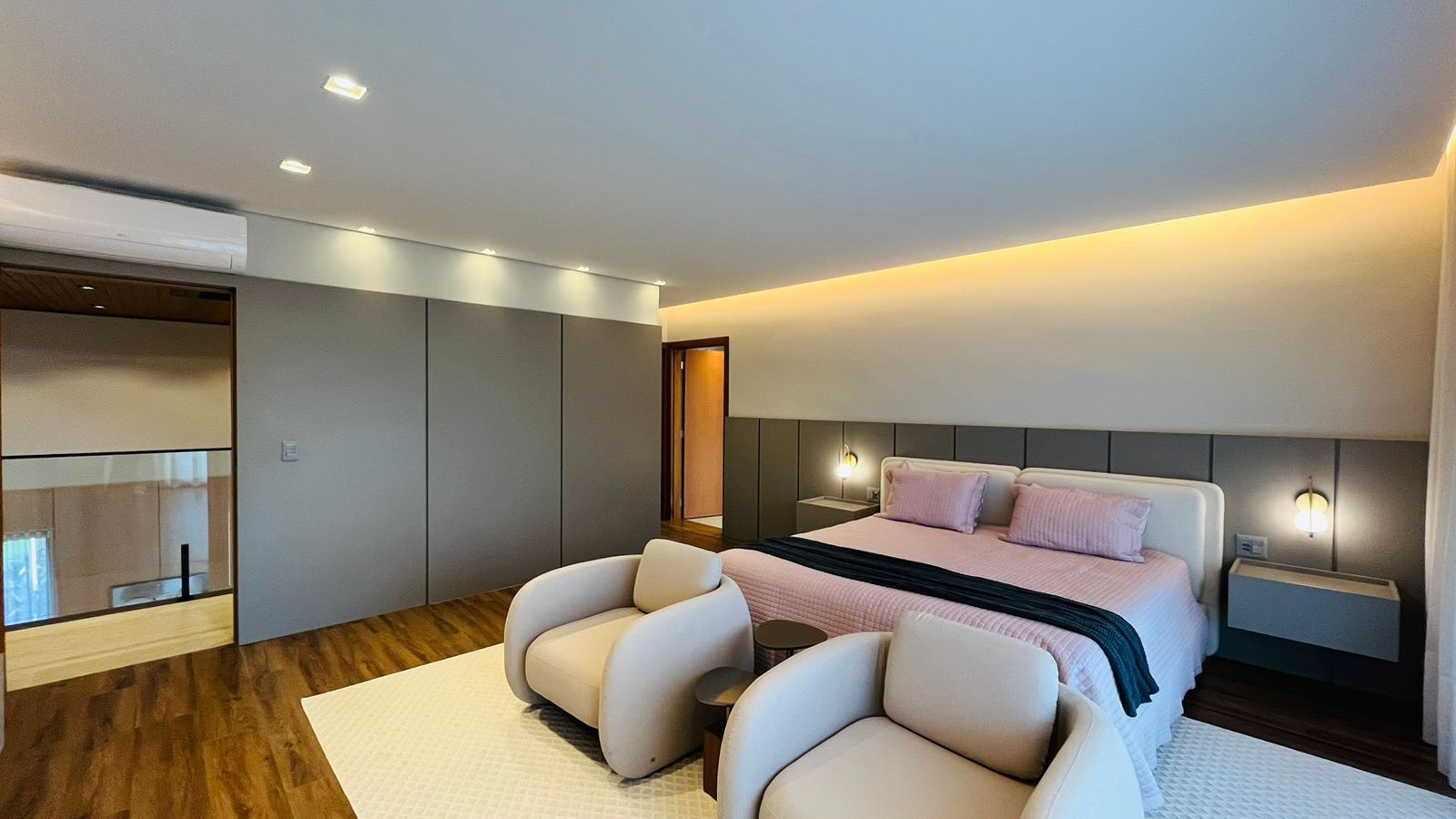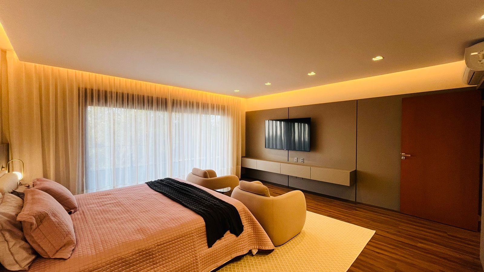 A área de convivência integrada inclui salas de estar, jantar, cozinha com ilha, despensa, lavabo e lavanderia. O imóvel dispõe de 7 dormitórios, sendo 6 suítes amplas e acessíveis, incluindo uma suíte master com closet e vista para a área verde. Conta ainda com quarto de empregada, banheiro, academia, sistema de energia padrão C5, torneiras e chuveiros monocomando, persianas automatizadas e telas mosquiteiras nos quartos e banheiros.